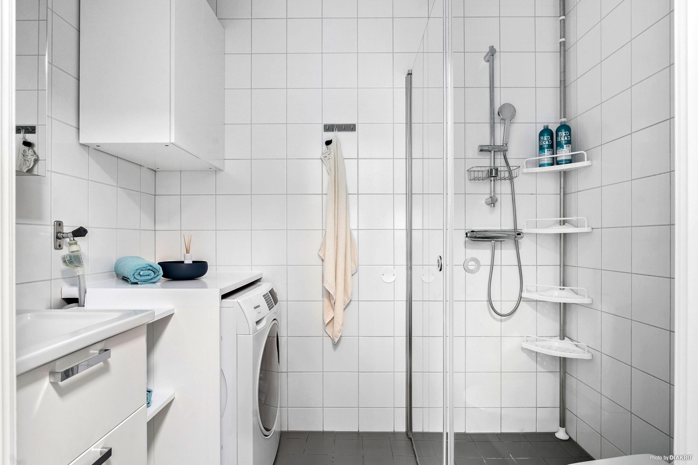 Det helkaklade badrummet har en yteffektiv planering som ger svängrum för badrum och klädvård. Snyggt och sobert med kakel och klinker i klassiska toner som kompletterar varandra utmärkt. Toalett, tvättställ med kommod, spegelskåp, golvvärme samt dusch med vikväggar. Tvätten tas smidigt om hand med assistans från den kombinerade tvättmaskinen/torktumlaren.