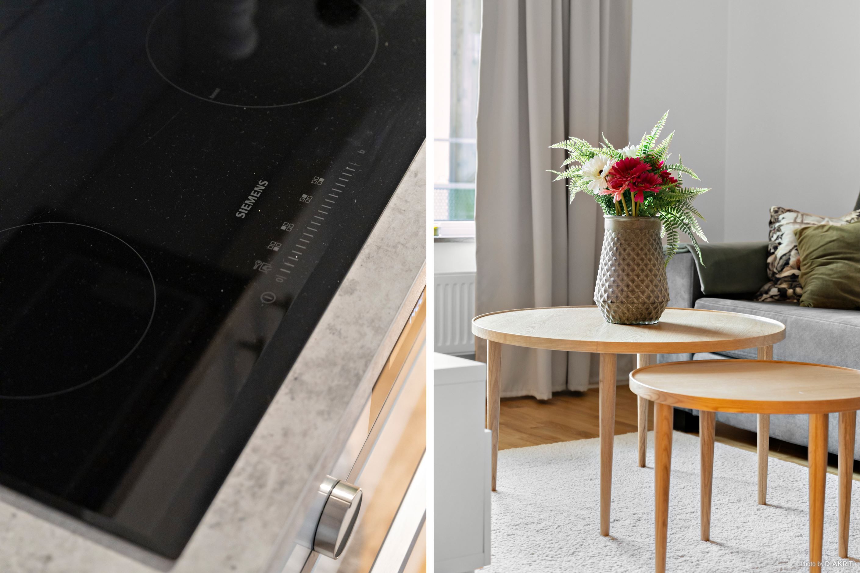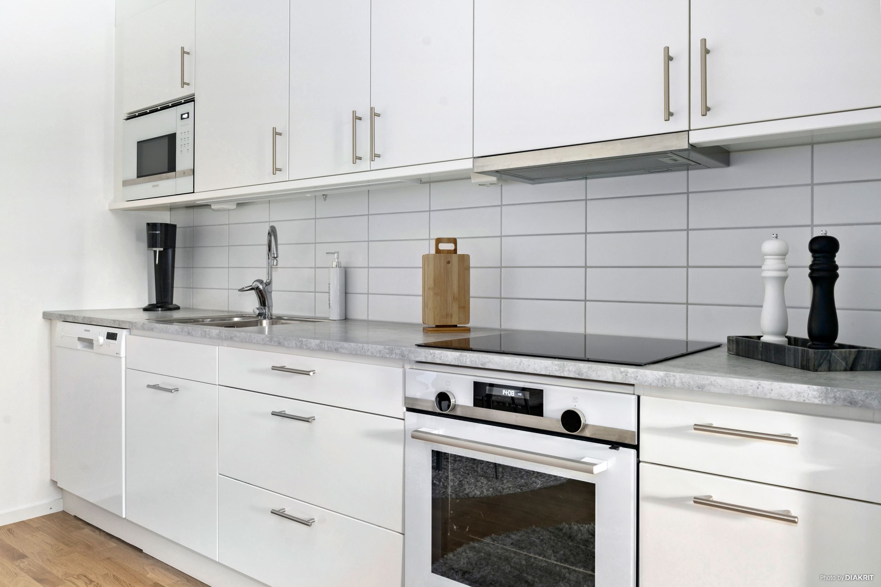 Vidare in har vi det smakfulla köket. Här finns bra med plats för både förvaring och matlagning. Smart planlösning som ger möjlighet för större matplats när det vankas middagsbjudningar. Öppet mot vardagsrummet för rymd, flexibilitet och samvaro. Här kan kocken få hjälp, goda råd, glada tillrop eller alltsammans och från soffa och matplats medan delikata måltider skapas.