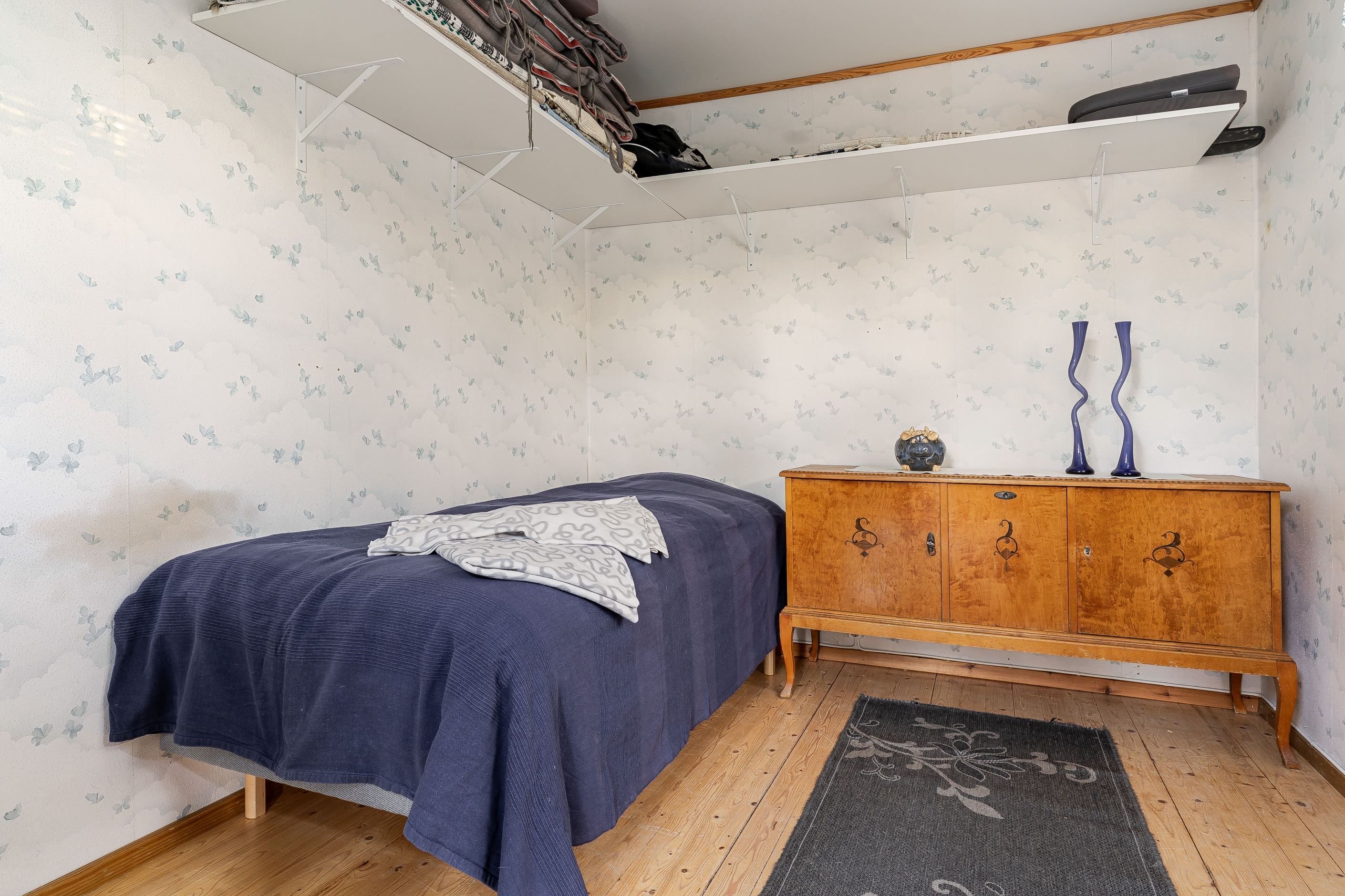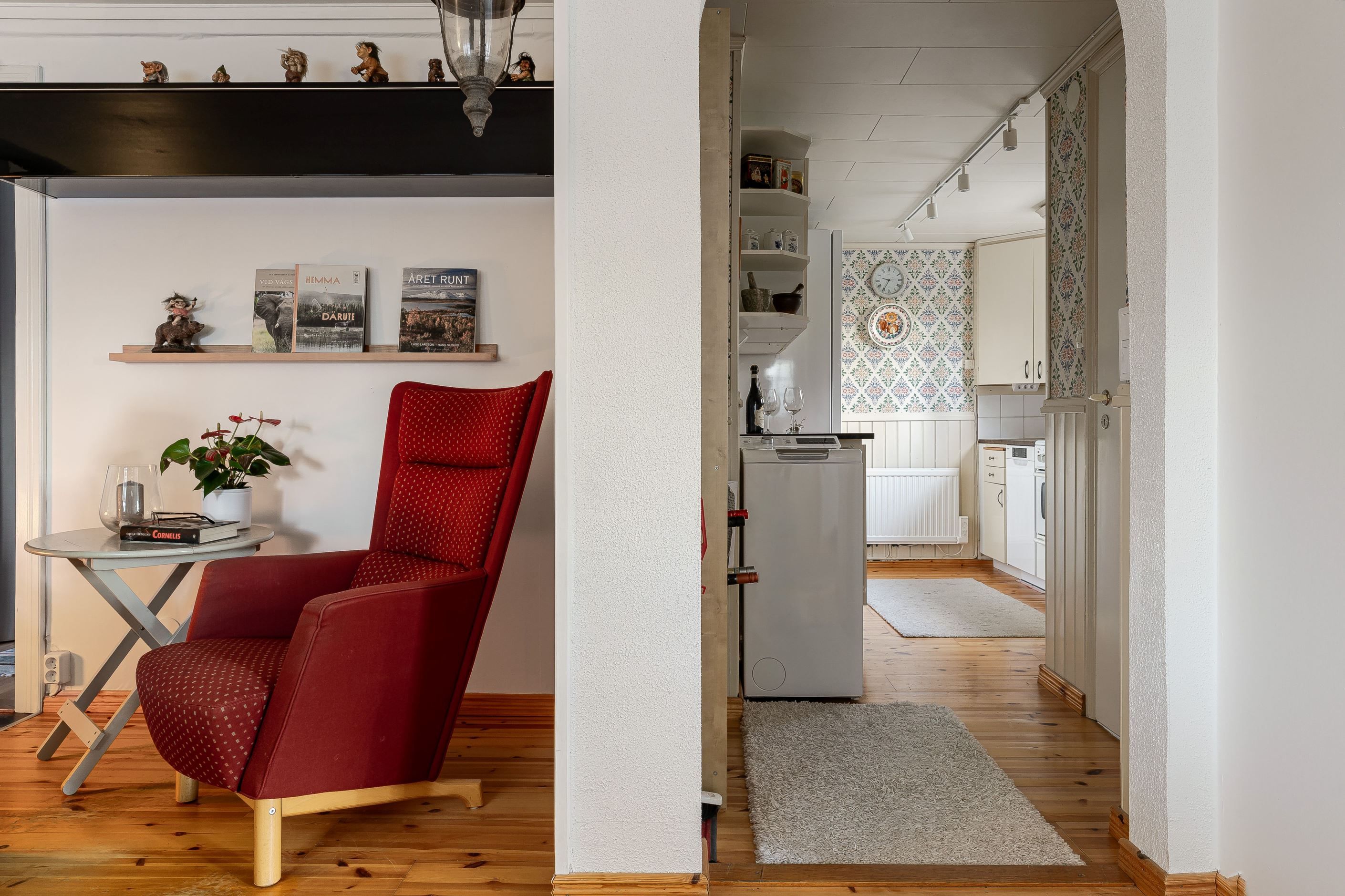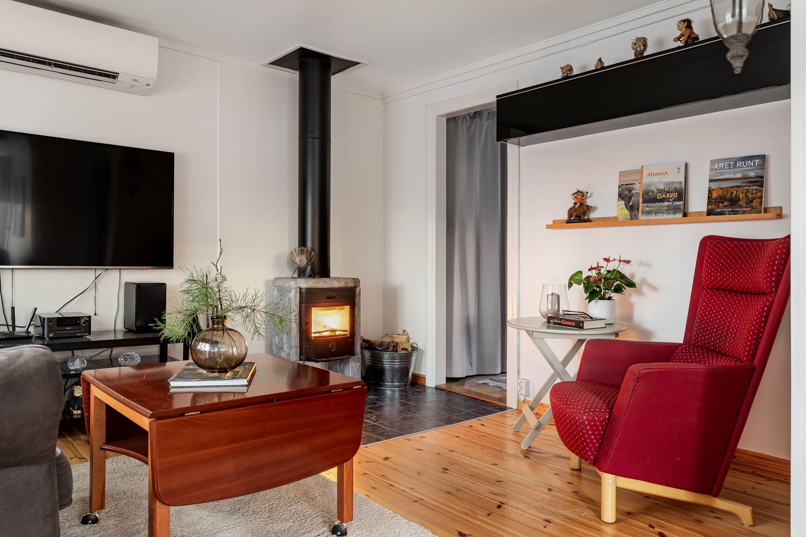 Bostaden rymmer kök utrustat med tvättmaskin, ett allrum med stämningsfull kamin, sovrum samt badrum med dusch och wc. Den stora trädgårdstomten bjuder på fina grönytor och goda möjligheter för både avkoppling och umgänge.
