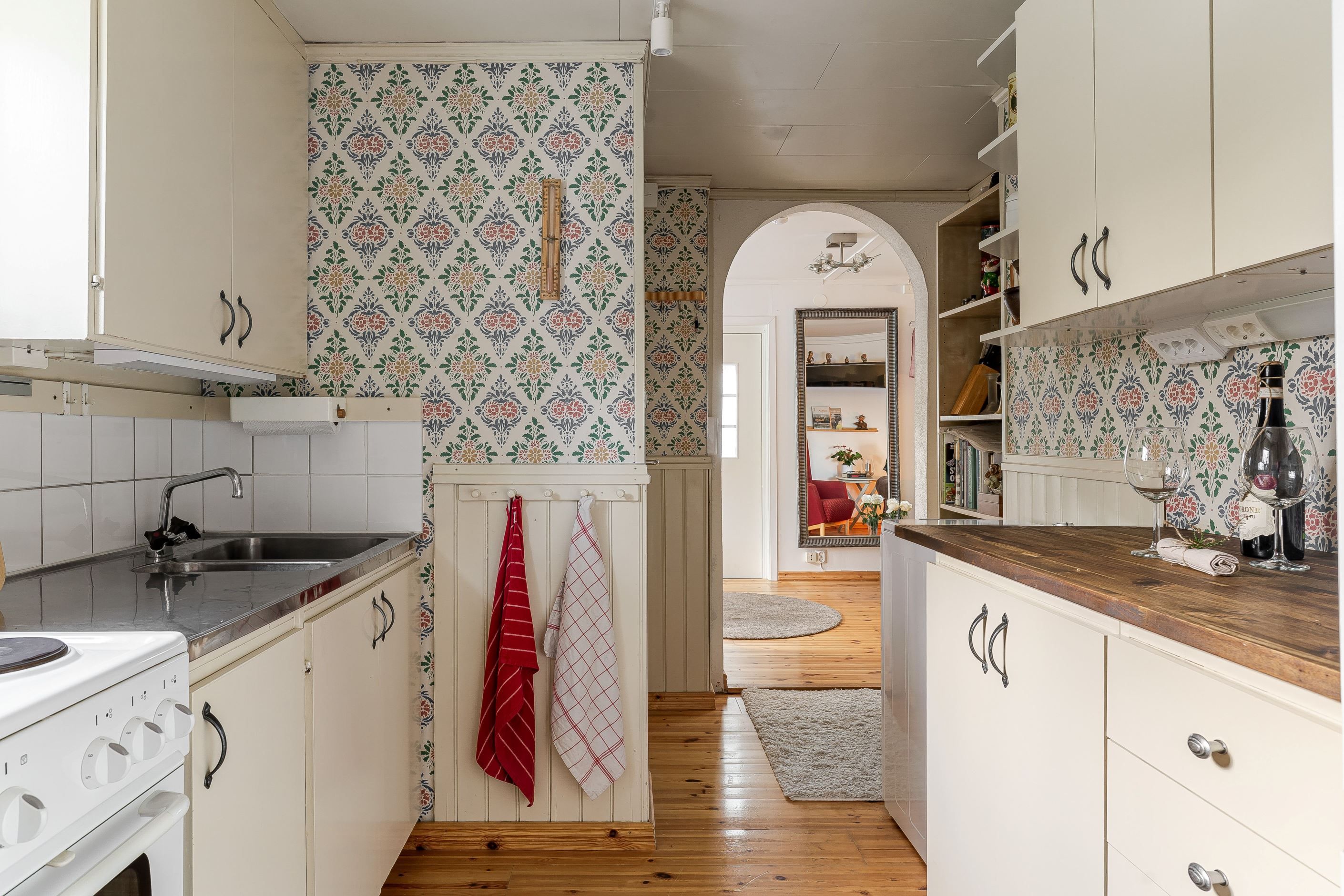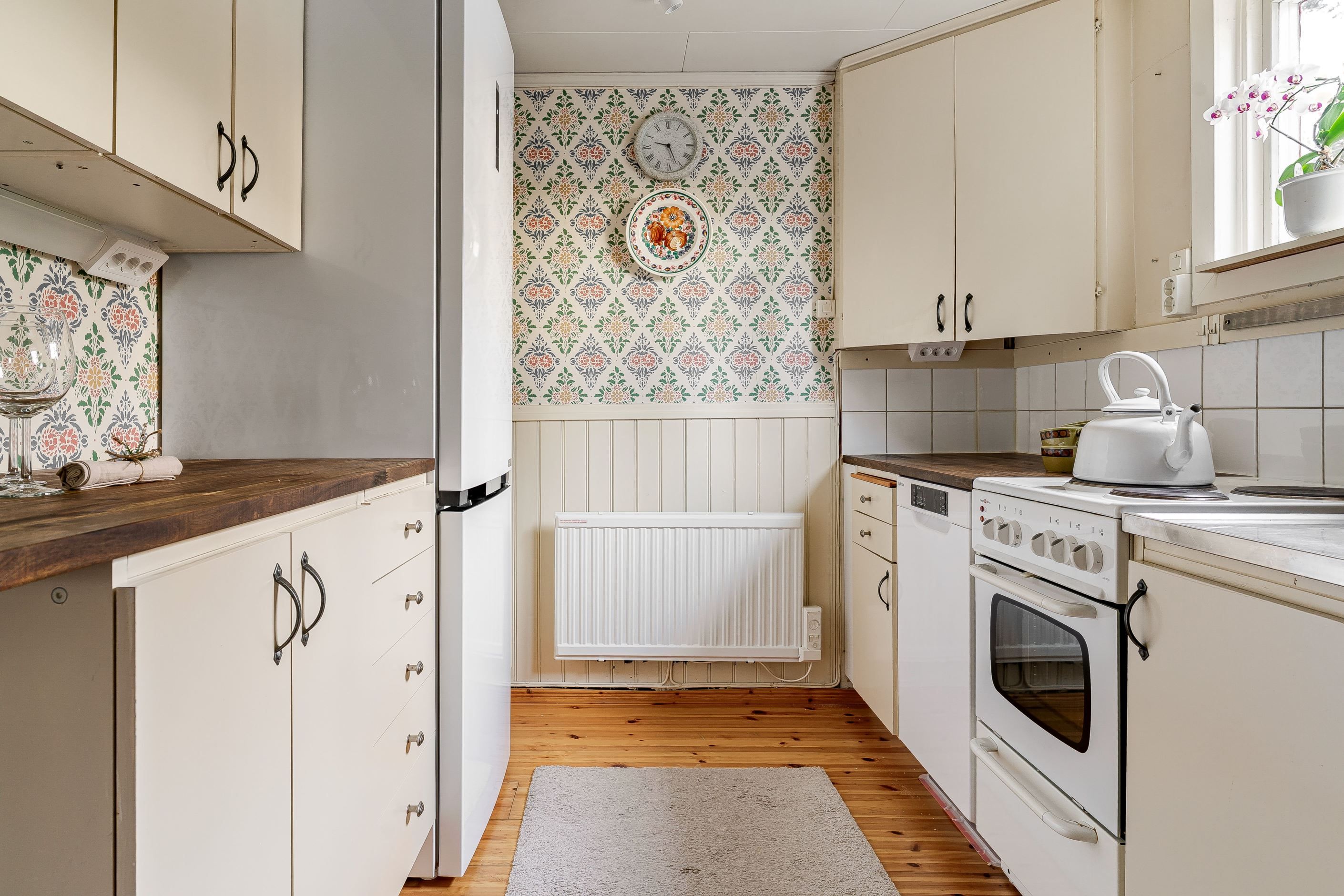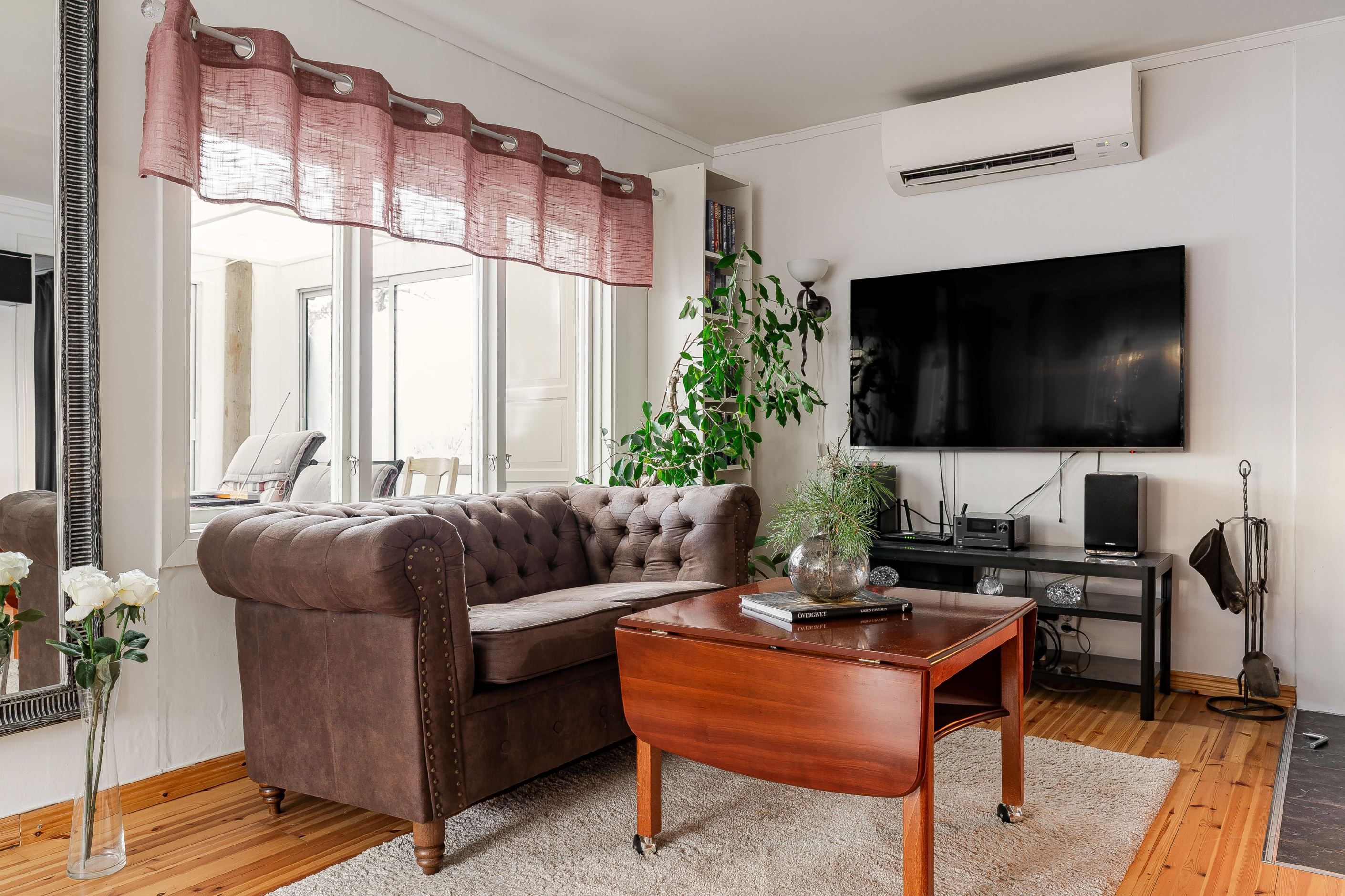 Bostaden rymmer kök utrustat med tvättmaskin, ett allrum med stämningsfull kamin, sovrum samt badrum med dusch och wc. Den stora trädgårdstomten bjuder på fina grönytor och goda möjligheter för både avkoppling och umgänge.