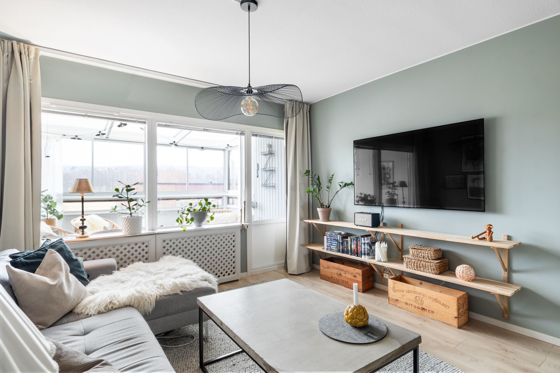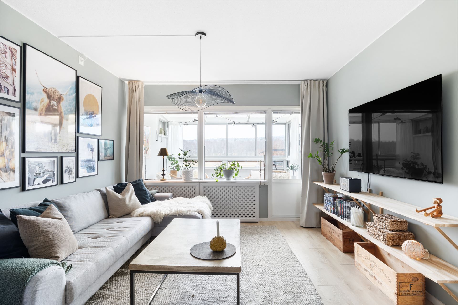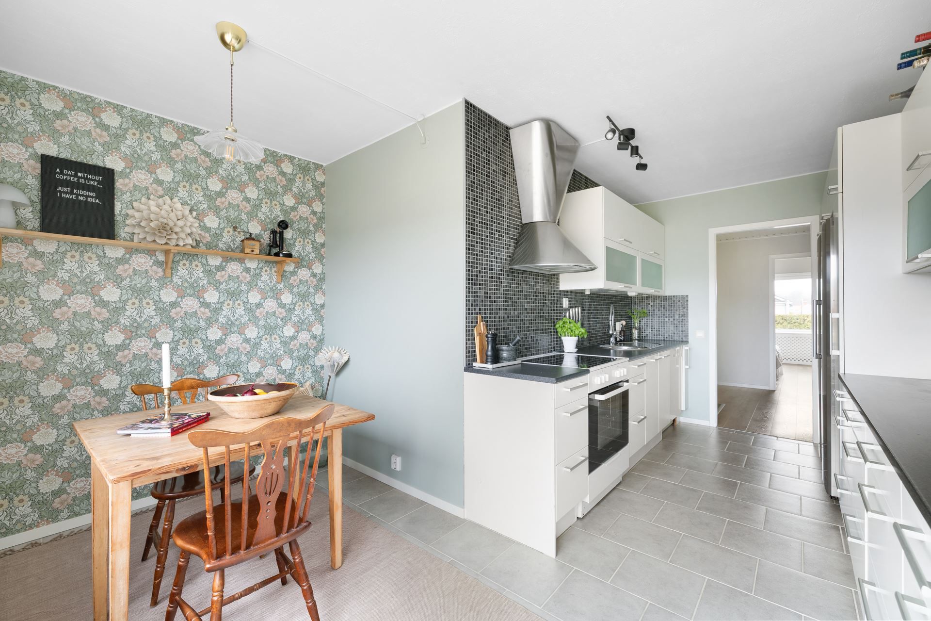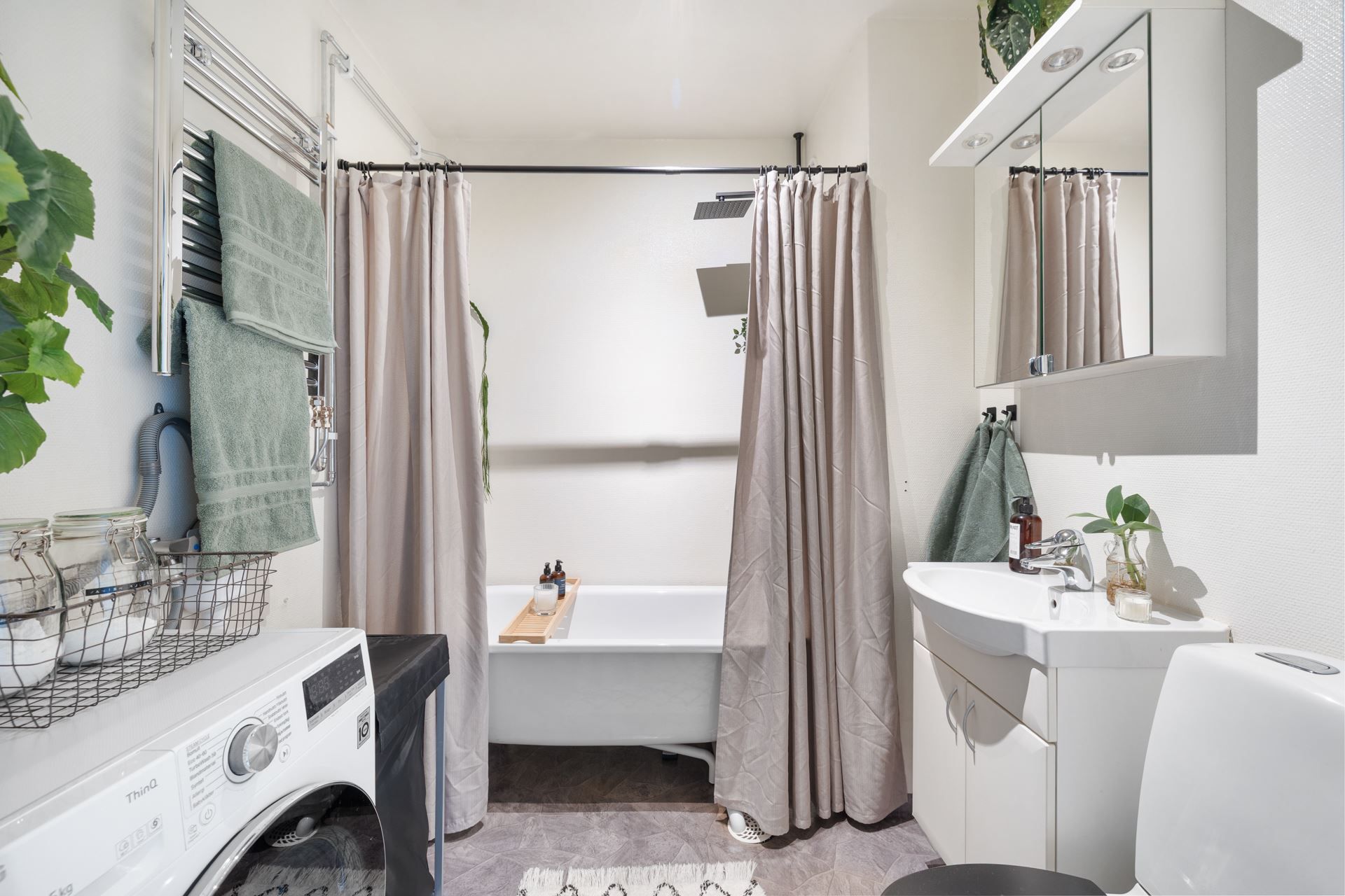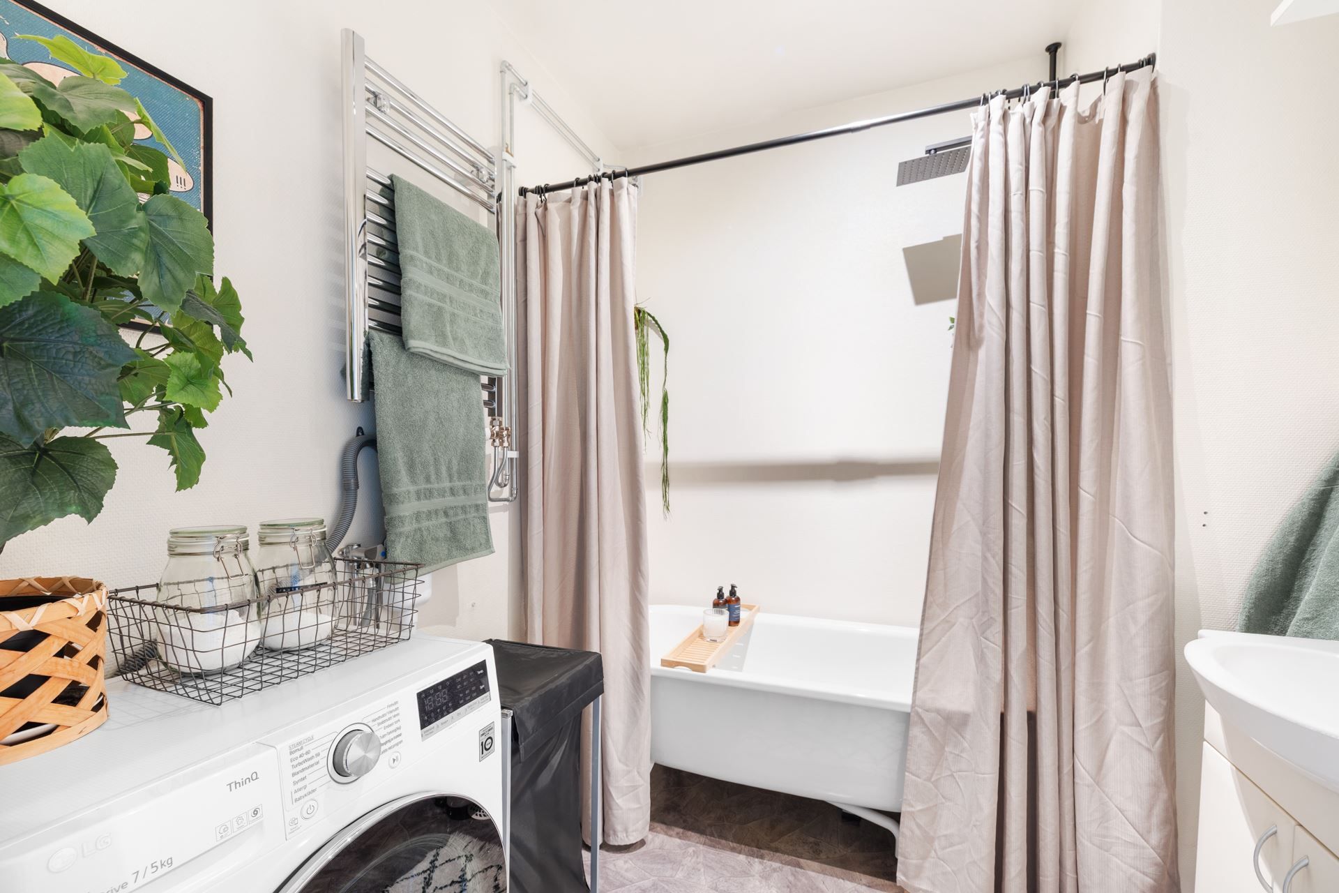 Hallen är välkomnande med vackert ljusinsläpp från två håll. Köket är funktionellt och välplanerat med gott om förvaring och arbetsytor. Naturlig matplats där hela familjen ryms. Vardagsrummet erbjuder gott om plats för både soffgrupp och umgänge, och den öppna känslan gör rummet lättmöblerat. Härifrån når du även balkongen, och genom fönstren får du utsikt mot grönska och föreningens aktivitetsytor. Badrummet är inrett i sobra toner, bjuder badkar och tvättmaskin som löser vardagstvätten ypperligt.