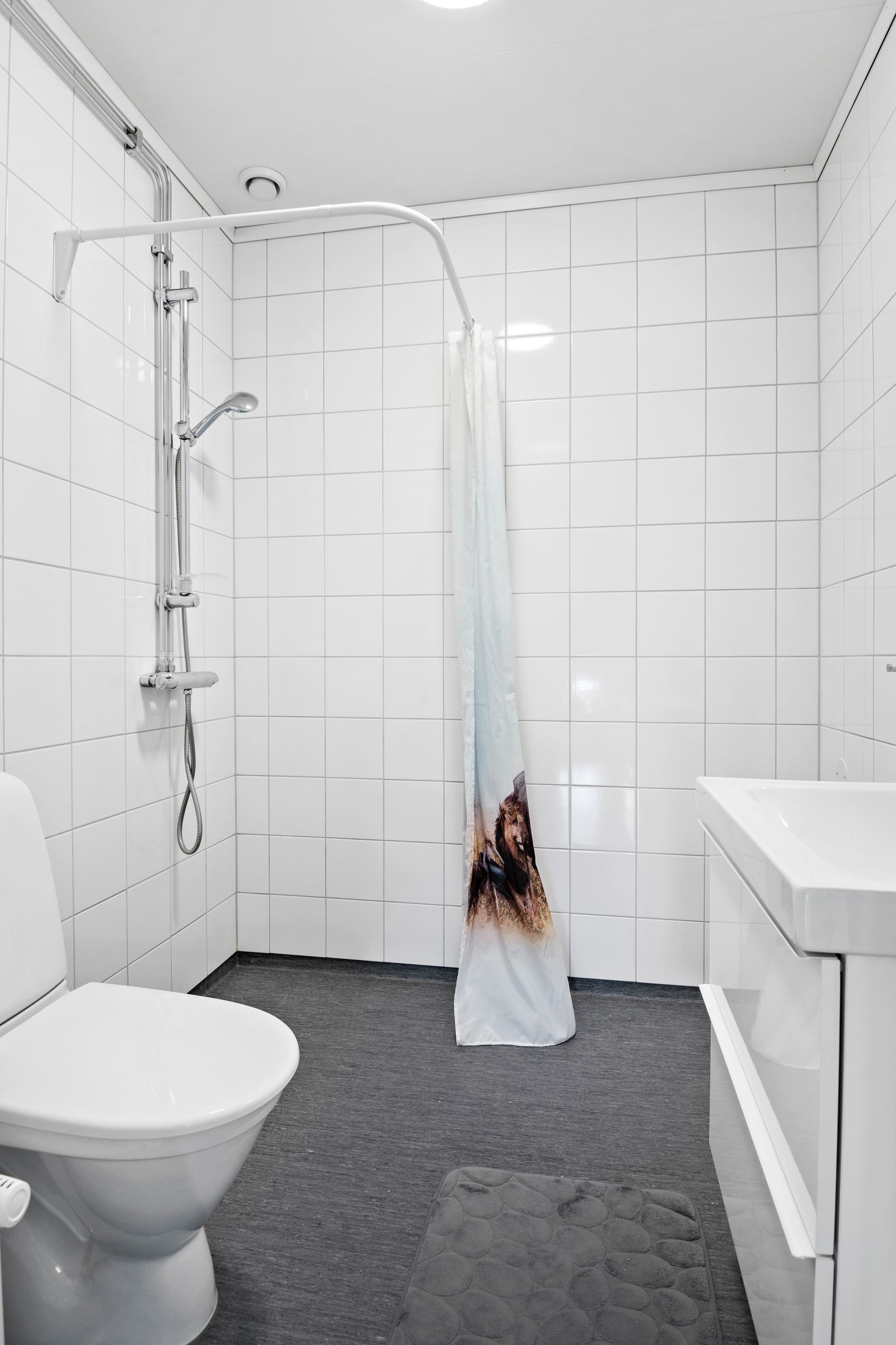 Inuti välkomnas du av en stor hall med gott om förvaringsutrymme och klädkammare samt teknikrum. Köket är ljust med fin utsikt och gott om skåp för förvaring. Vardagsrummet är luftigt och har utgång till baksidan där du finner en terrass i soligt läge. På nedre plan finns även ett badrum med dusch och tvättmöjligheter. Praktiskt förråd under trappen.