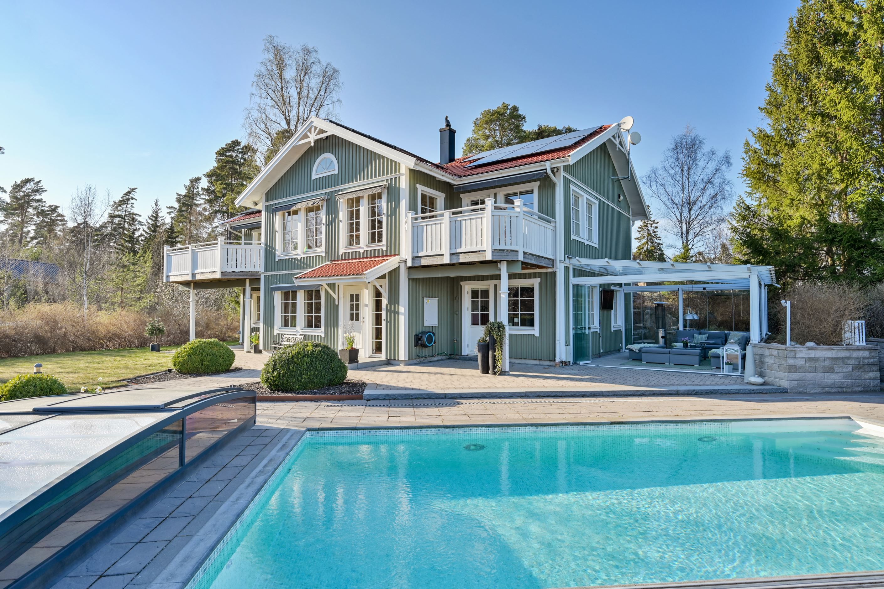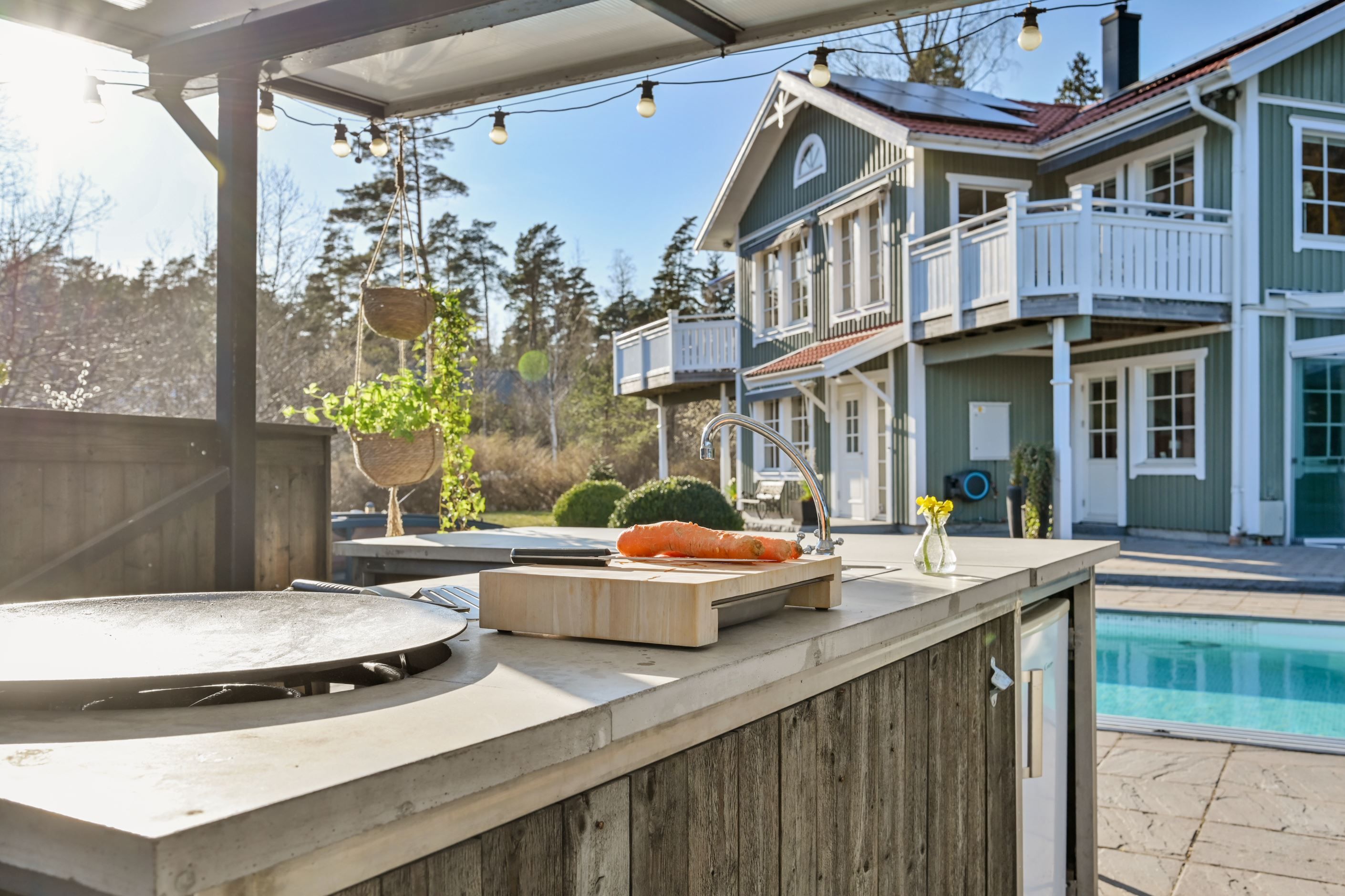 Den genomtänkta trädgården är en oas för alla årstider. Här finns en gjuten pool (4x8 meter) med tak, vilket förlänger badsäsongen, samt en utedusch med både varmt och kallt sommarvatten. Det inglasade uterummet med vikbara glasdörrar och blir en självklar samlingspunkt under årets varmare månader, medan det stilfulla uteköket under tak – utrustat med dubbla kylskåp, Muurika-grill med gasol, Napoleon-kokplatta och grill samt både kall- och varmvatten – gör grillkvällarna och sommarfesterna till något alldeles extra. Hela uteköket kan stängas med tältpresenning med fönster.