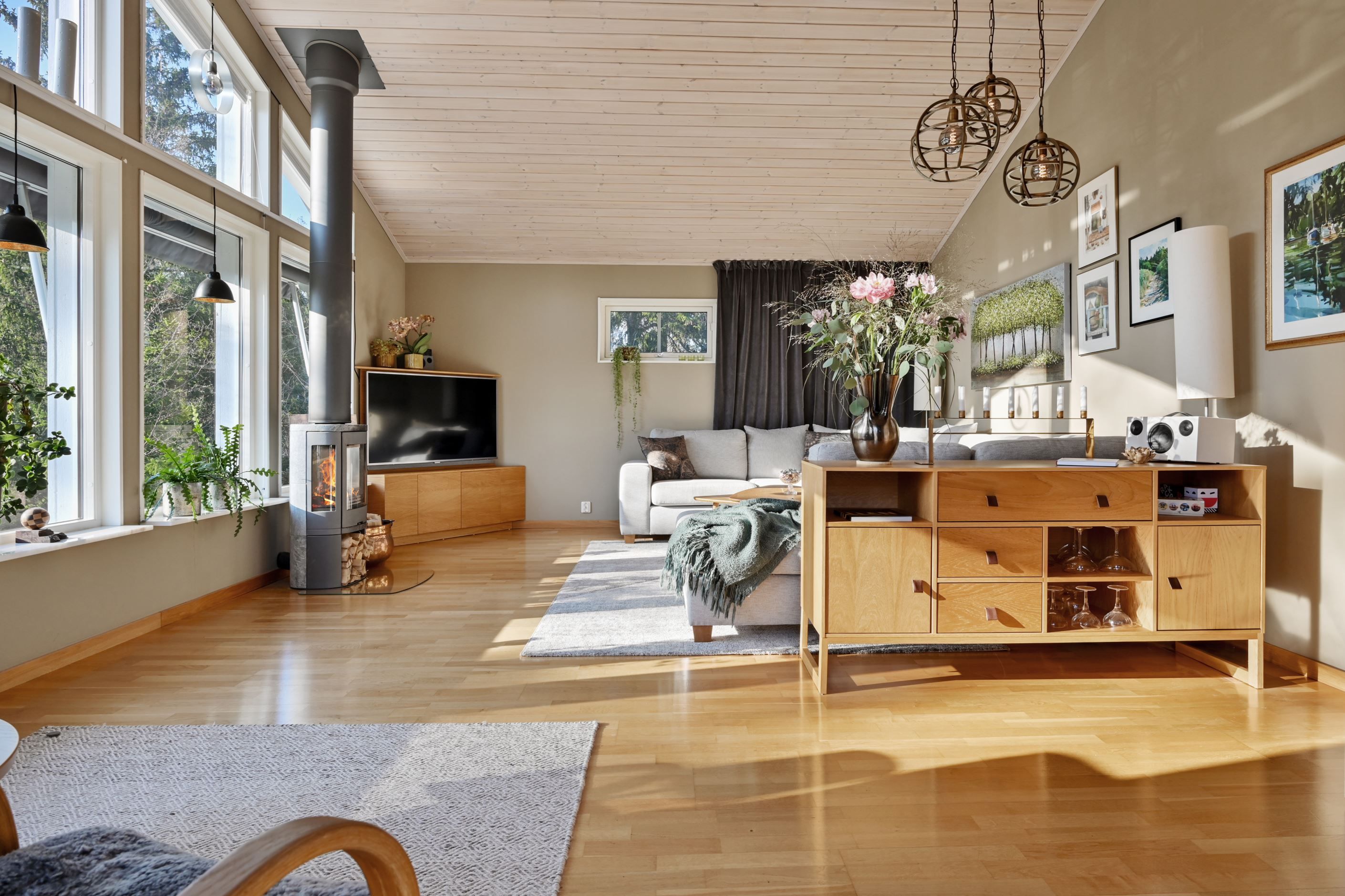 På övre plan möts du av ett Vedum kök med generösa arbetsytor och en matplats som badar i ljus från fönster i tre väderstreck. Det angränsande vardagsrummet präglas av en imponerande takhöjd på 3,6 meter och stora fönster som skapar en känsla av rymd och ljus. Här finns en platsbyggd tv-hörna och en vacker täljstenskamin som ger extra mysfaktor. Från vardagsrummet kliver du ut på en balkong med markis – en perfekt plats att njuta av omgivningarna och se ut över uteplatsen och trädtopparna.