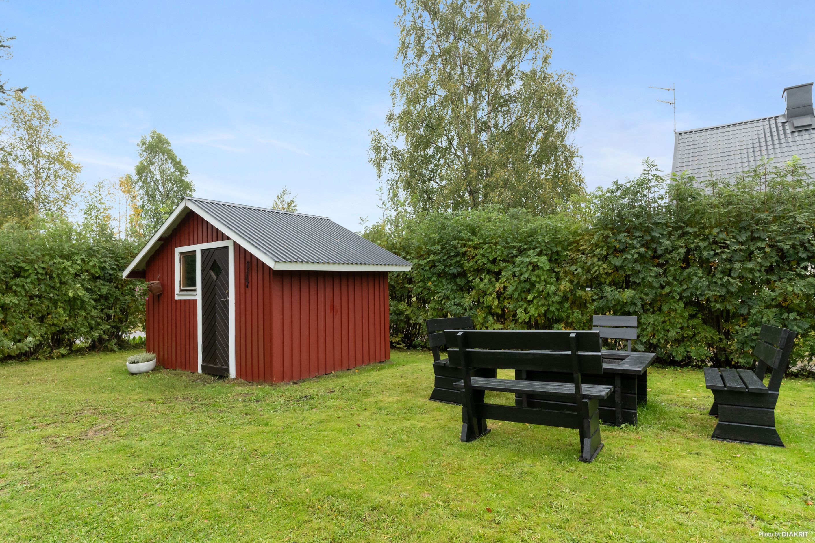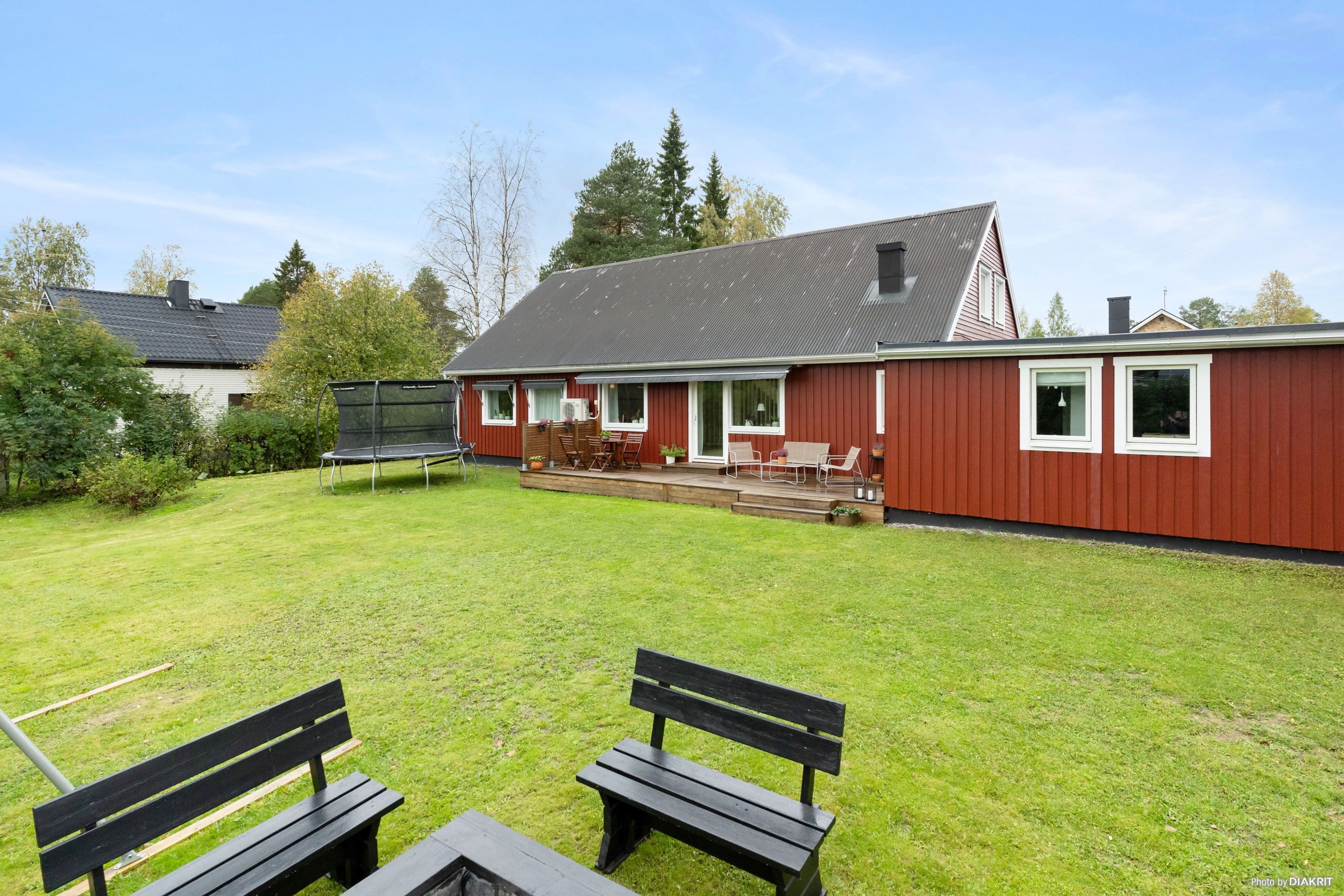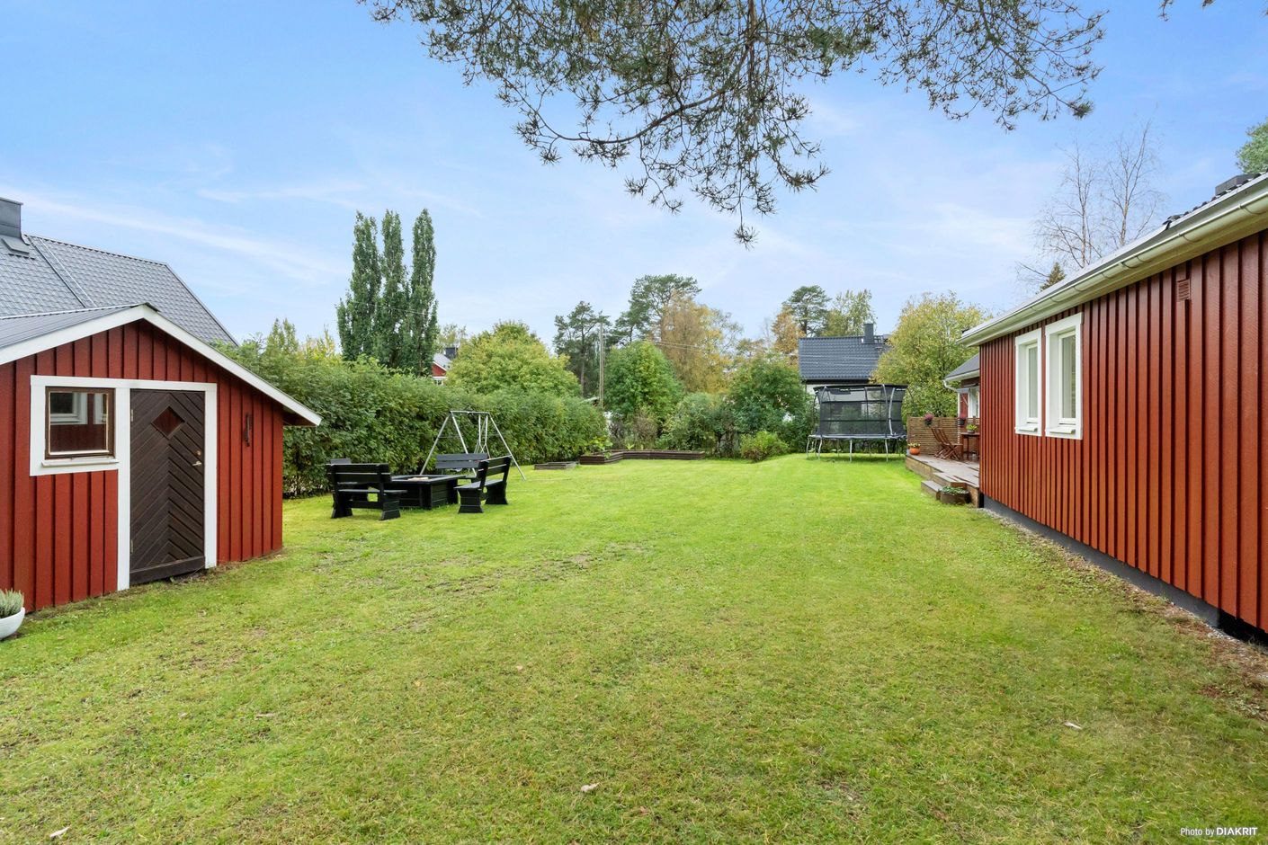 Husets uteplats har perfekt solläge och gott om gräsyta för lek och spel. Här finns även en eldstad samt att du är bra insynsskydd från häcken. (Se google maps streetview).