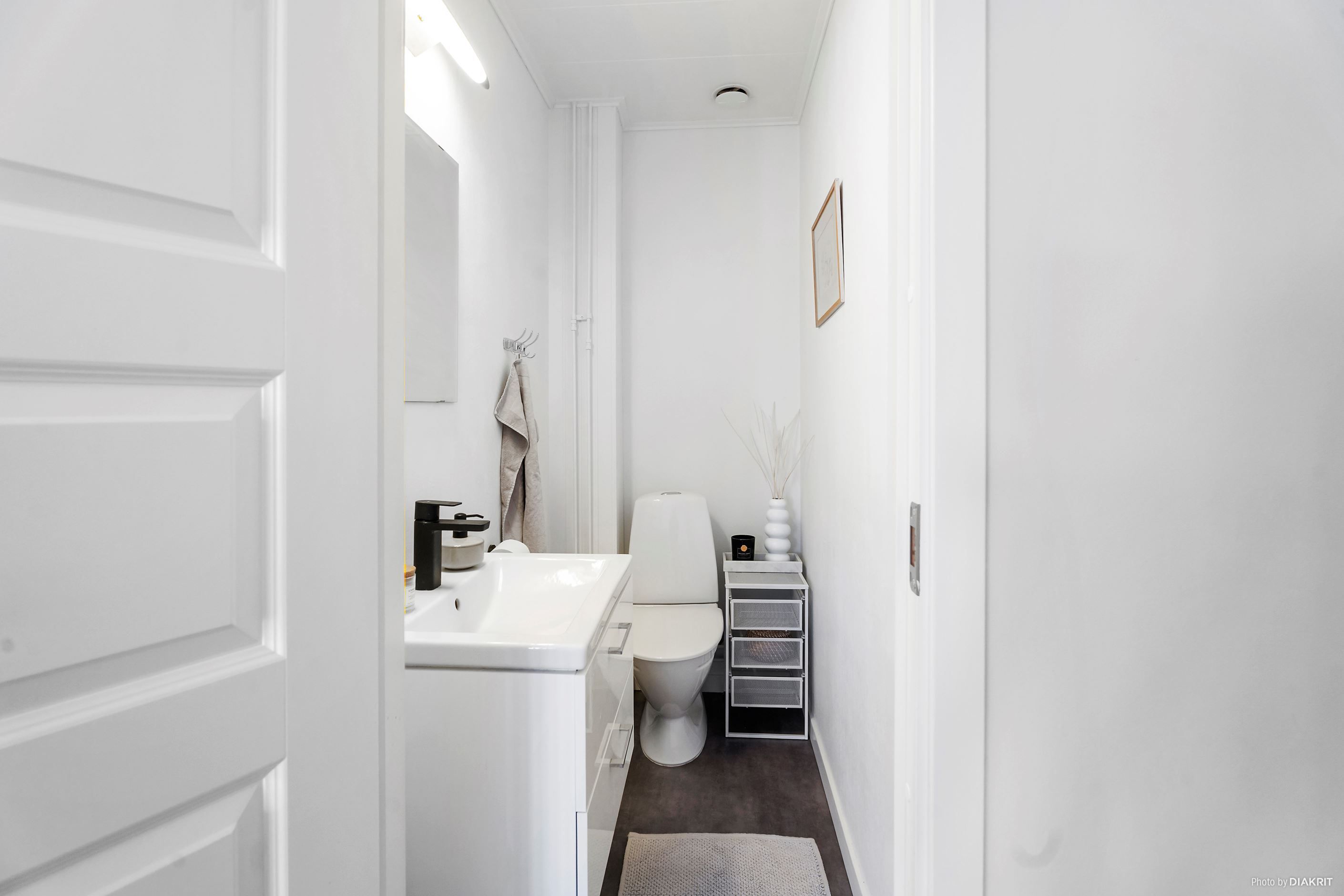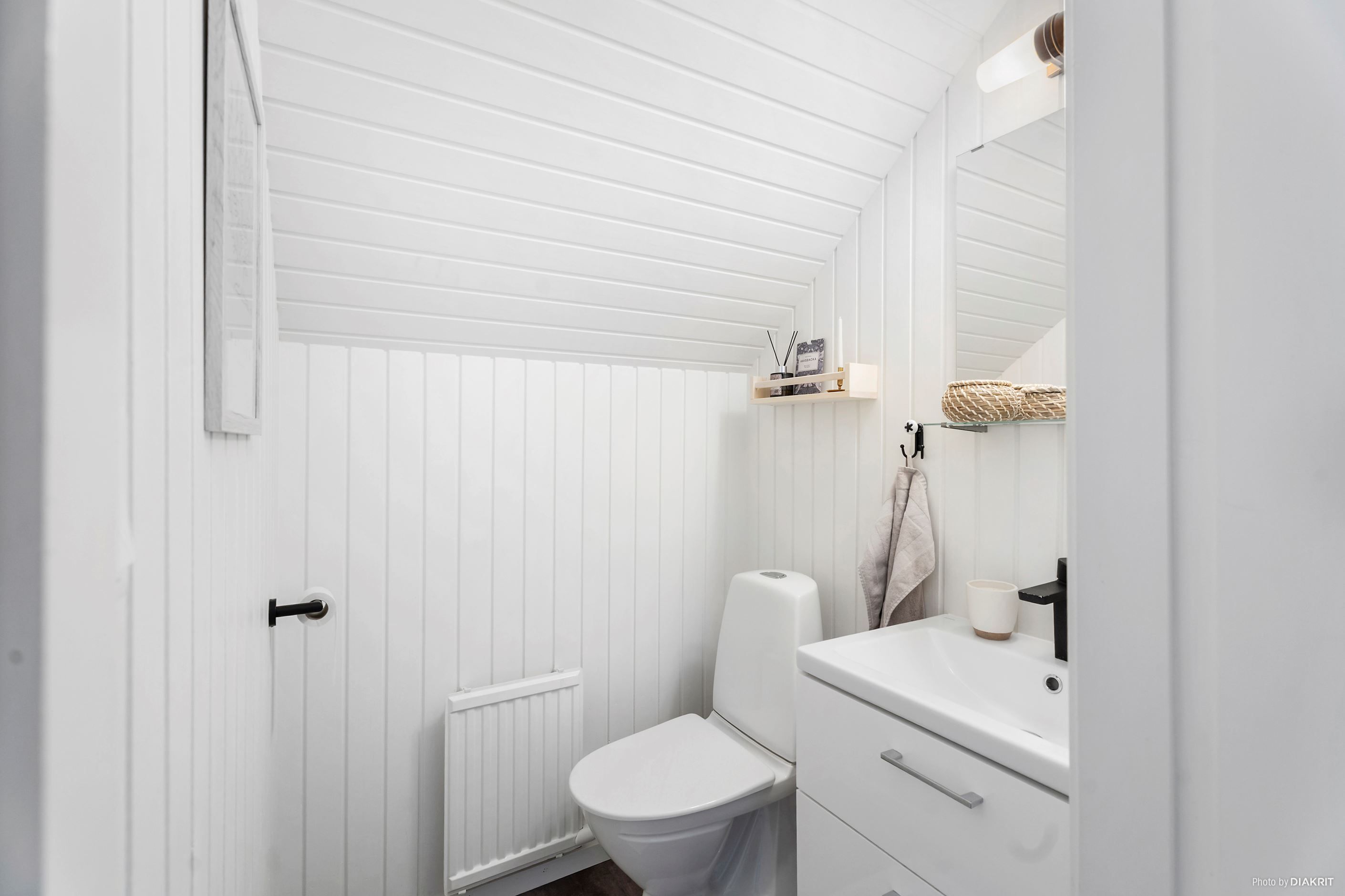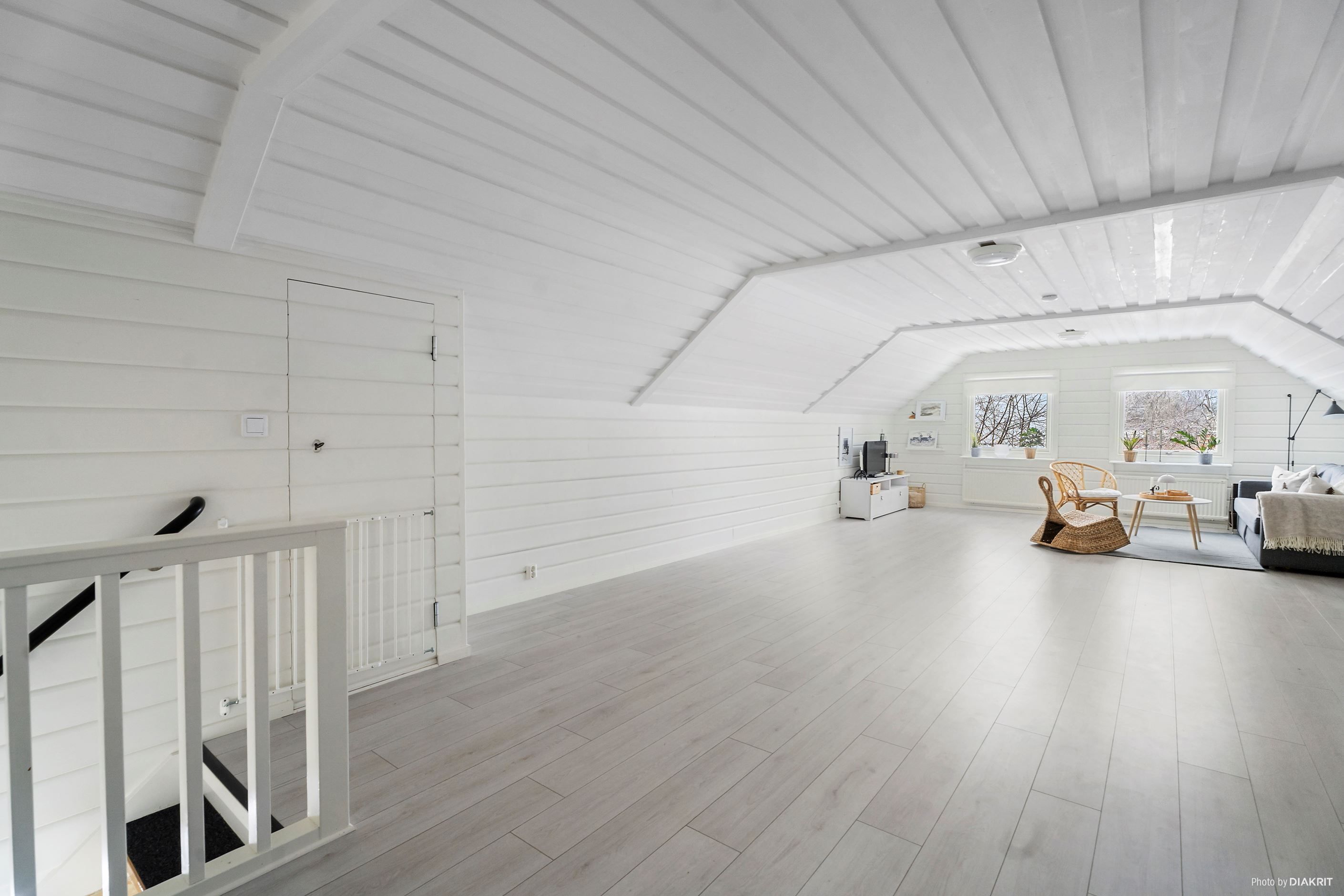 På entréplanet finner du även ett nyrenoverat badrum med badkar, WC och en praktisk tvättstuga med förvaringsutrymmen. På övre plan möts du av ett ljust och öppet allrum med generös yta. Här väntar även ett ljust sovrum och en WC.