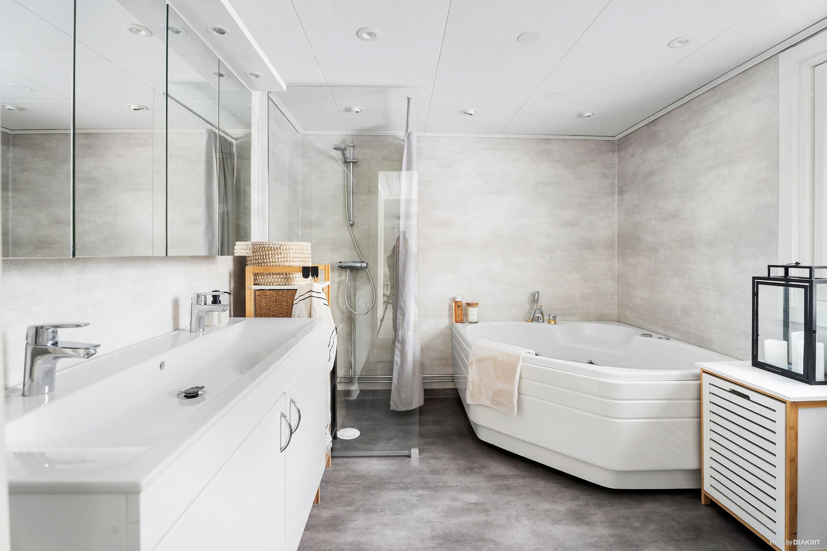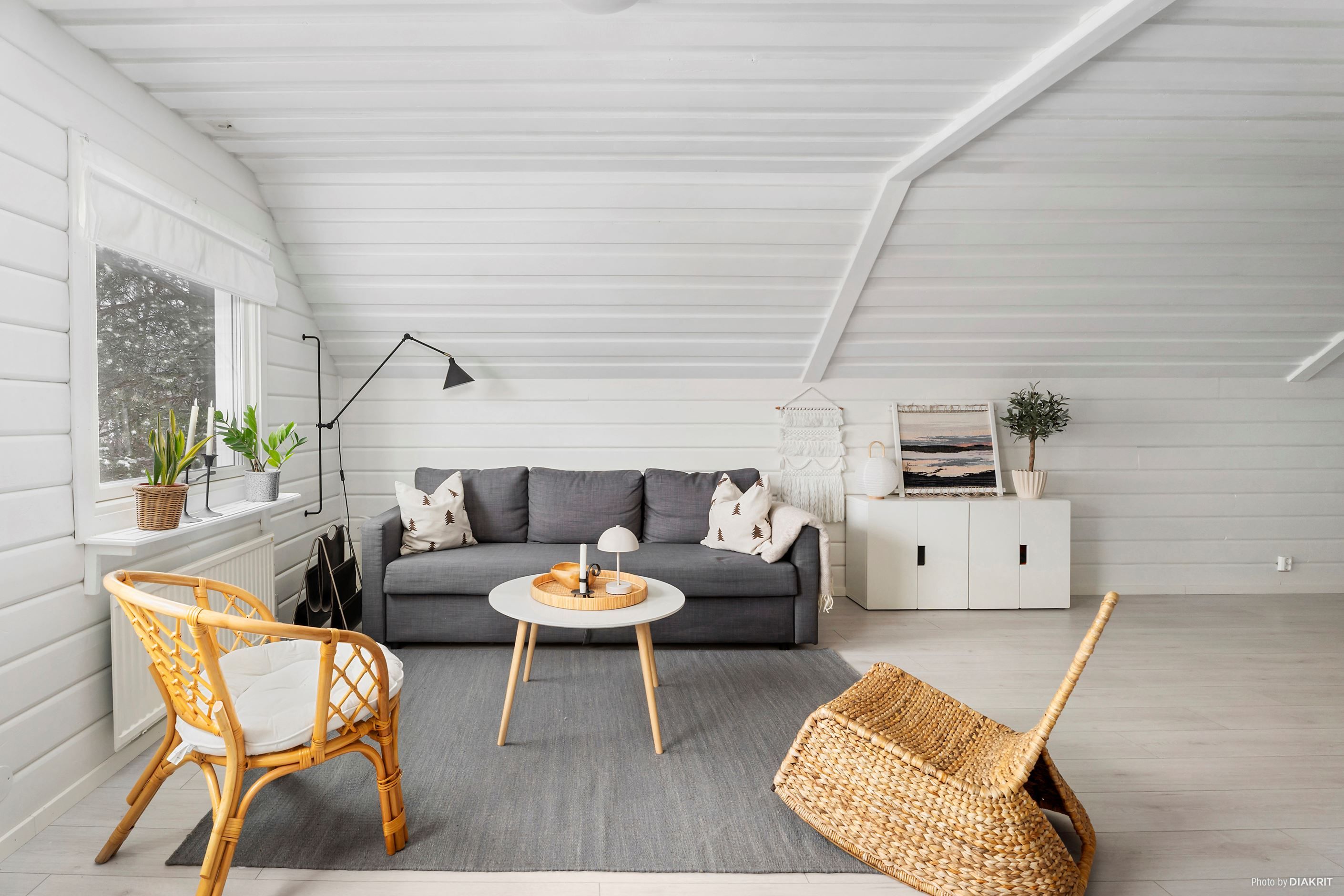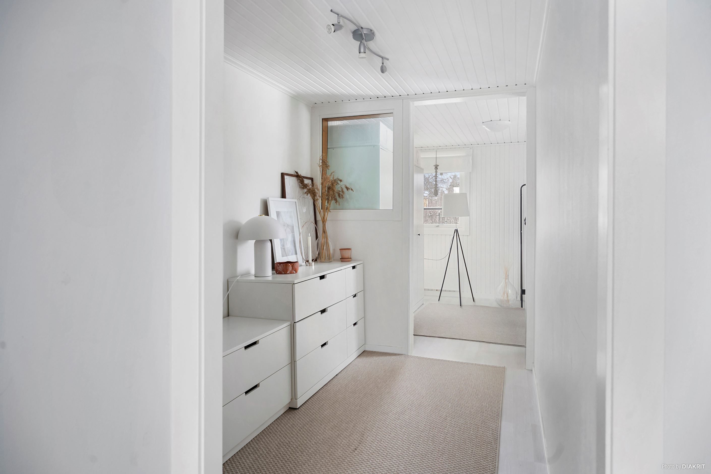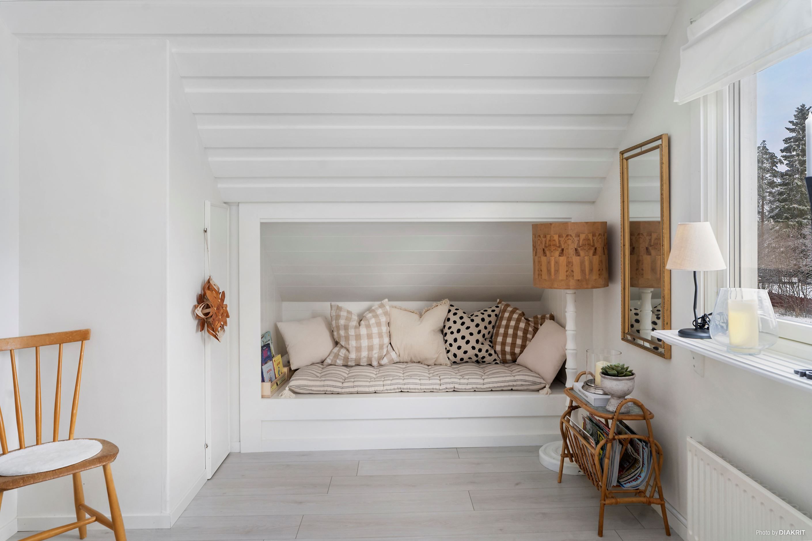 På entréplanet finner du även ett nyrenoverat badrum med badkar, WC och en praktisk tvättstuga med förvaringsutrymmen. På övre plan möts du av ett ljust och öppet allrum med generös yta. Här väntar även ett ljust sovrum och en WC.