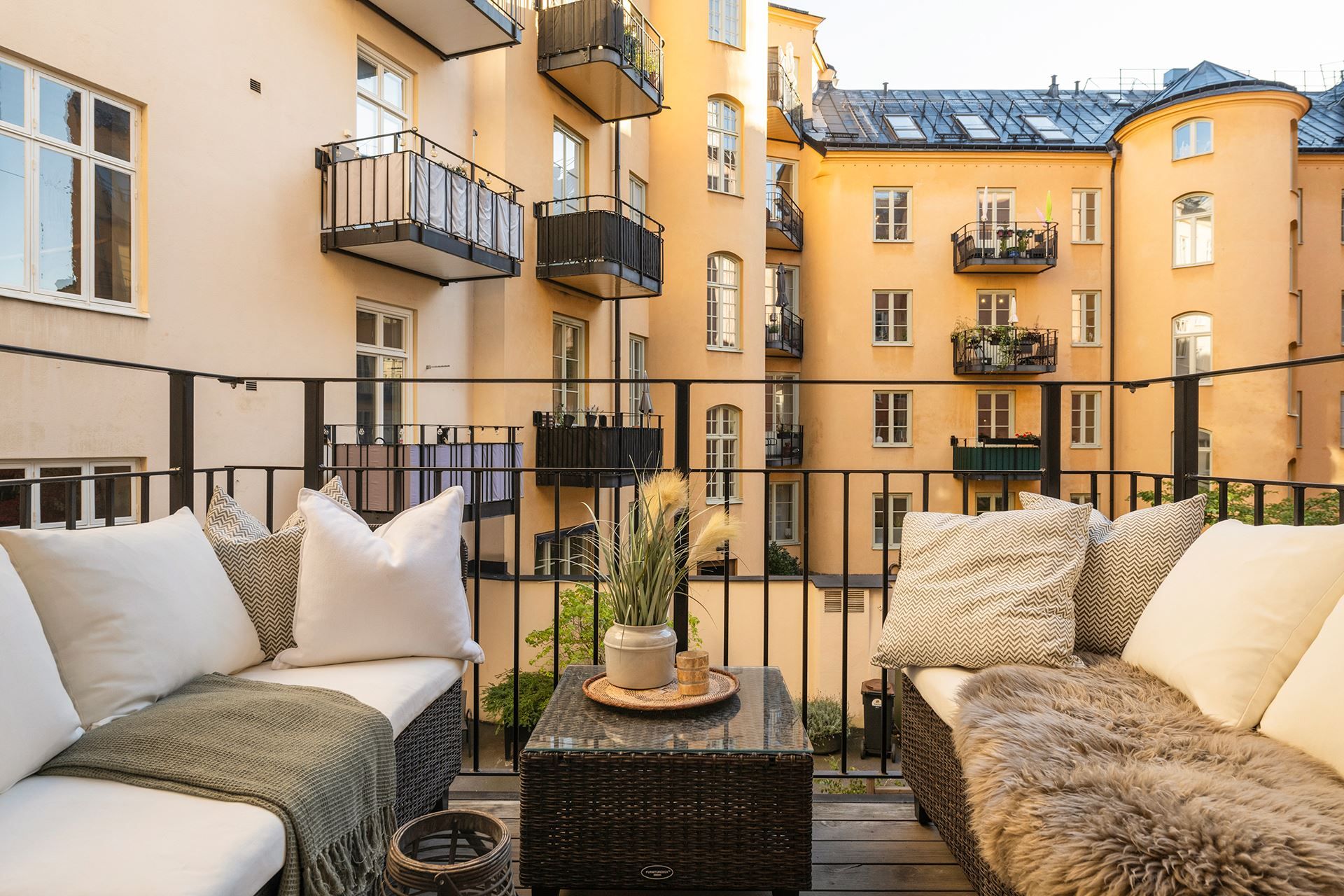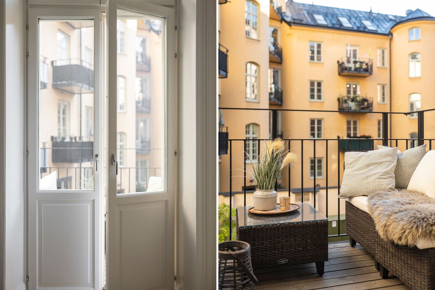 Köket är stilrent och funktionellt, med direkt utgång till en charmig balkong mot den lugna innergården – en underbar plats för morgonkaffet eller med sällskap.