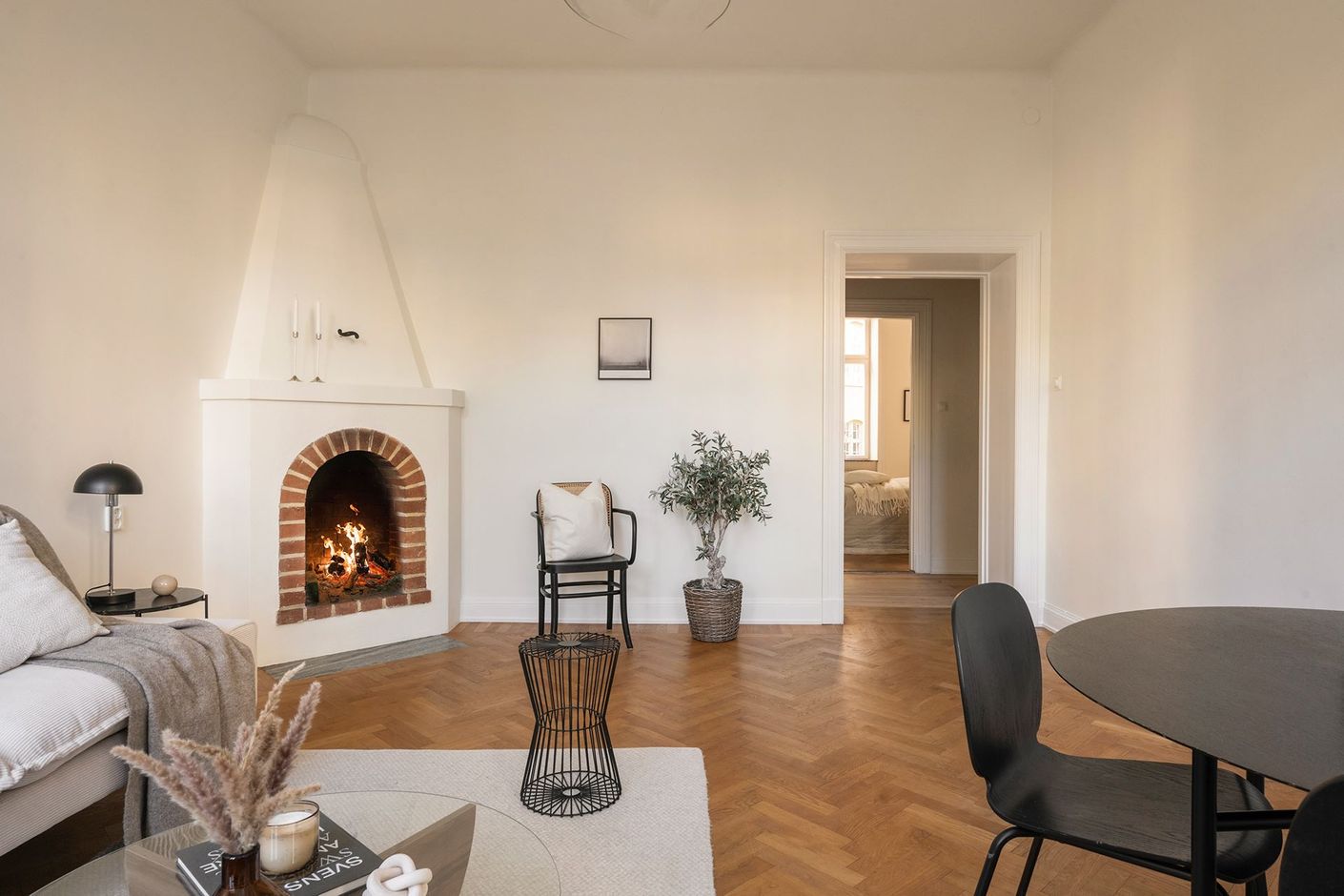 Lägenheten har en genomgående planlösning som ger ett harmoniskt flöde och skapar en både inbjudande och praktisk boendemiljö. Vardagsrummet ramas in av den öppna spisen och ger en känsla av tidlös elegans – perfekt för såväl avkoppling som sociala kvällar.