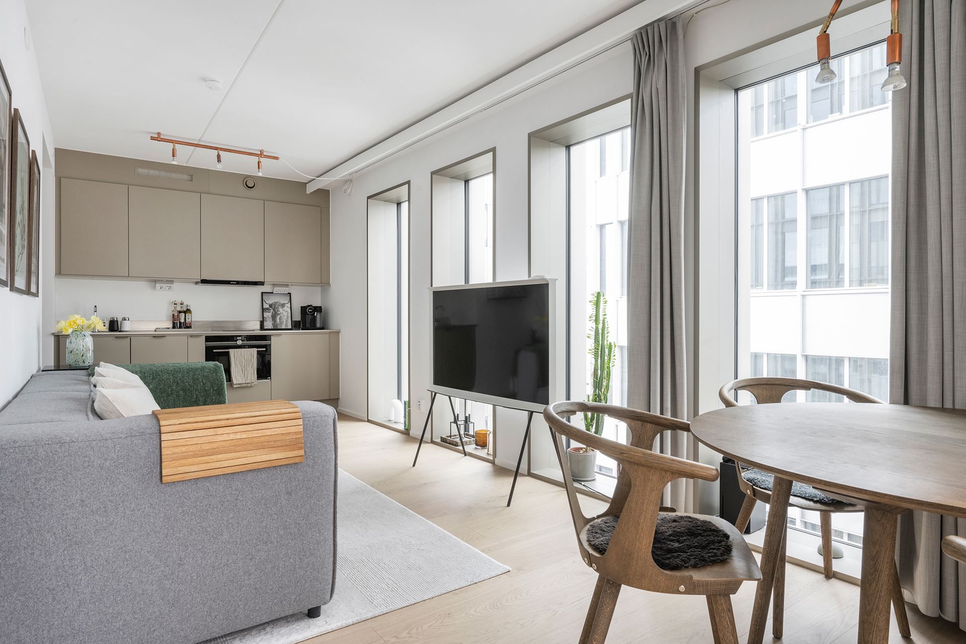 Arkitektritad hörnbostad med fri uthyrning på våning 10. Här erbjuds en unik möjlighet för ägande som juridisk person eller privatperson att bedriva uthyrning av bostadsrätten, detta oberoende av styrelsens godkännande. Många köper även för eget eller anställdas boende.