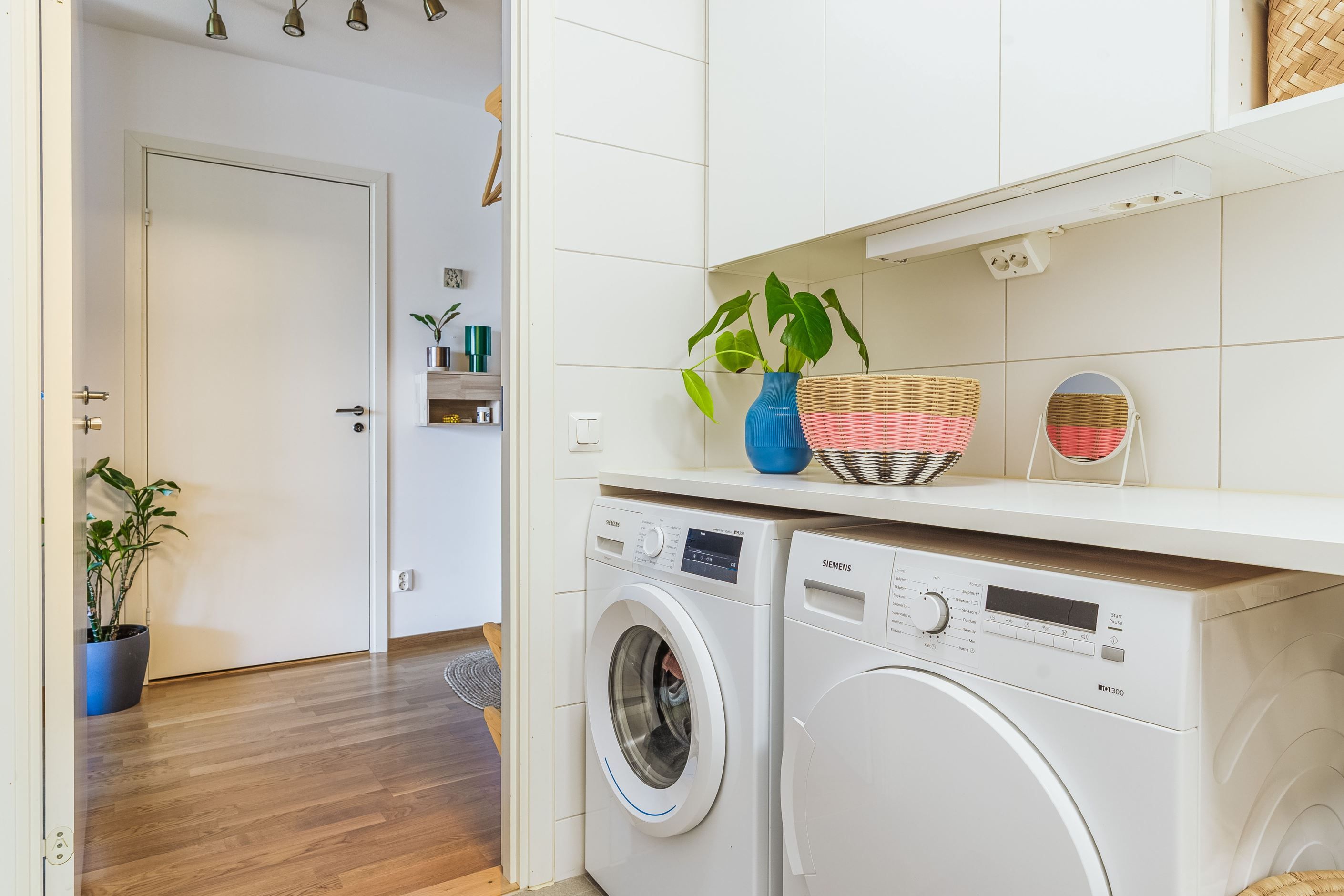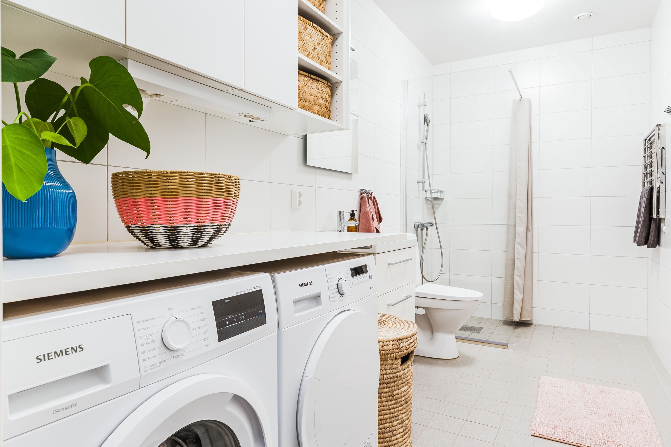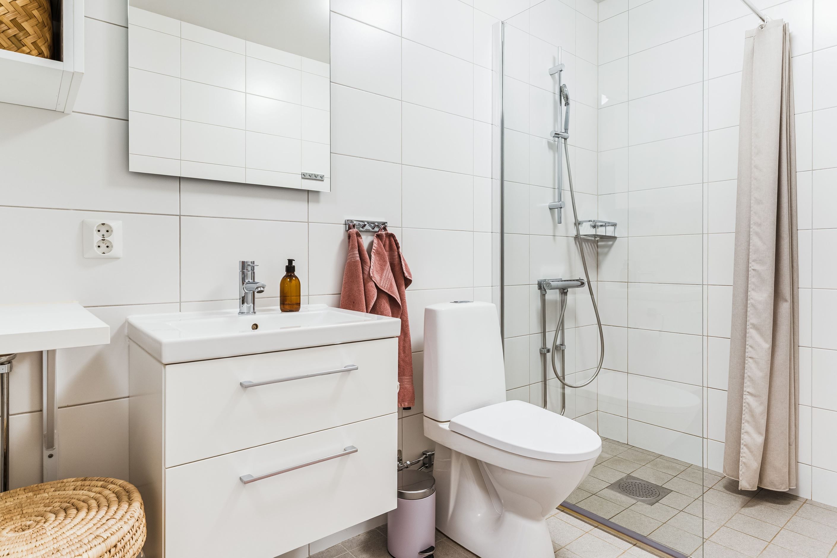 Bostaden erbjuder ett rofyllt master bedroom med god förvaring samt ett flexibelt extrarum utan fast förvaring, perfekt som gästrum, hemmakontor eller barnrum – ett rum som enkelt anpassas efter livets olika skeden. Därtill finns en praktisk klädkammare som förenklar vardagen. Det helkaklade badrummet är stilrent och funktionellt, utrustat med både tvättmaskin och torktumlare och arbetsbänk.