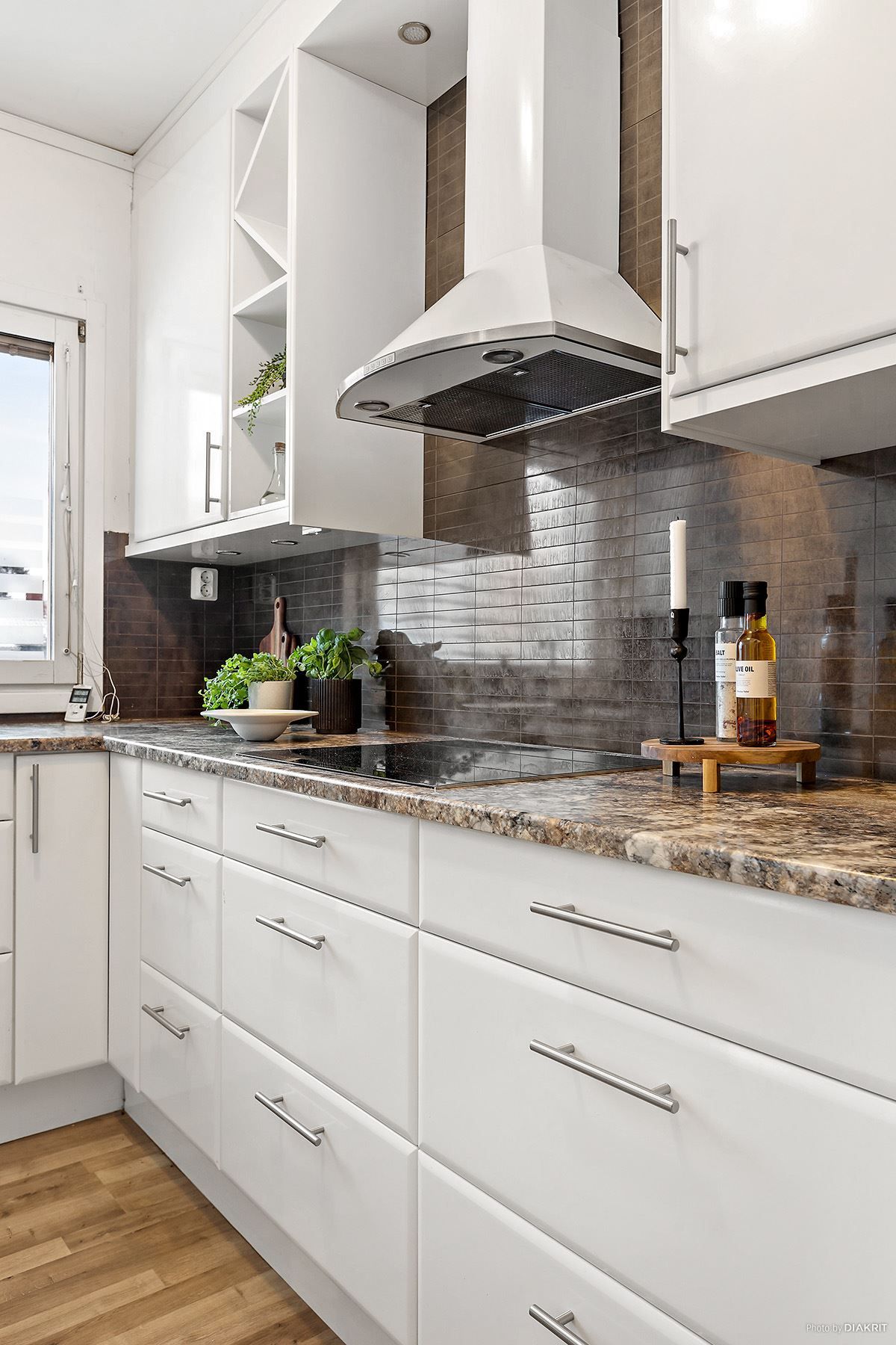 matgrupp eller soffgrupp. Lägenhetens kök är ljust med gott om plats i lådor och skåp och är utrustad med
