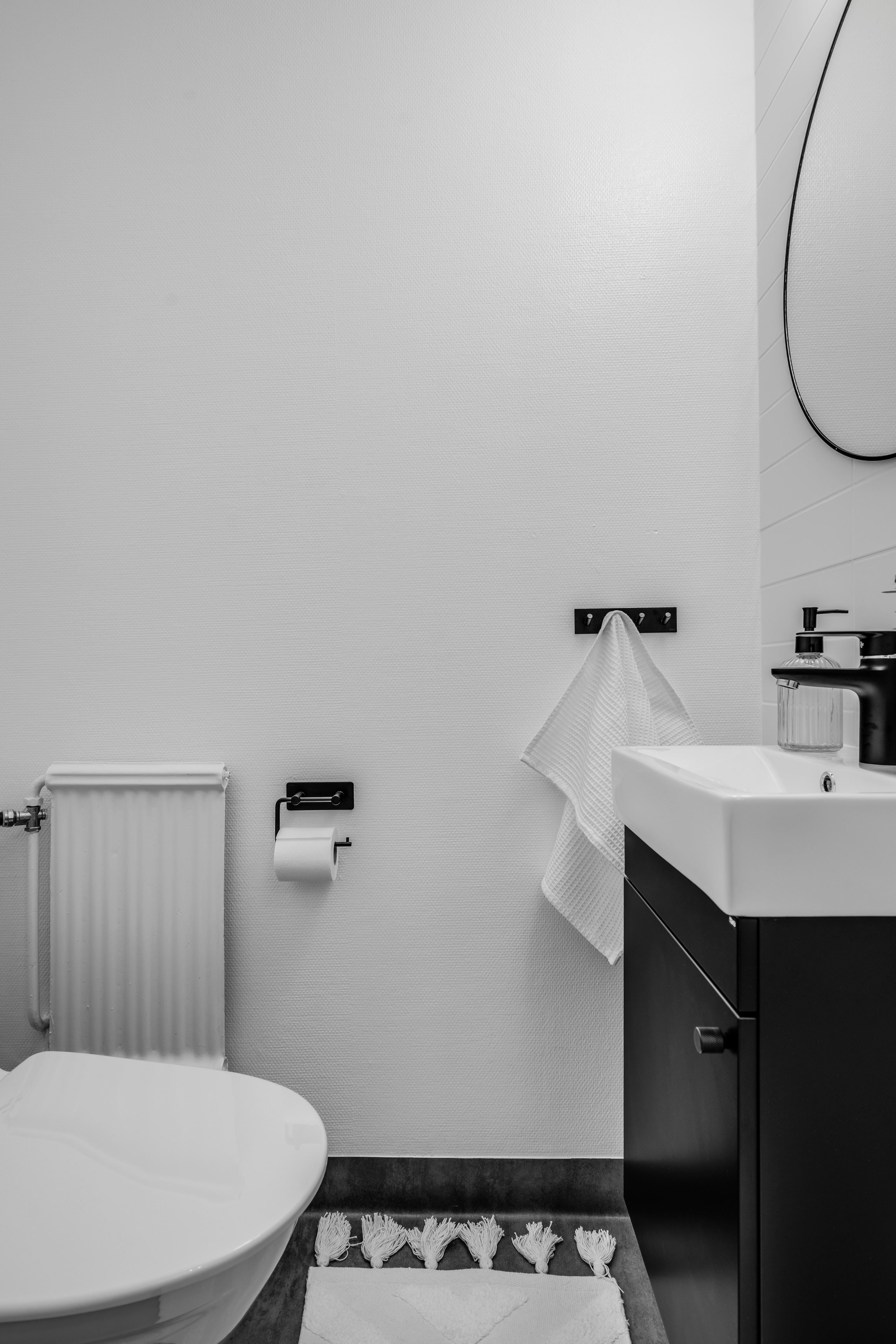 Det renoverade badrummet och WC:n håller samma genomgående höga standard och erbjuder dusch, tvättmöjligheter samt tvättmaskin - allt för en smidig vardag.