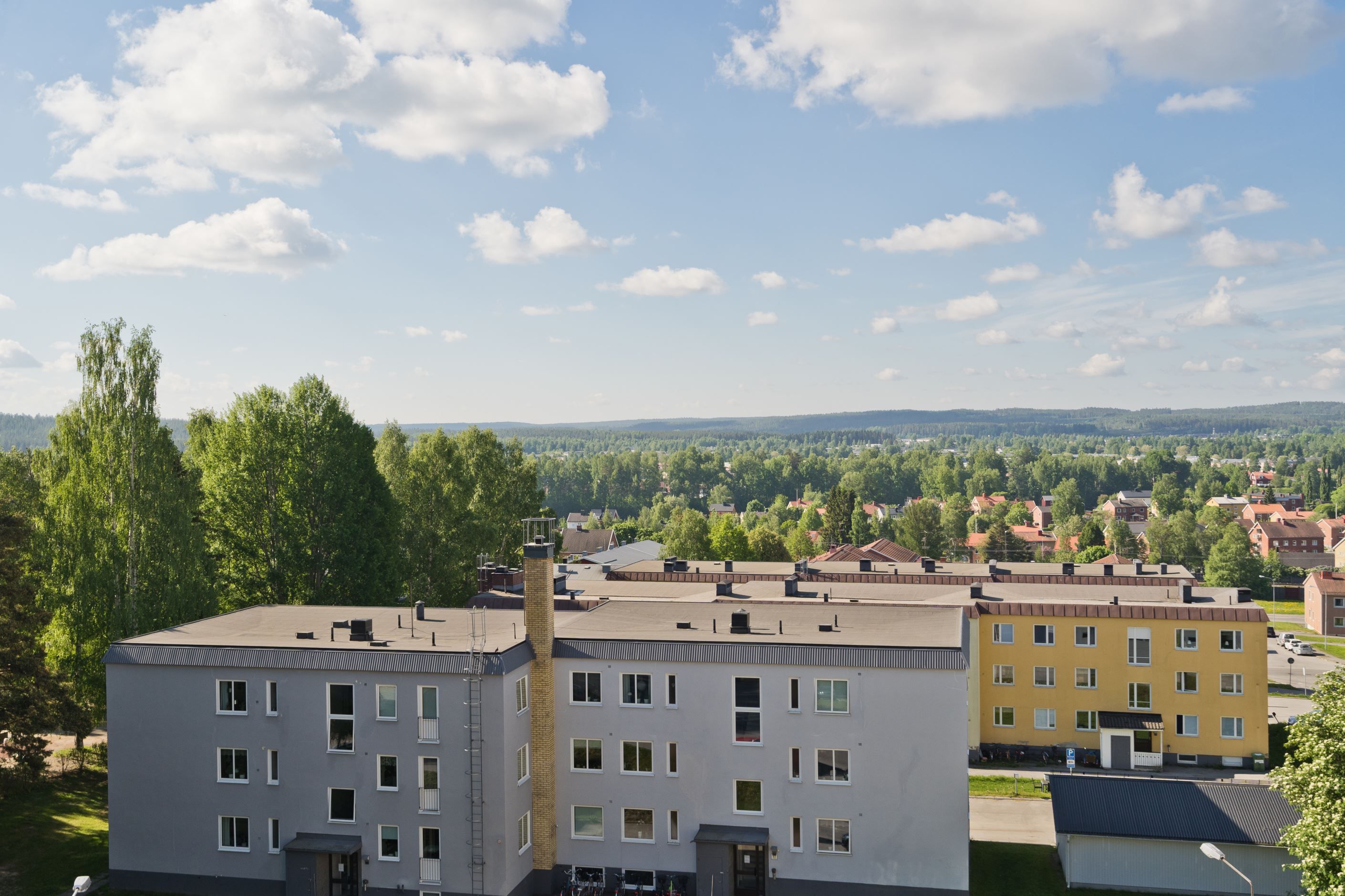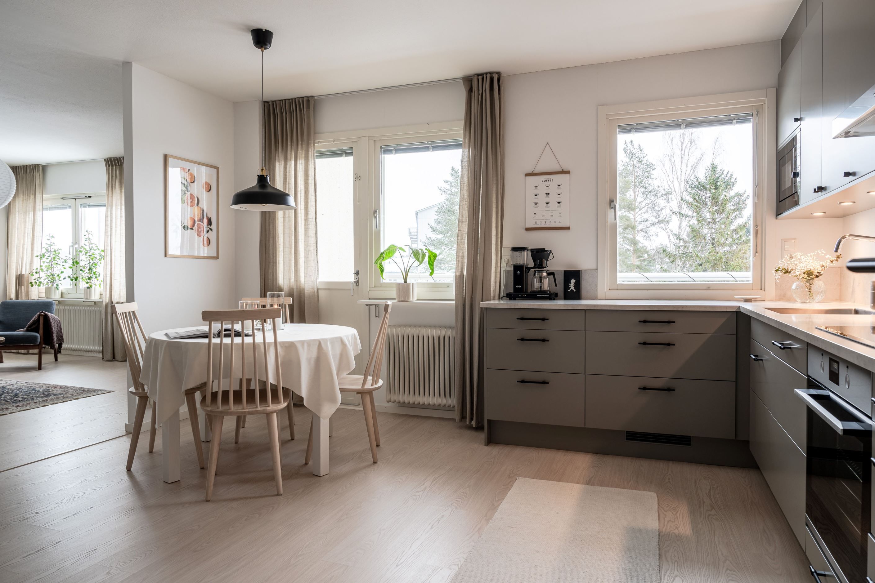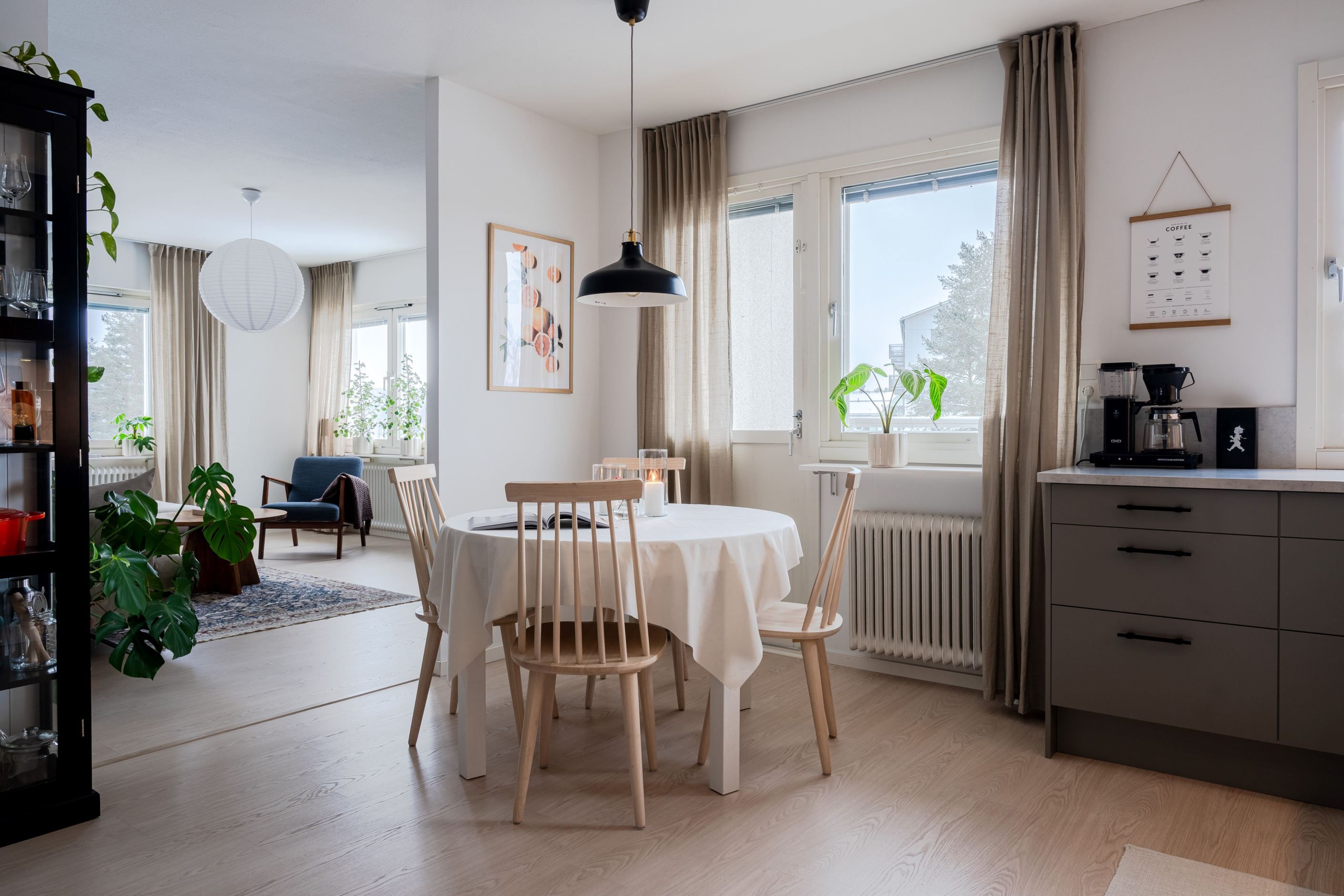 Vardagsrummet ligger i direkt anslutning till köket och präglas av ett härligt ljusinsläpp från flera fönster. Här bor du insynsskyddat med utsikt mot både skogspartier och Skellefteå stad - en ovanlig kombination som skapar en känsla av lugn mitt i vardagen.