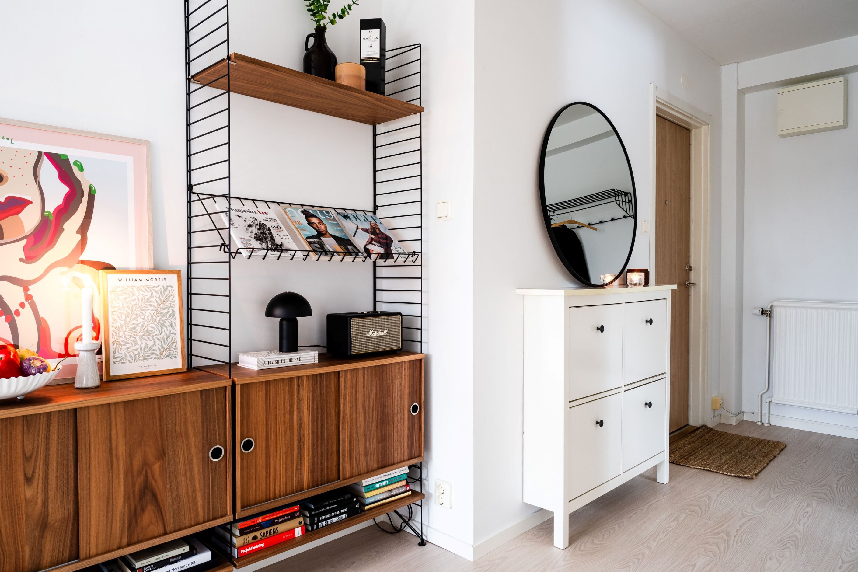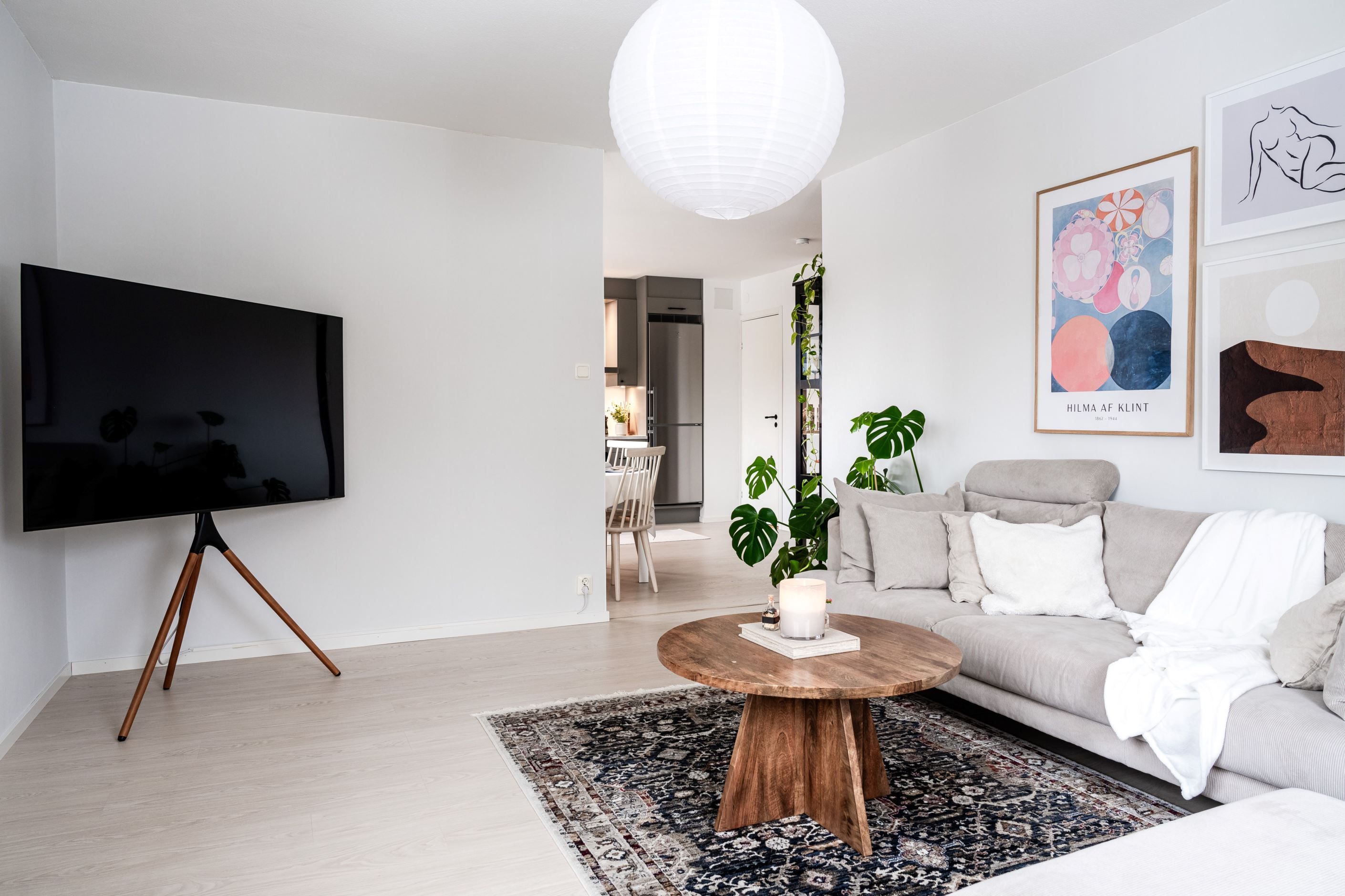 Redan i hallen möts du av ett ljust och inbjudande intryck som sätter tonen för resten av bostaden. Den öppna planlösningen låter ljuset flöda genom hemmet och skapar en naturlig samhörighet mellan kök och vardagsrum - perfekt för både vardag och sociala tillställningar.
