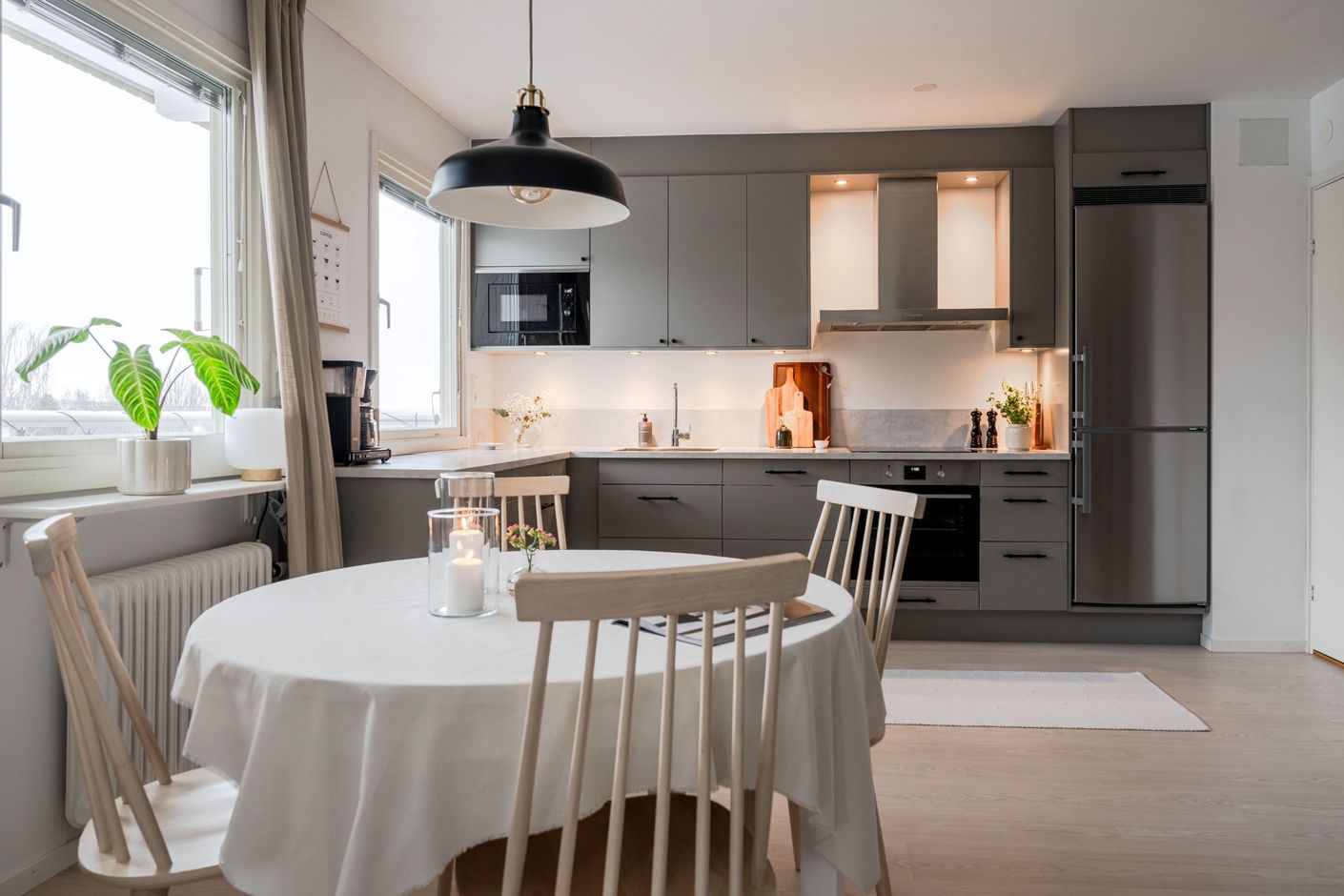 Köket är smakfullt renoverat med släta, grå köksluckor och en välutrustad maskinpark av hög kvalitet. Här finns gott om arbetsyta och plats för större matgrupp intill fönsterpartier som ramar in utsikten på ett vackert sätt. Från köket nås även balkongen - en självklar plats att njuta av lugnet, grönskan och den fria utsikten.