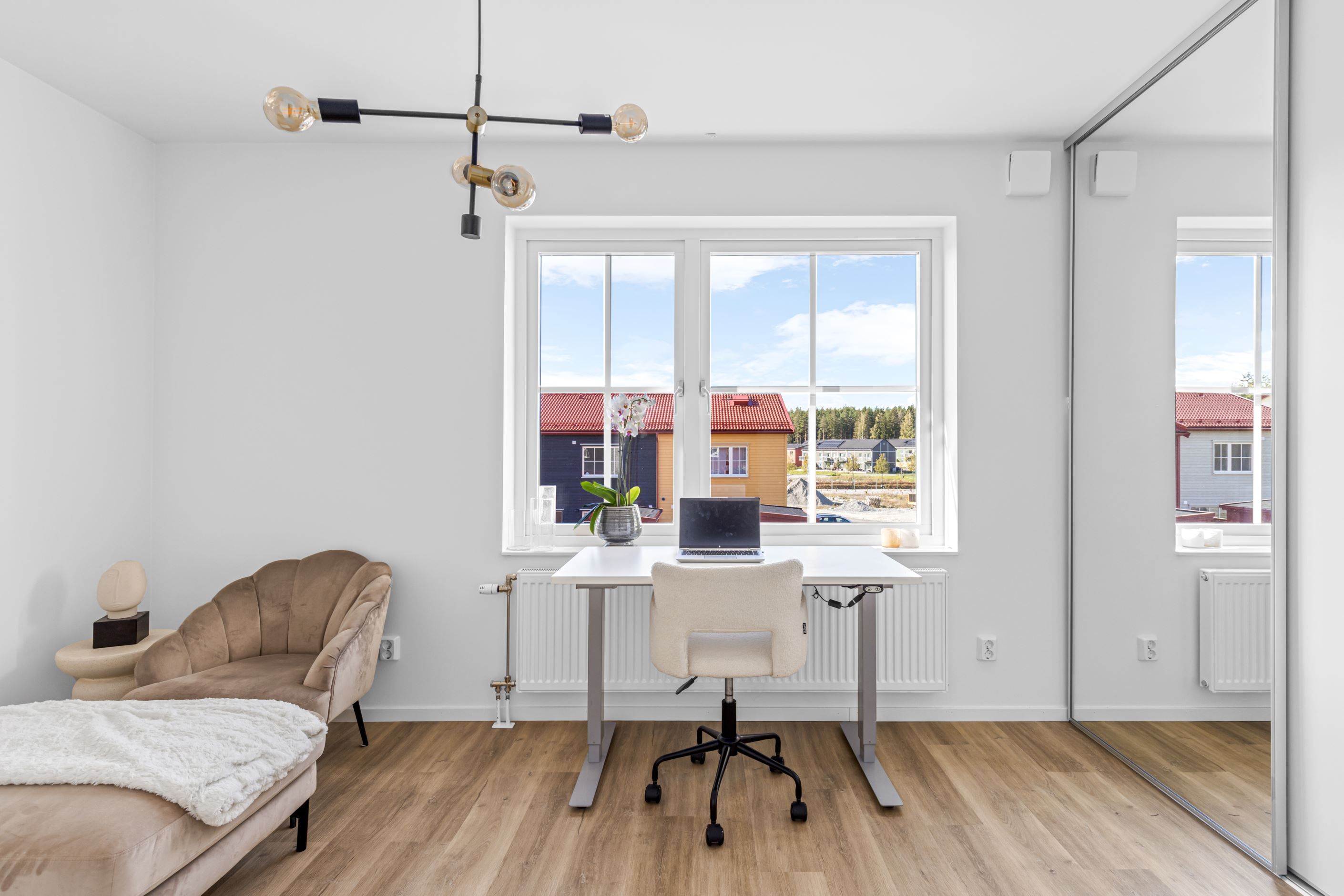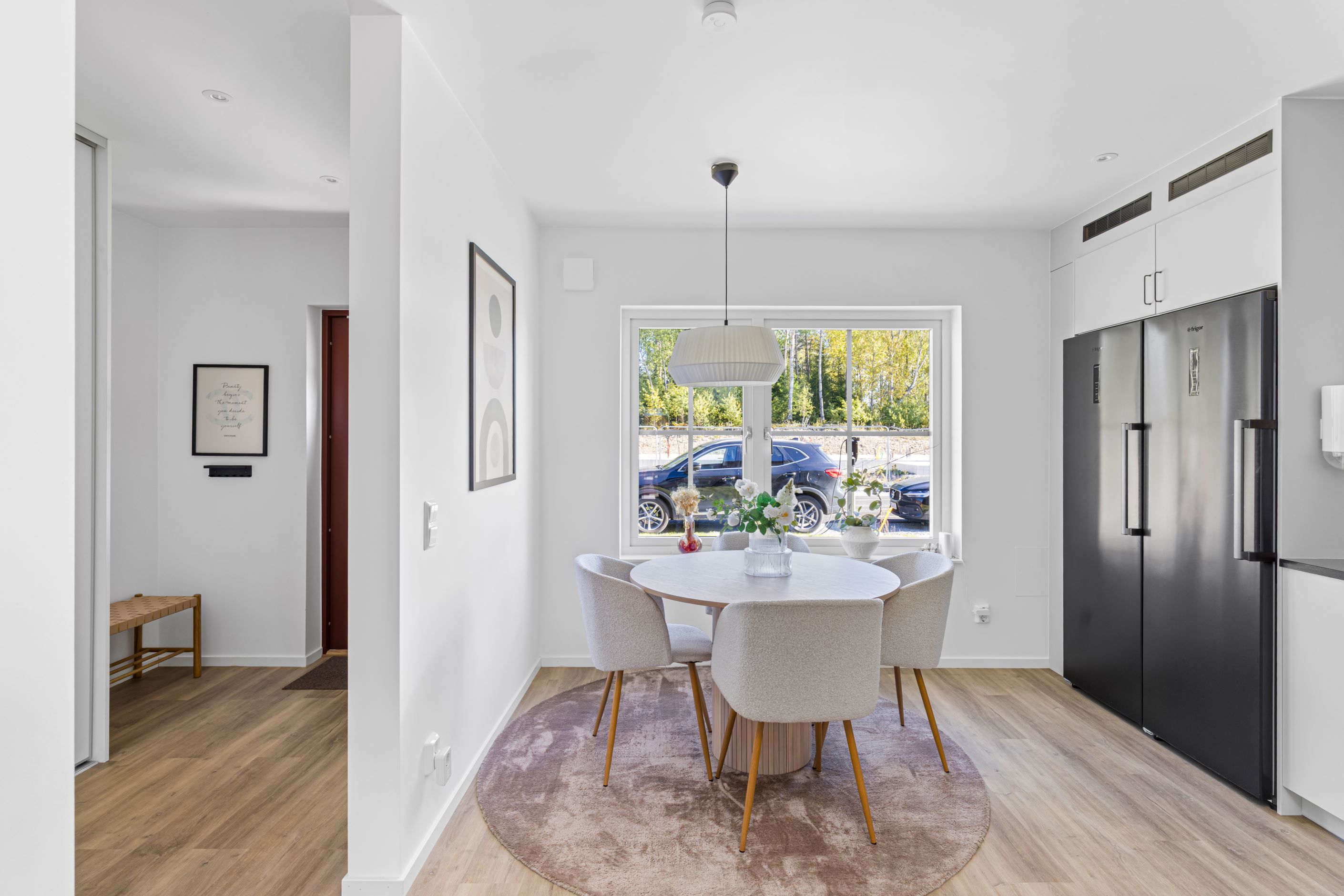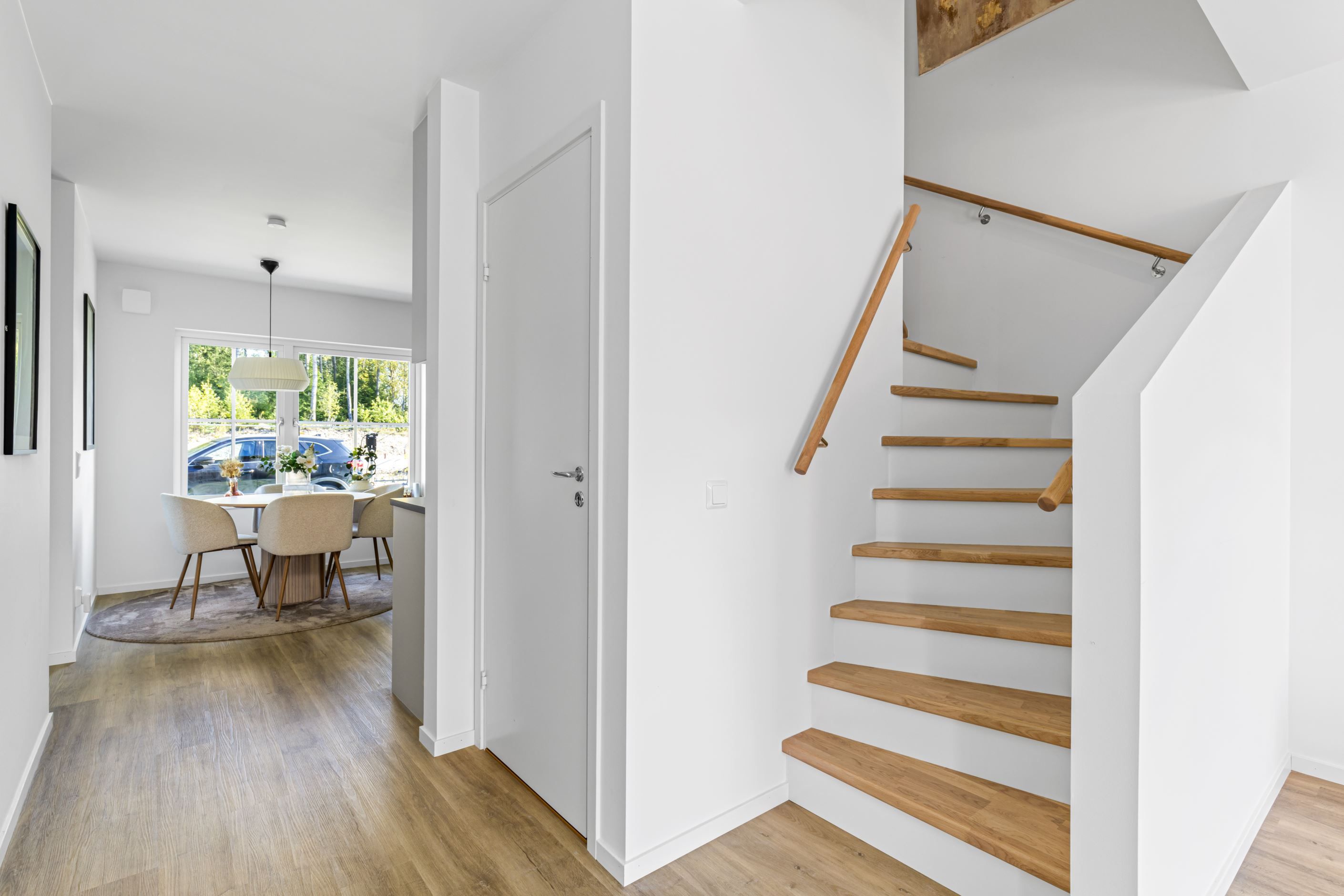 Materialvalen är noggrant utvalda för att skapa en harmonisk och hållbar inredning med produkter från välkända varumärken som står sig över tid. Bostaden har låga driftskostnader tack vare en effektiv frånluftsvärmepump med vattenburen värme, golvvärme på entréplan och element på övre plan.