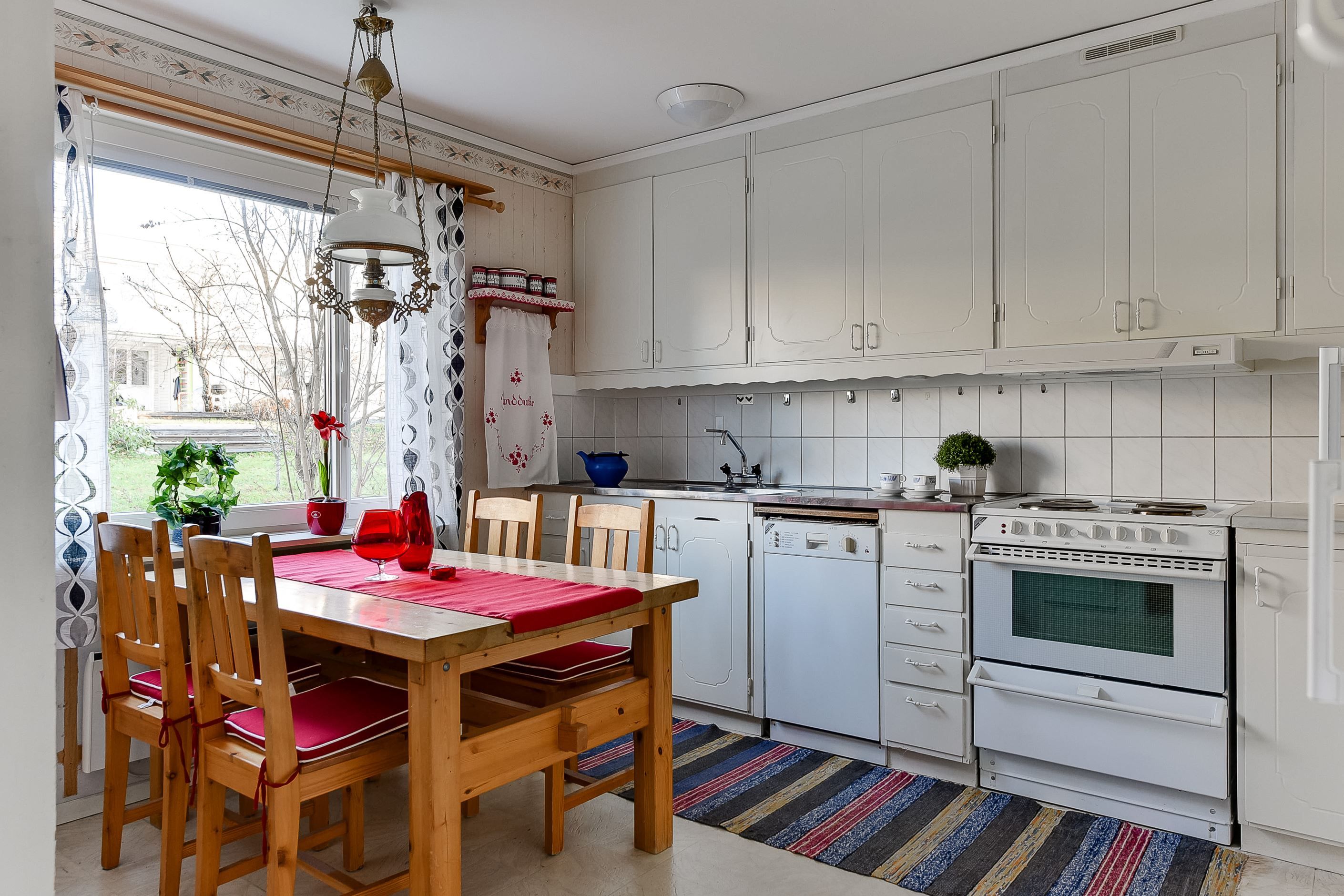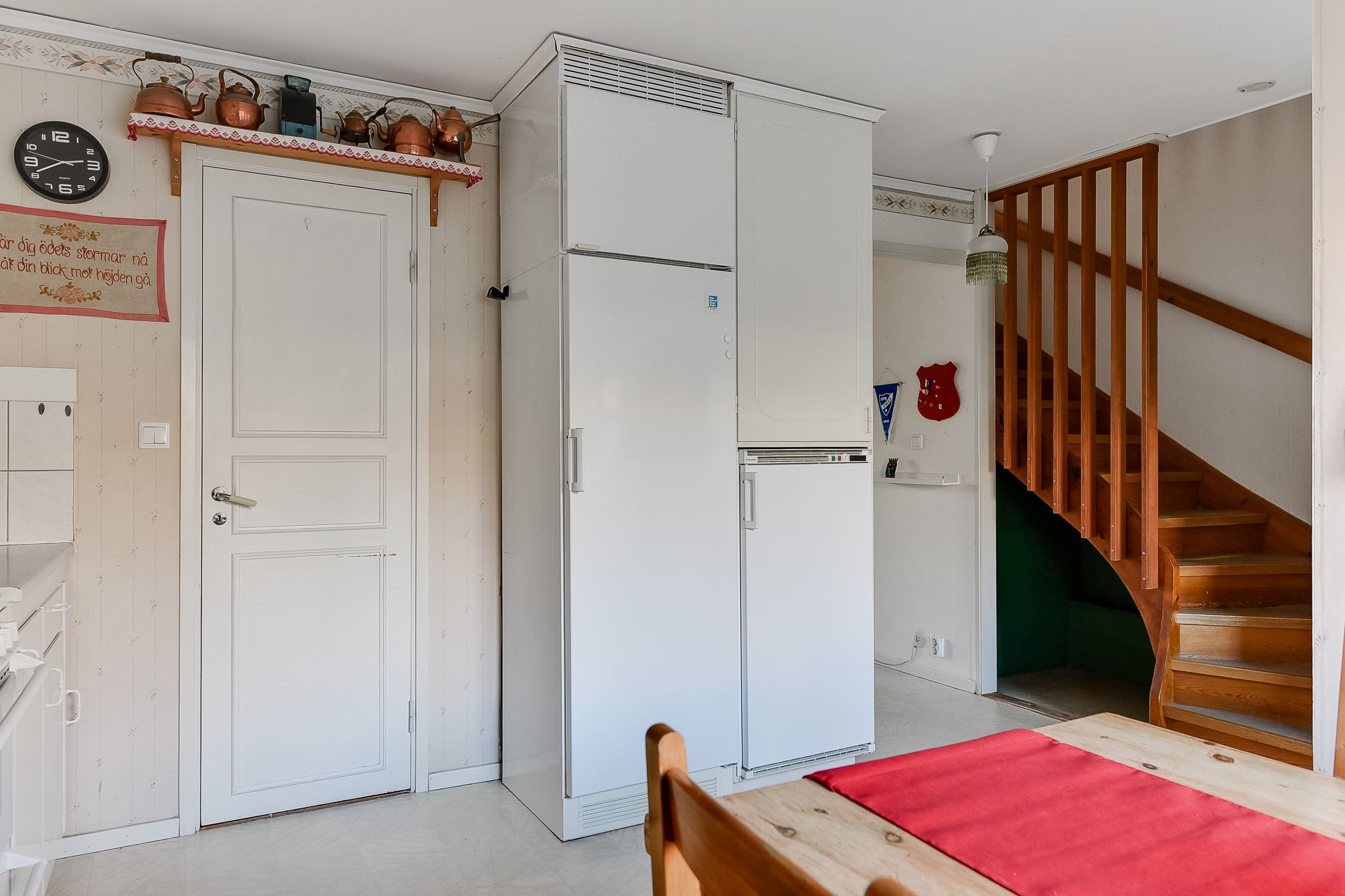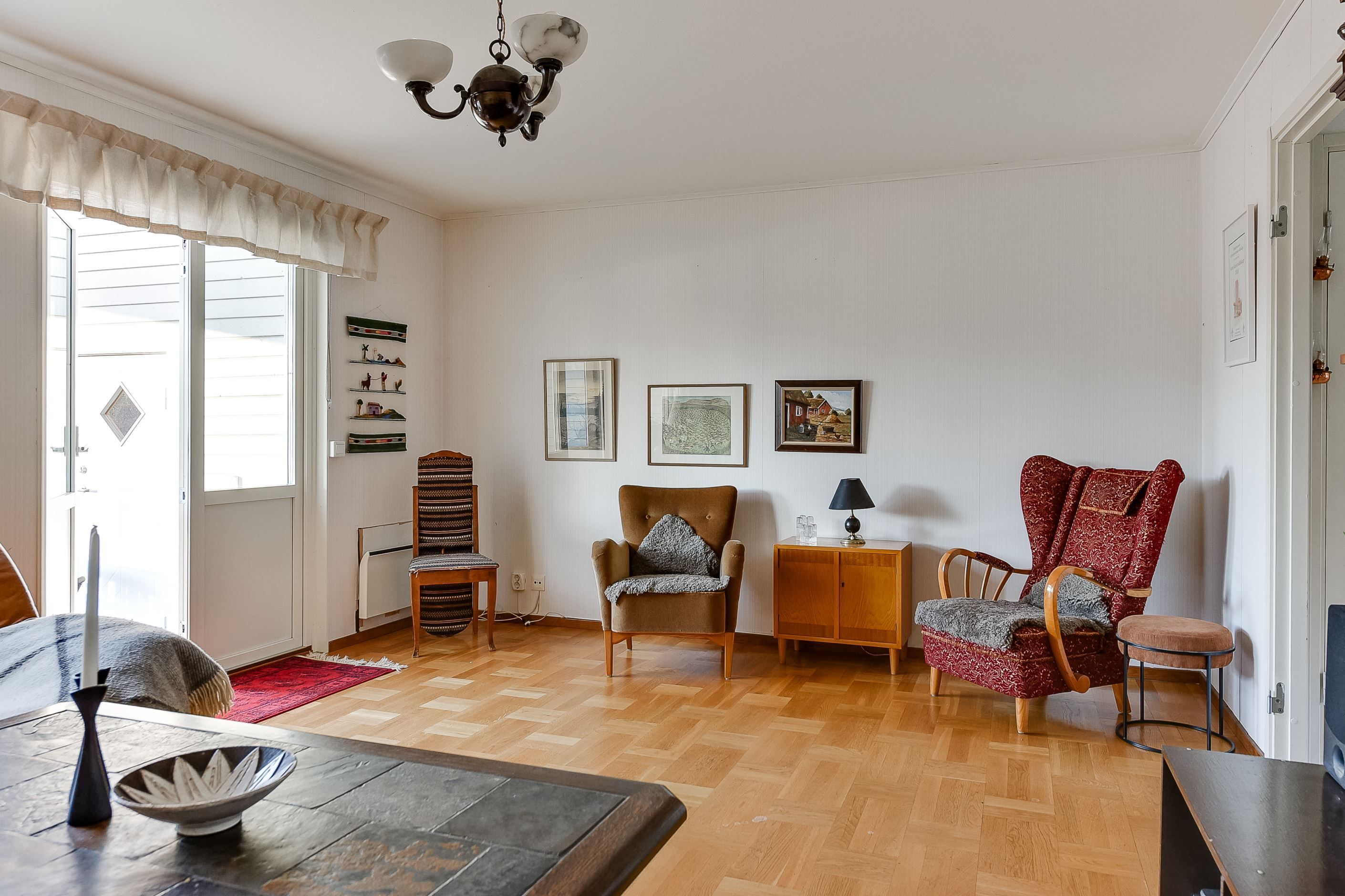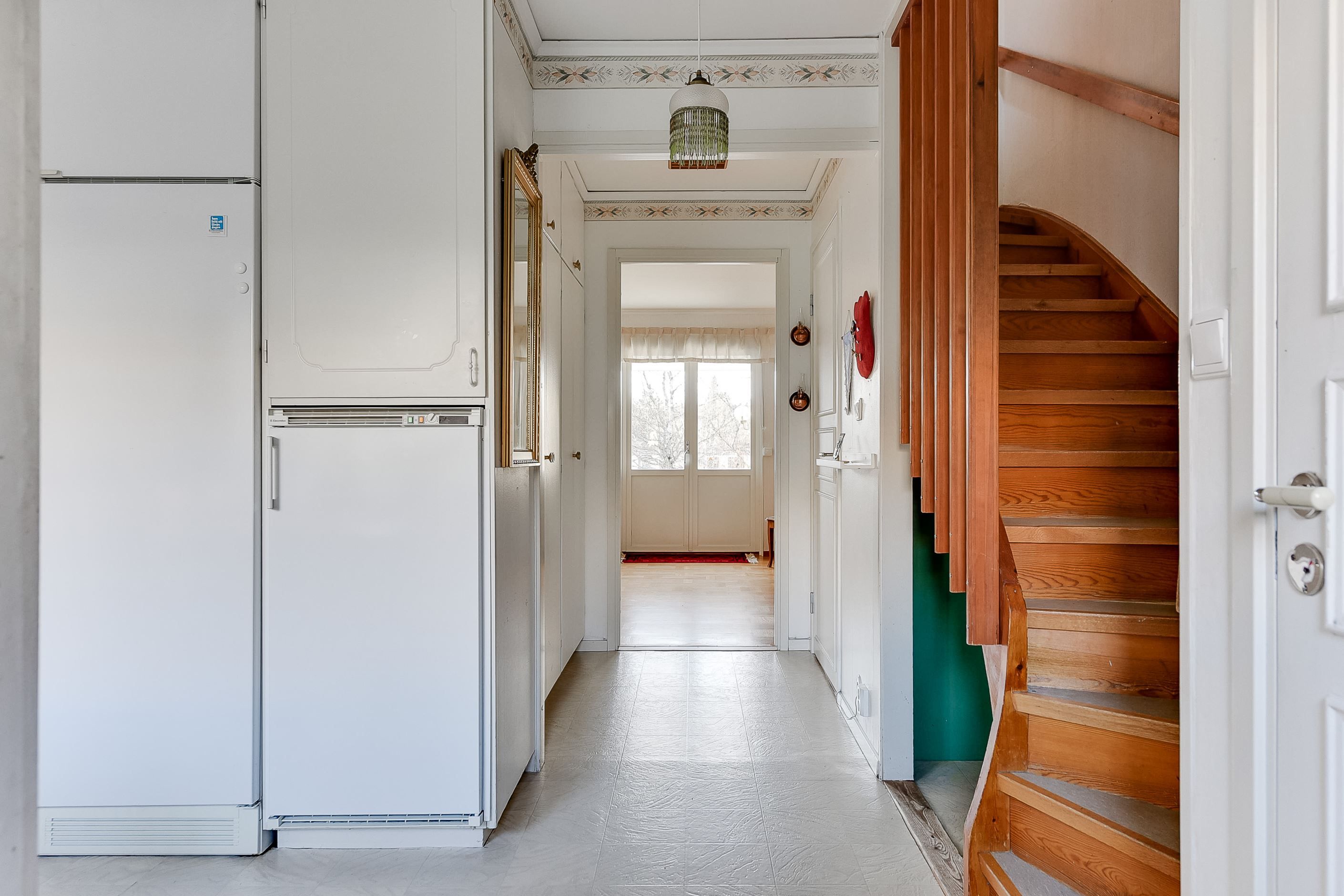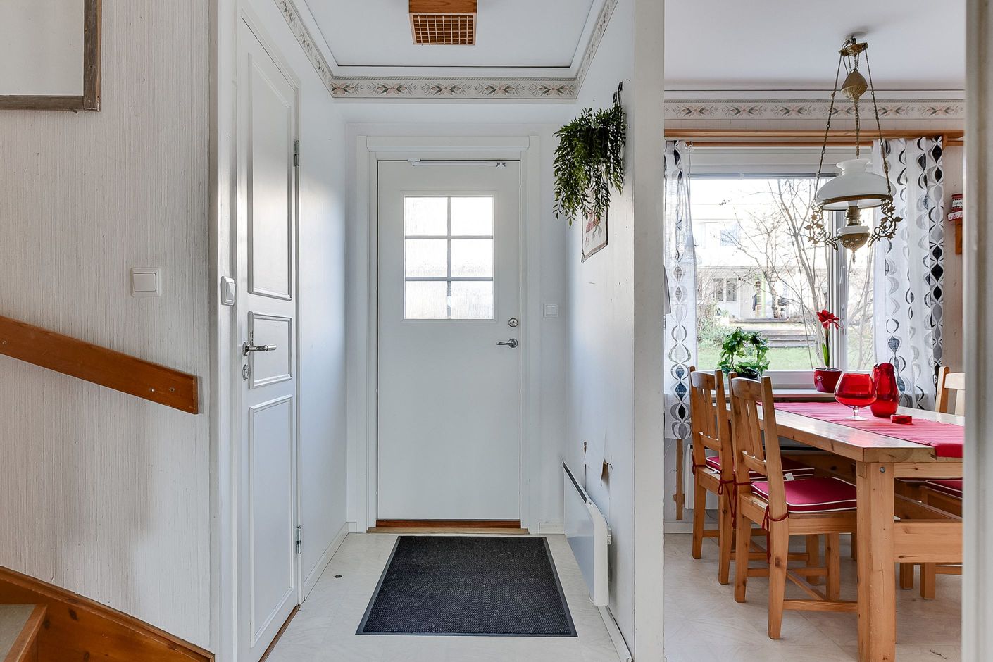 Entréplanet erbjuder ett luftigt vardagsrum med vackert originalgolv i ek och direkt utgång till uteplatsen. Här finns även ett kök utrustat med kyl, halvfrys, spis med ugn och diskmaskin samt med plats för middagsbord intill fönster, en praktisk gästtoalett samt en separat tvättstuga – detaljer som gör vardagen både smidig och bekväm. En trappa upp väntar tre rymliga sovrum, en praktisk klädkammare samt ett helkaklat badrum med dusch.