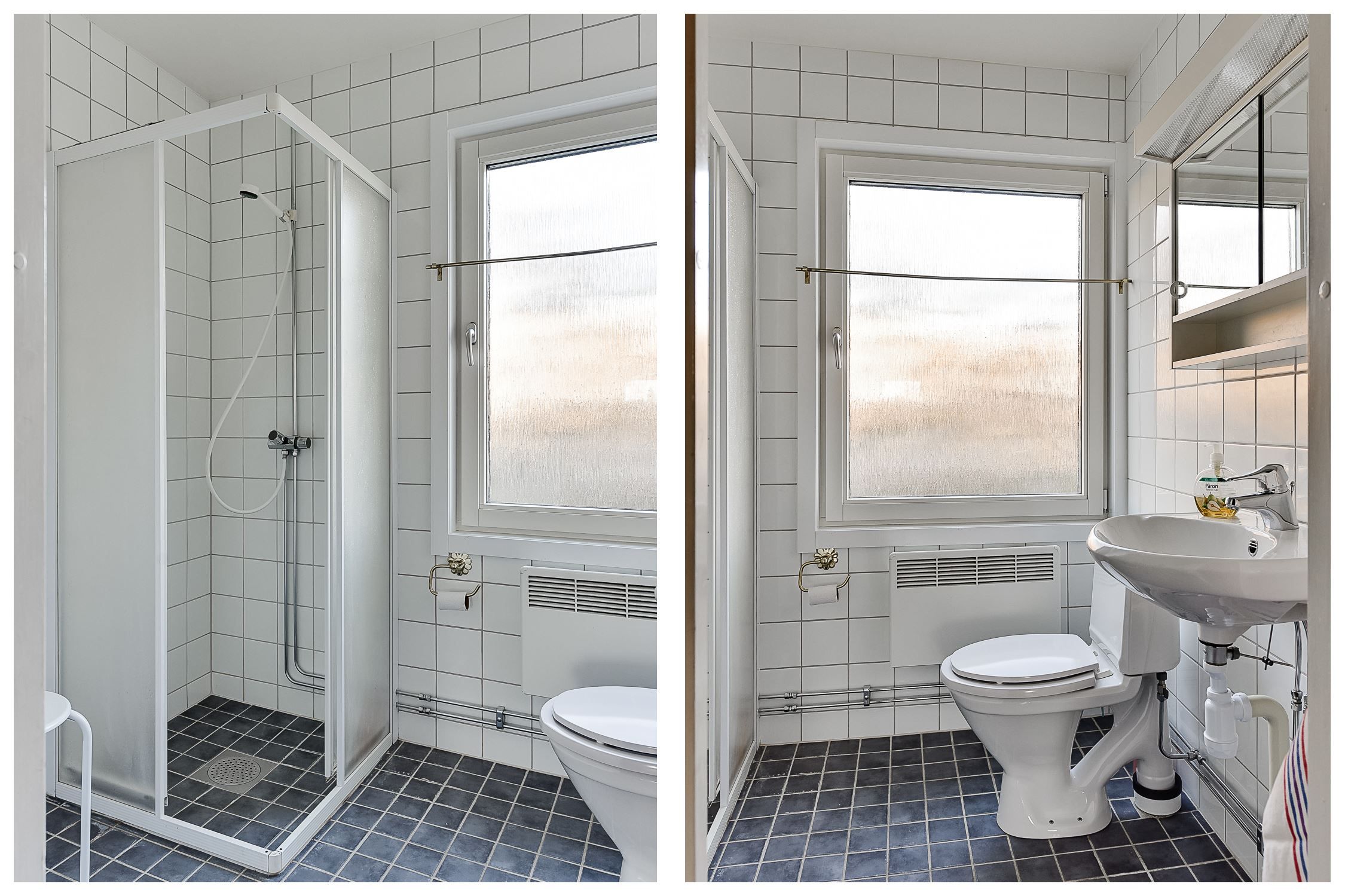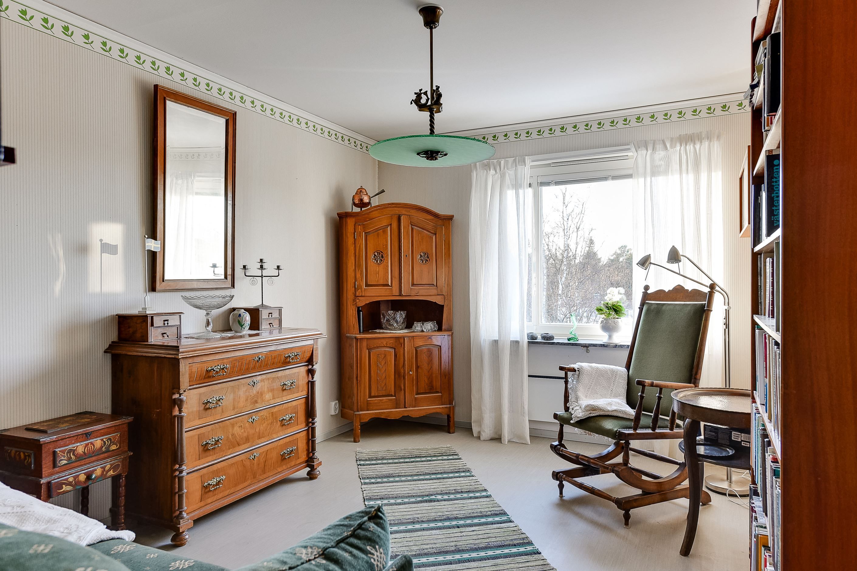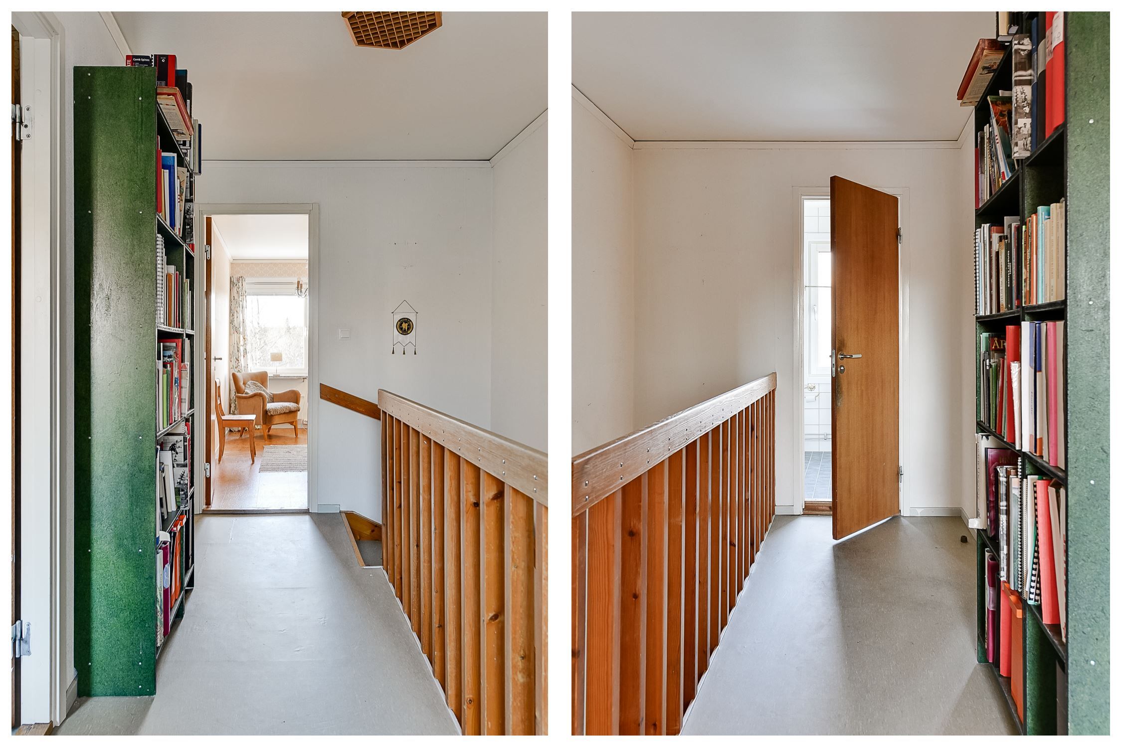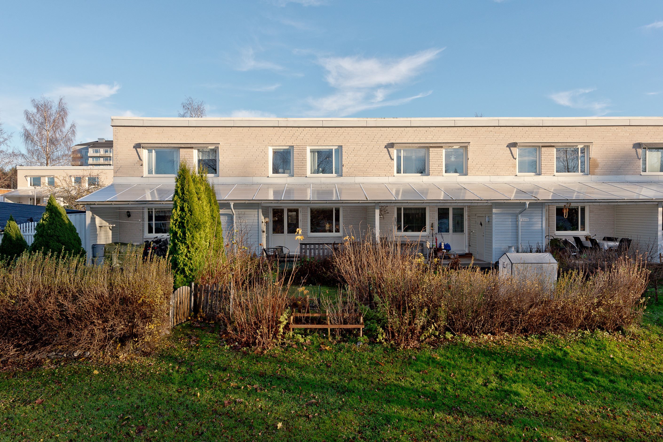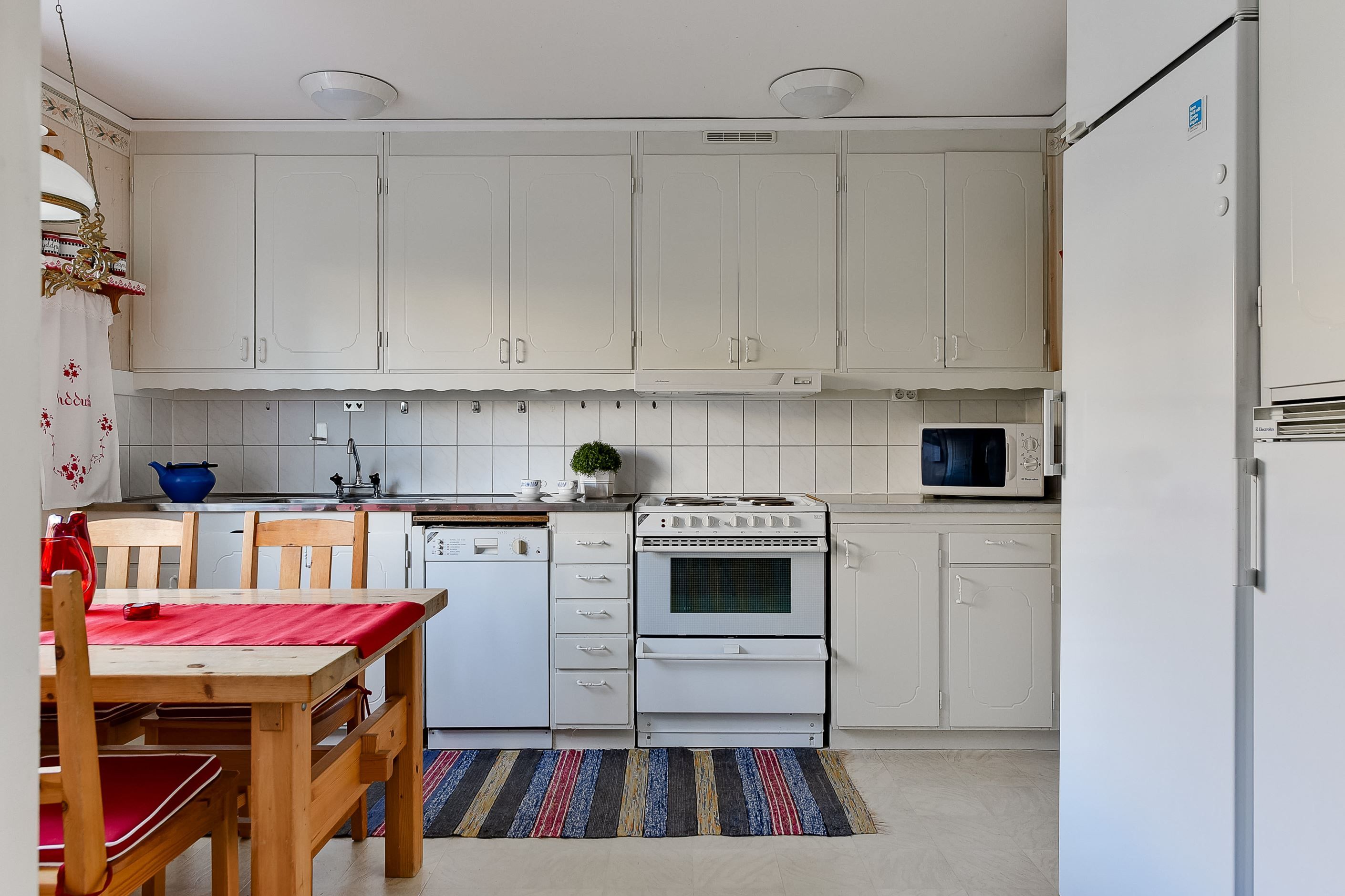 Entréplanet erbjuder ett luftigt vardagsrum med vackert originalgolv i ek och direkt utgång till uteplatsen. Här finns även ett kök utrustat med kyl, halvfrys, spis med ugn och diskmaskin samt med plats för middagsbord intill fönster, en praktisk gästtoalett samt en separat tvättstuga – detaljer som gör vardagen både smidig och bekväm. En trappa upp väntar tre rymliga sovrum, en praktisk klädkammare samt ett helkaklat badrum med dusch.