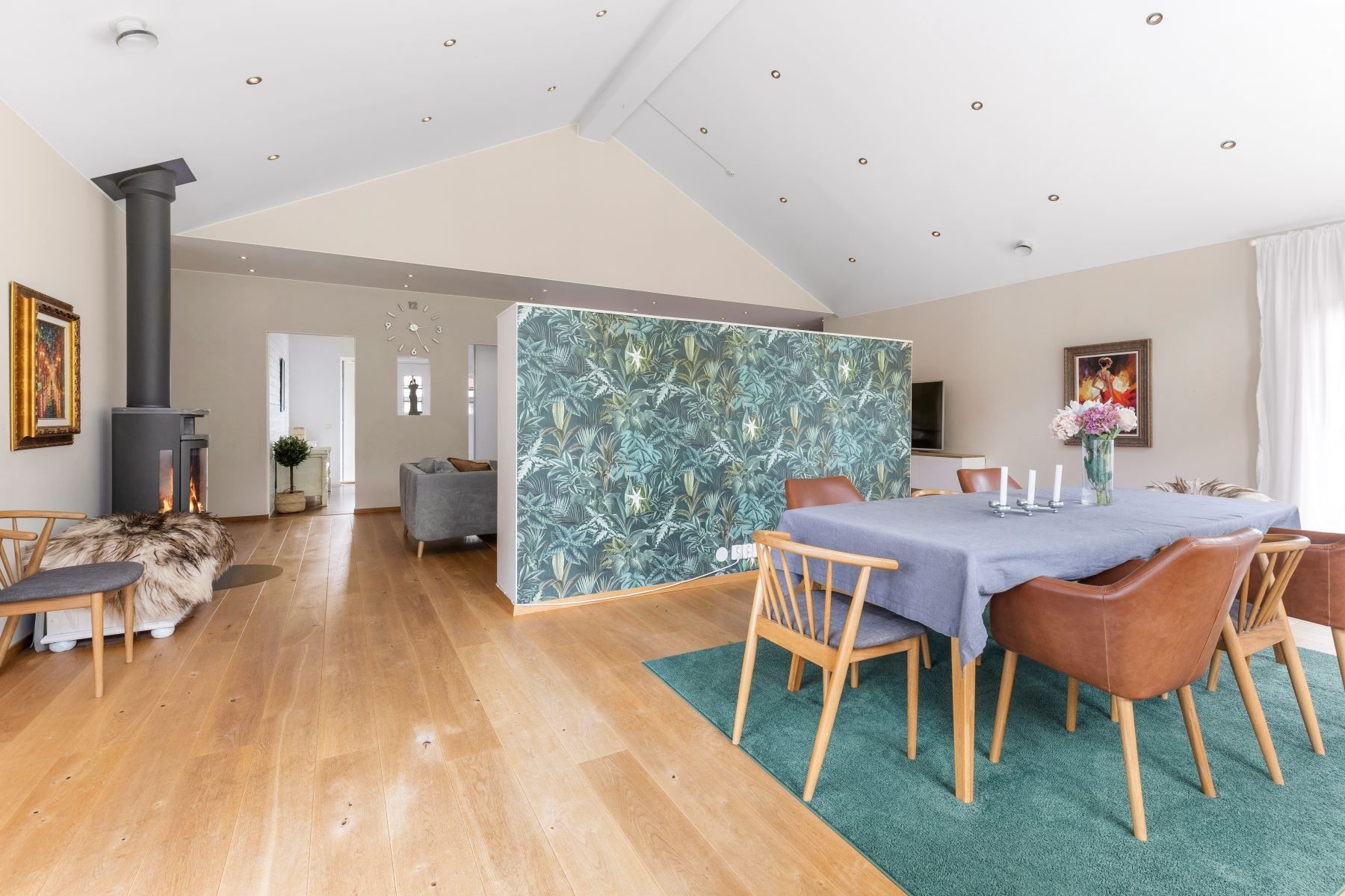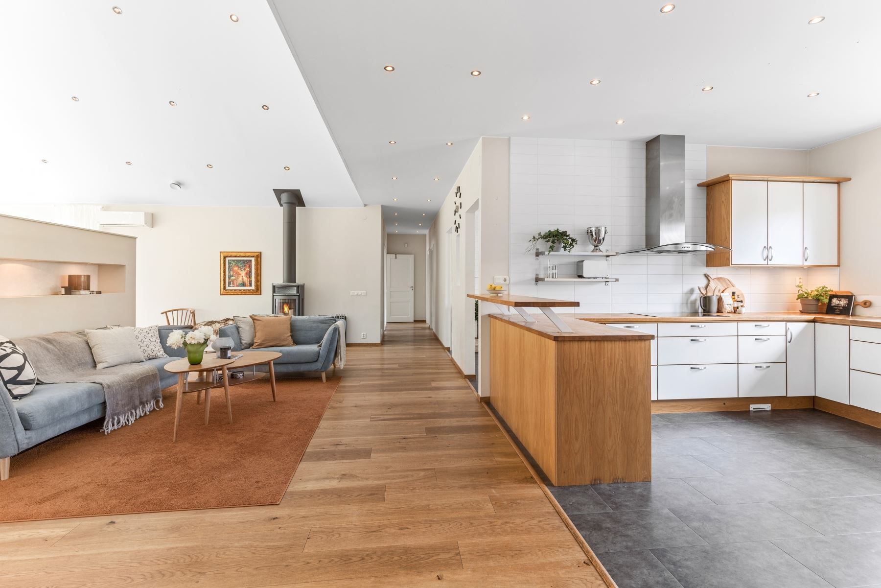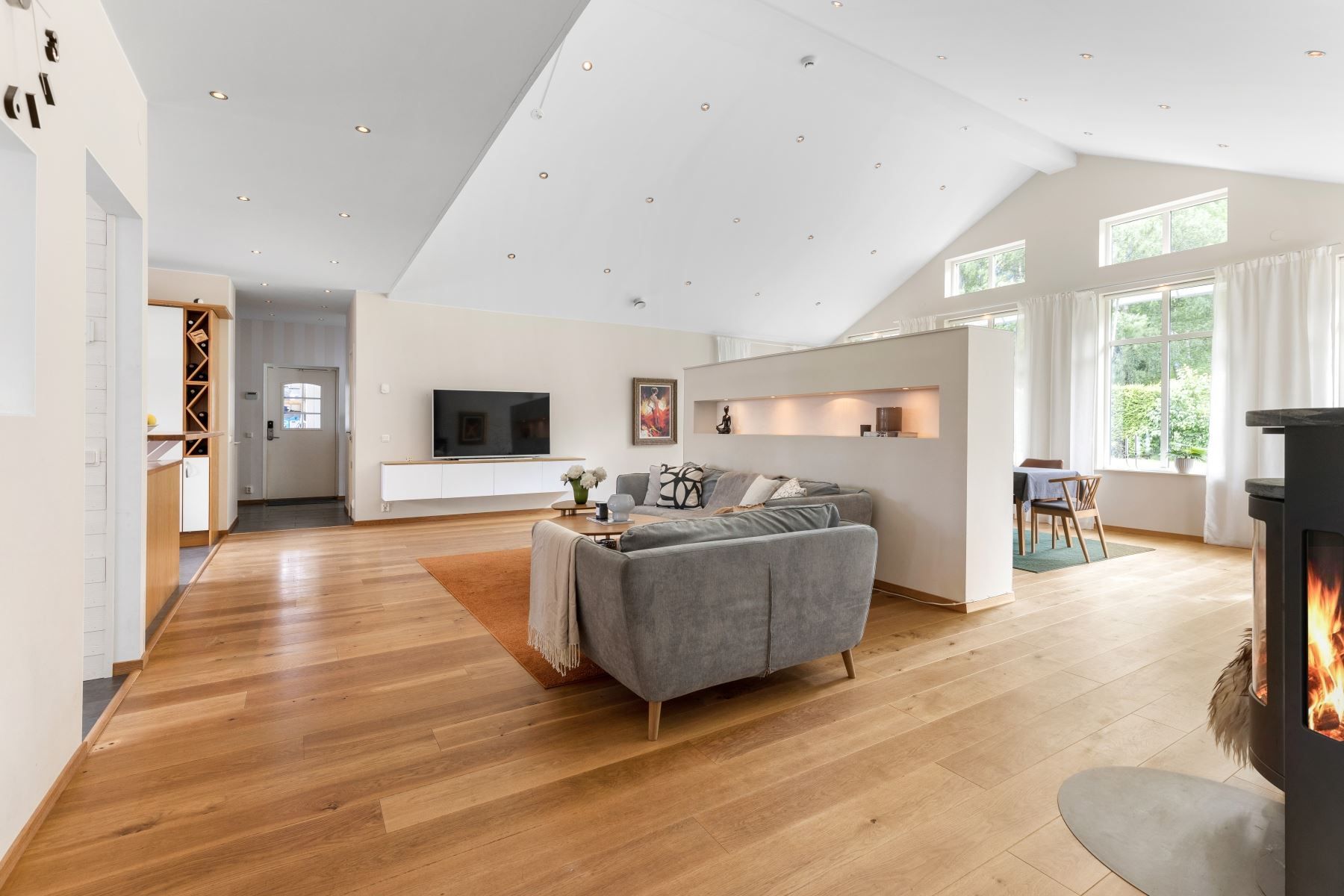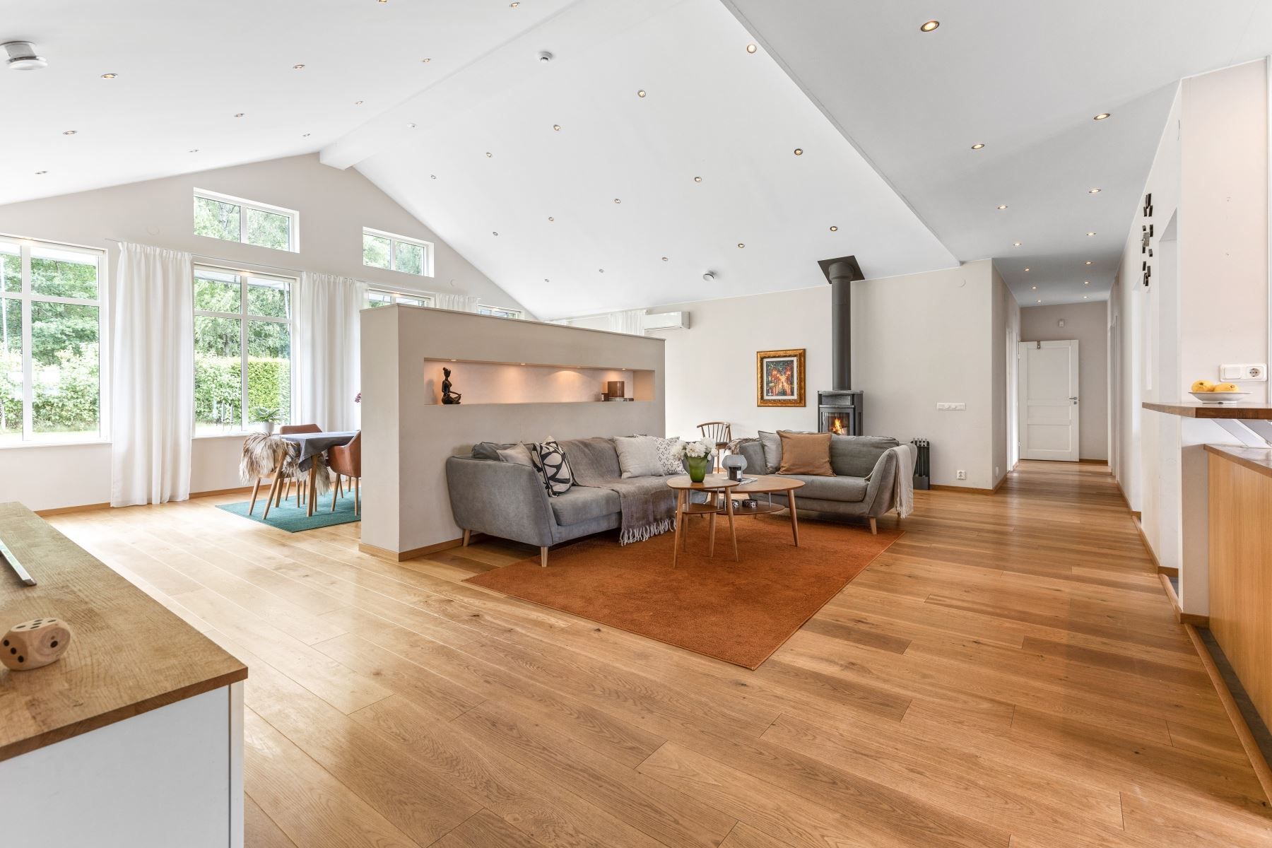 Väl tilltaget kök och vardagsrum i öppen planlösning med bla tak i nock och massor av ljusinsläpp och rymd. I vardagsrummet finns en eldstad som värmer och förgyller tillvaron de kallare månaderna. De varmare månaderna kyler AC:n ner huset. Väl tilltaget badrum med både badkar och dusch. Flertalet sovrum.