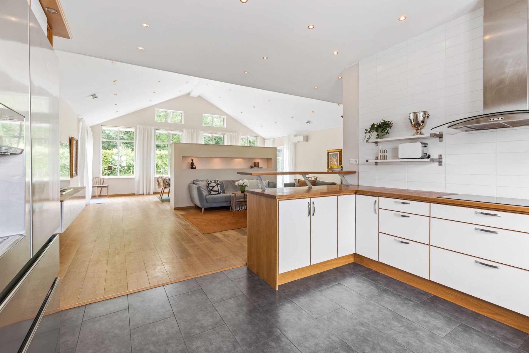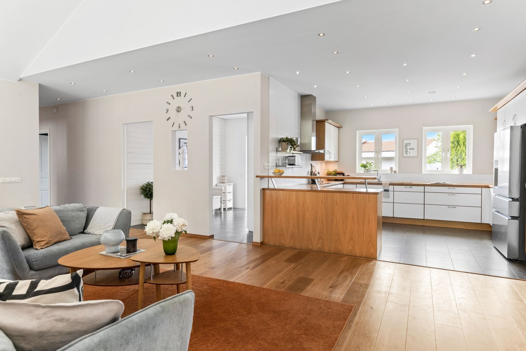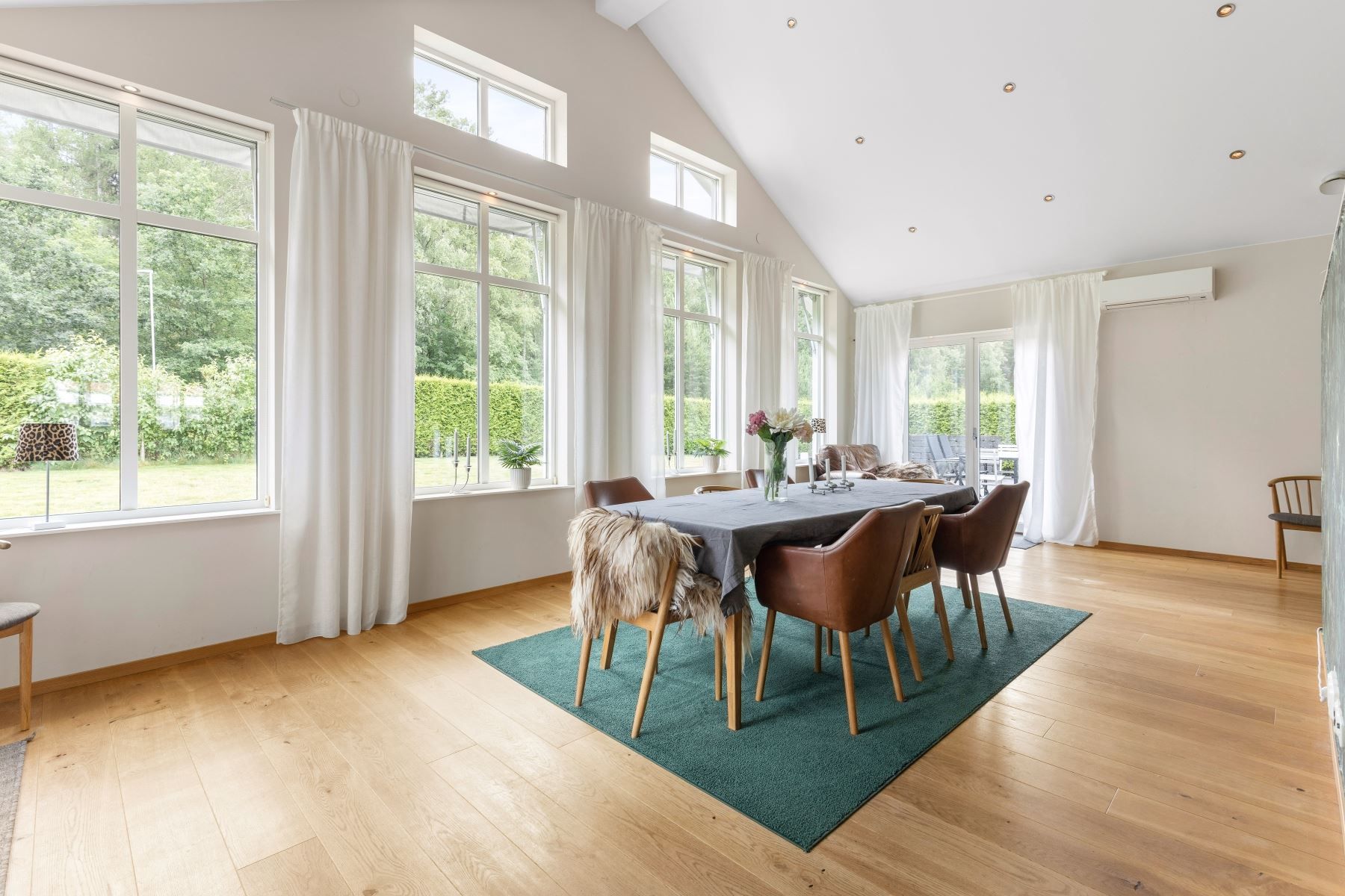 Väl tilltaget kök och vardagsrum i öppen planlösning med bla tak i nock och massor av ljusinsläpp och rymd. I vardagsrummet finns en eldstad som värmer och förgyller tillvaron de kallare månaderna. De varmare månaderna kyler AC:n ner huset. Väl tilltaget badrum med både badkar och dusch. Flertalet sovrum.