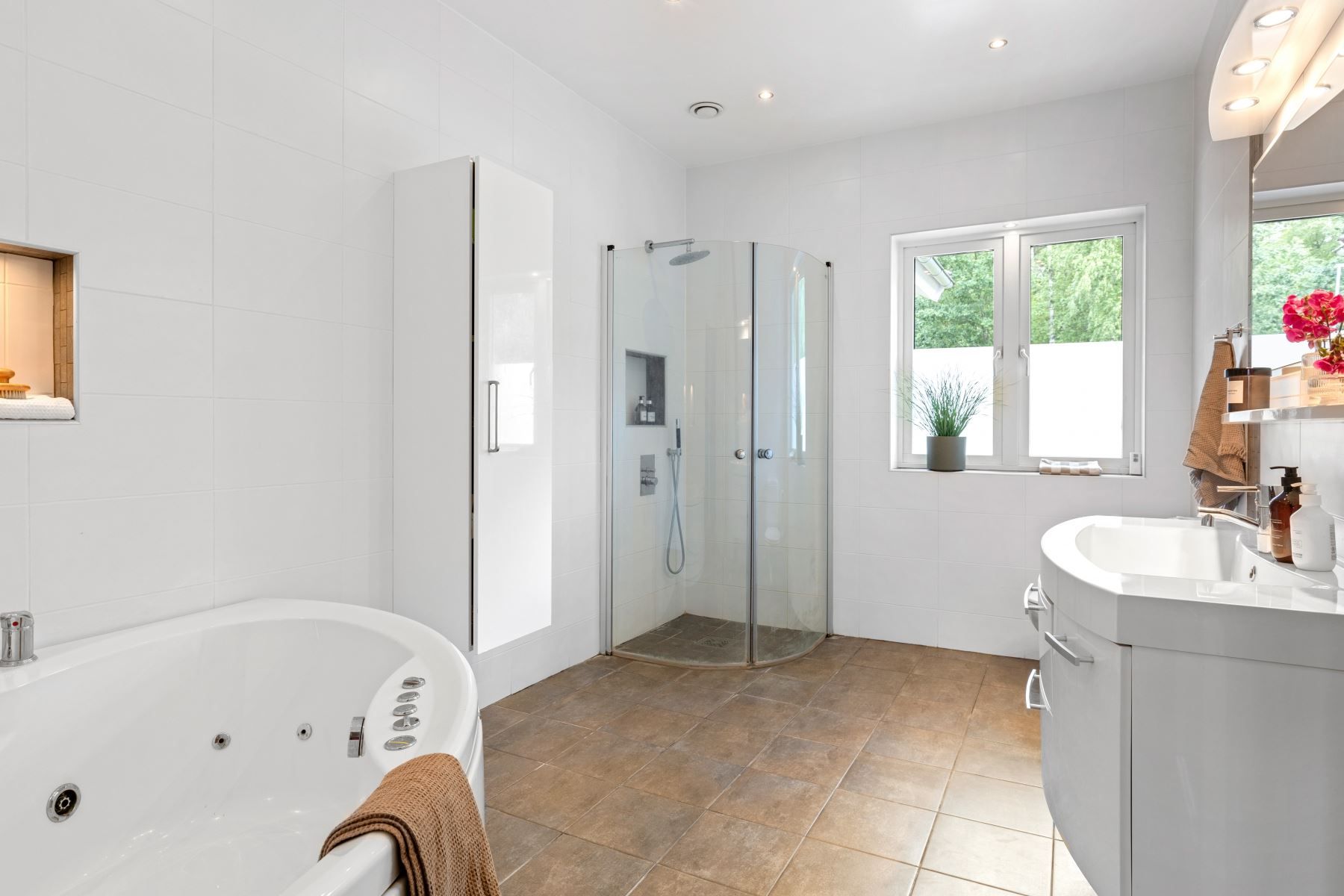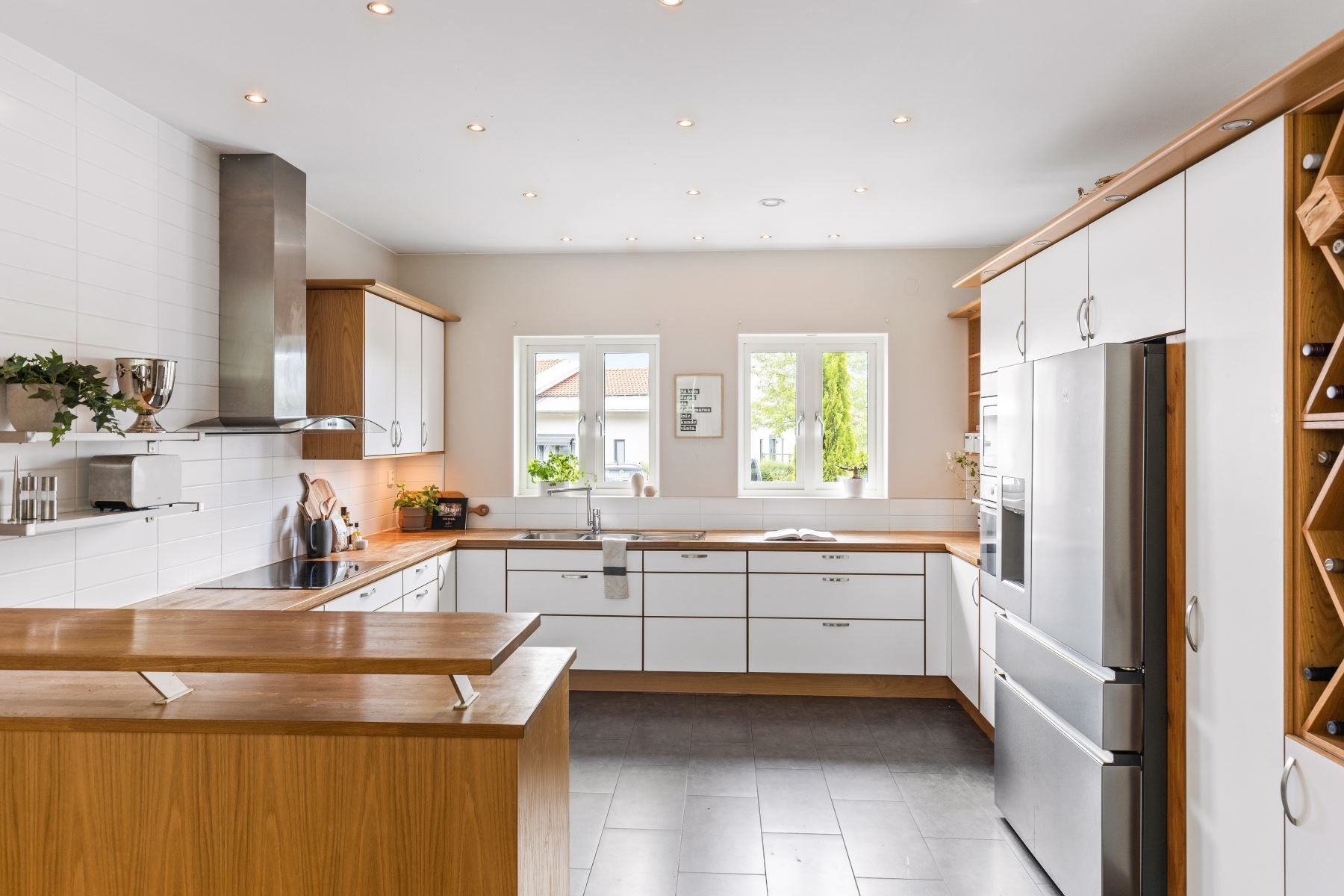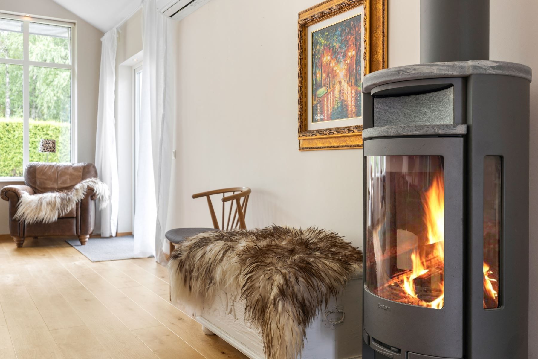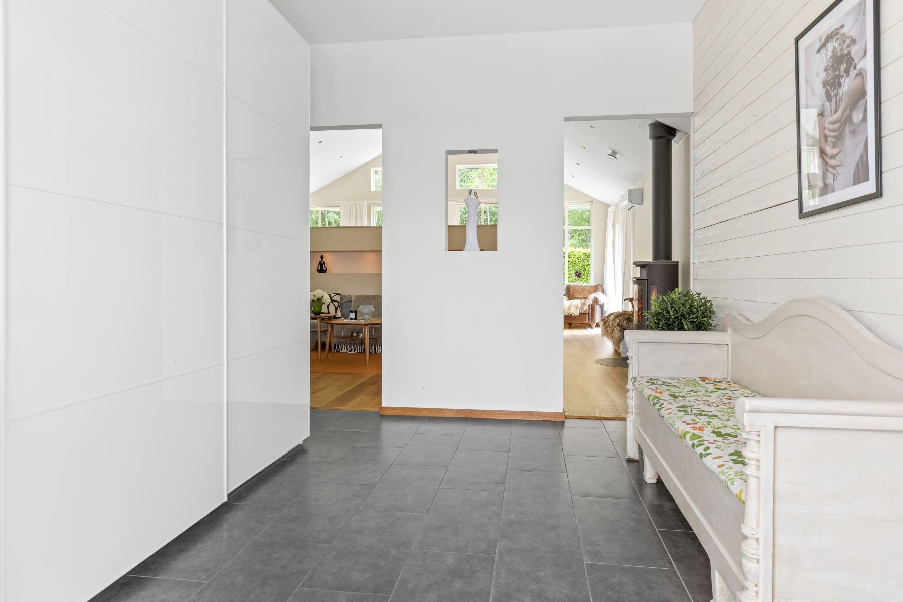 Väl tilltaget kök och vardagsrum i öppen planlösning med bla tak i nock och massor av ljusinsläpp och rymd. I vardagsrummet finns en eldstad som värmer och förgyller tillvaron de kallare månaderna. De varmare månaderna kyler AC:n ner huset. Väl tilltaget badrum med både badkar och dusch. Flertalet sovrum.
