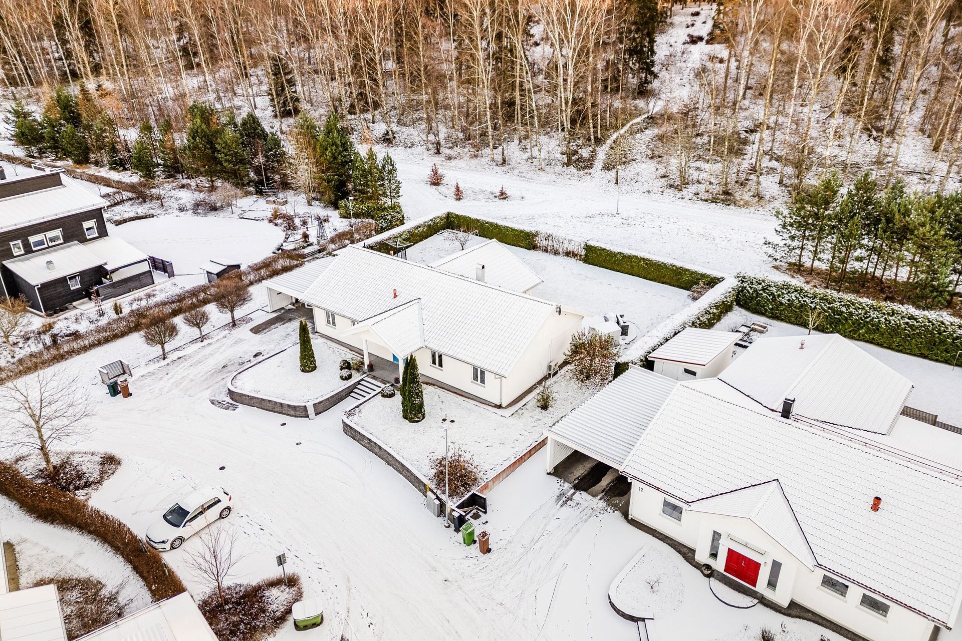 Mysig insynsskyddad baksida med uteplats i bästa kvällssol och Gröngarnåsen angränsande. Utvändigt finns stor dubbelcarport med gjuten platta (värmeslingor i plattan) som med enkelhet kan byggas om till garage. Elbilsladdare finns installerad. Separat förrådsdel.