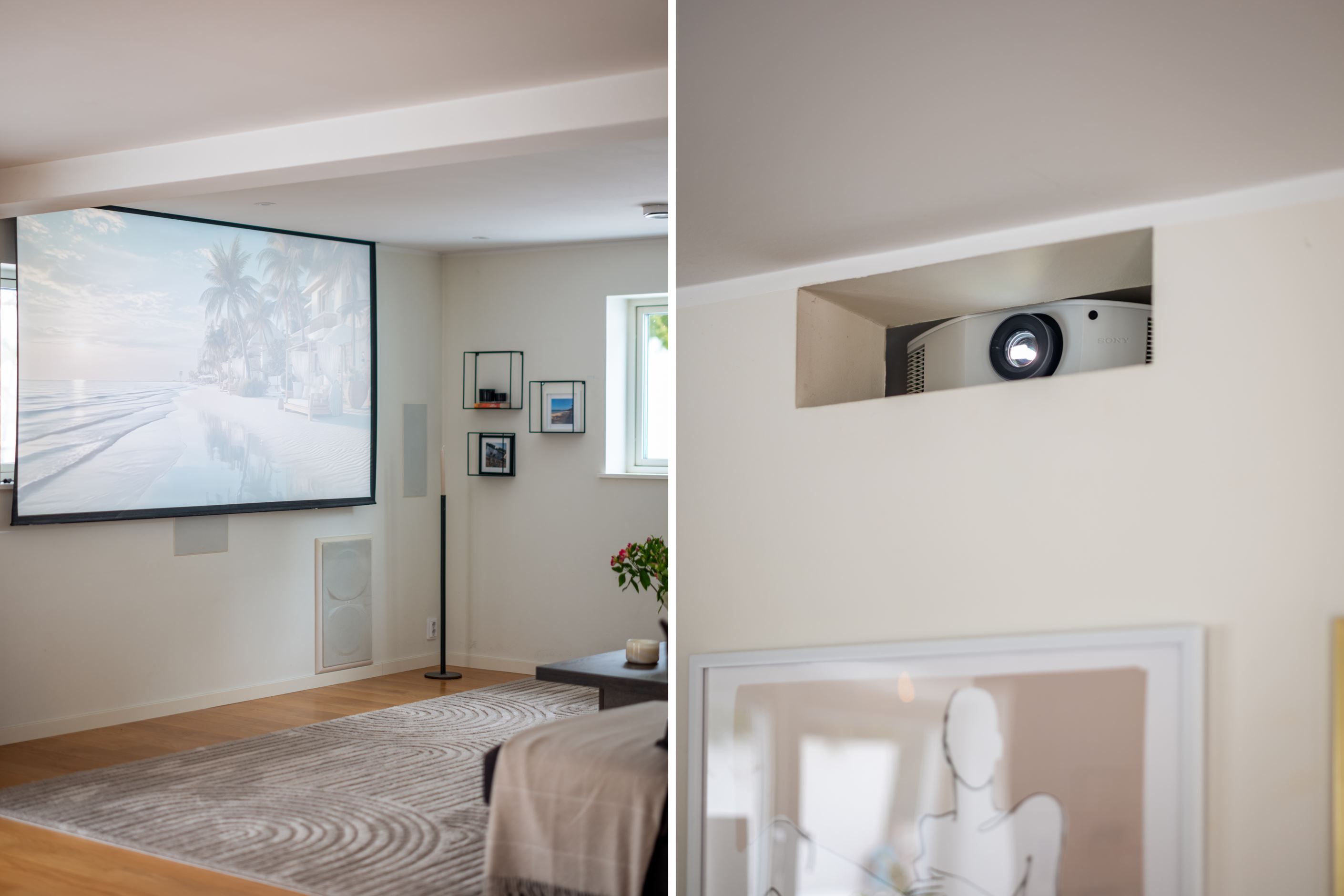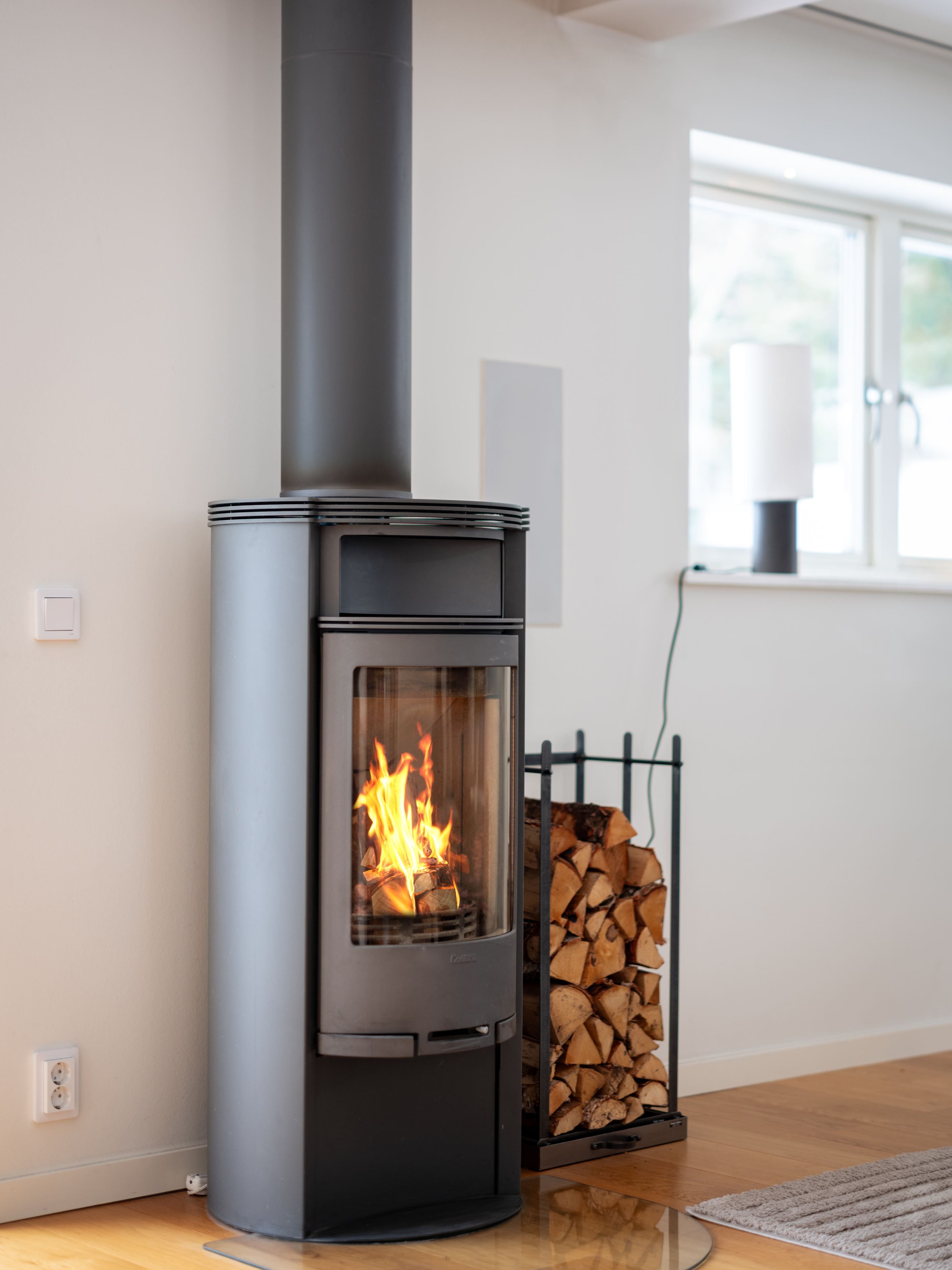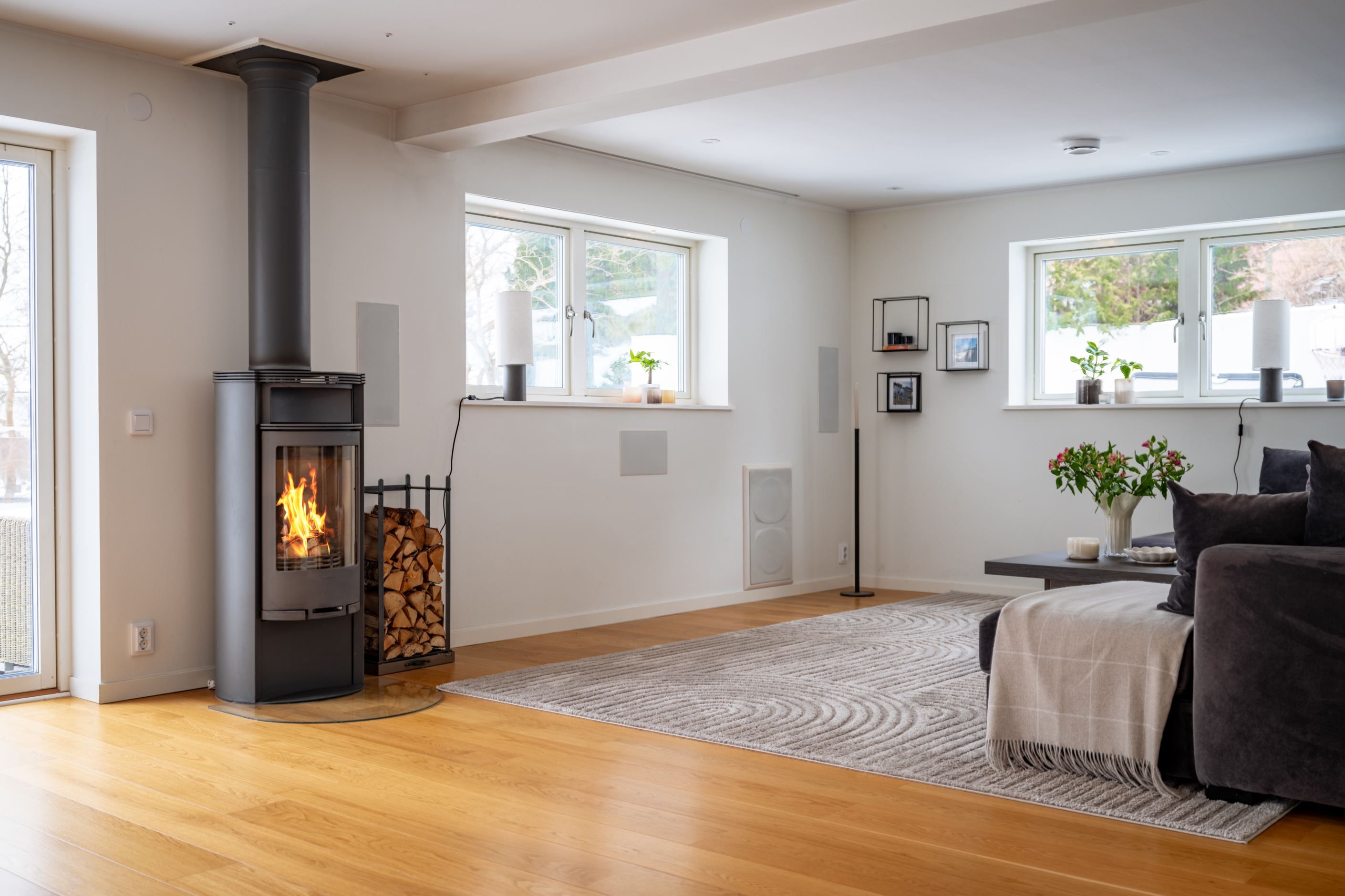 Vardagsrummet bjuder in till både vardagsliv och fest – med inbyggd bioduk, ljudsystem med högtalare samt en stämningsfull kamin från Contura (2009).