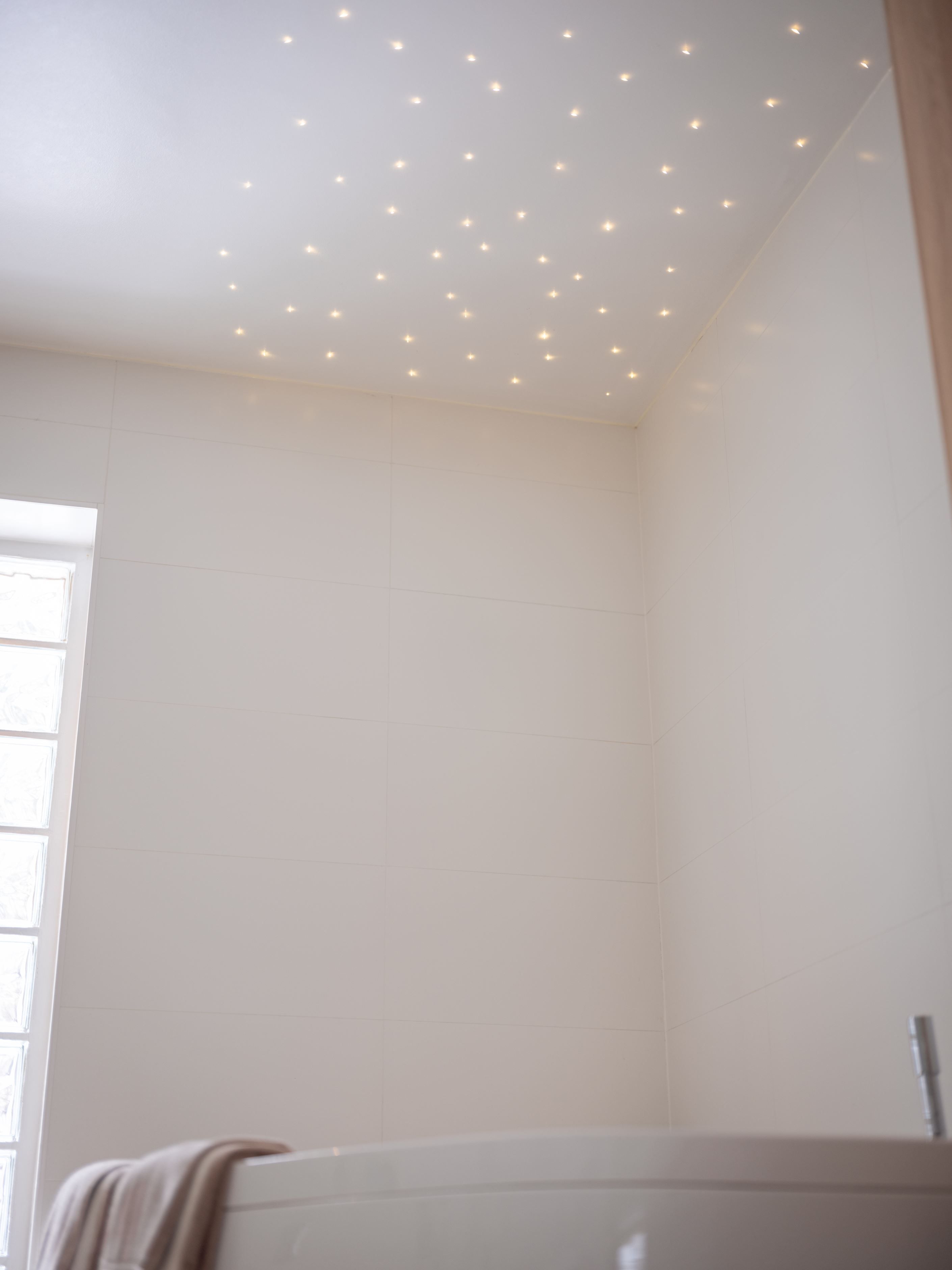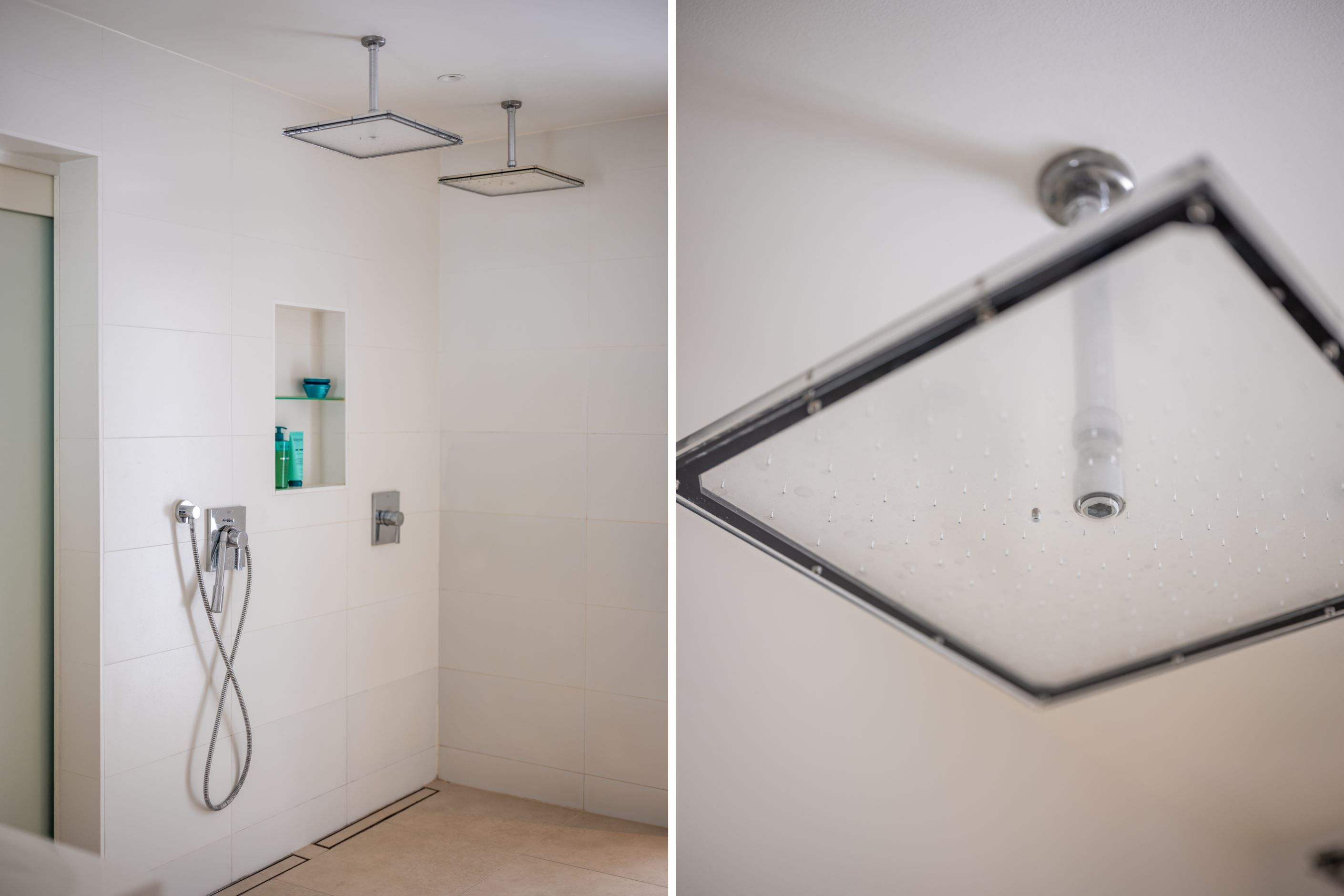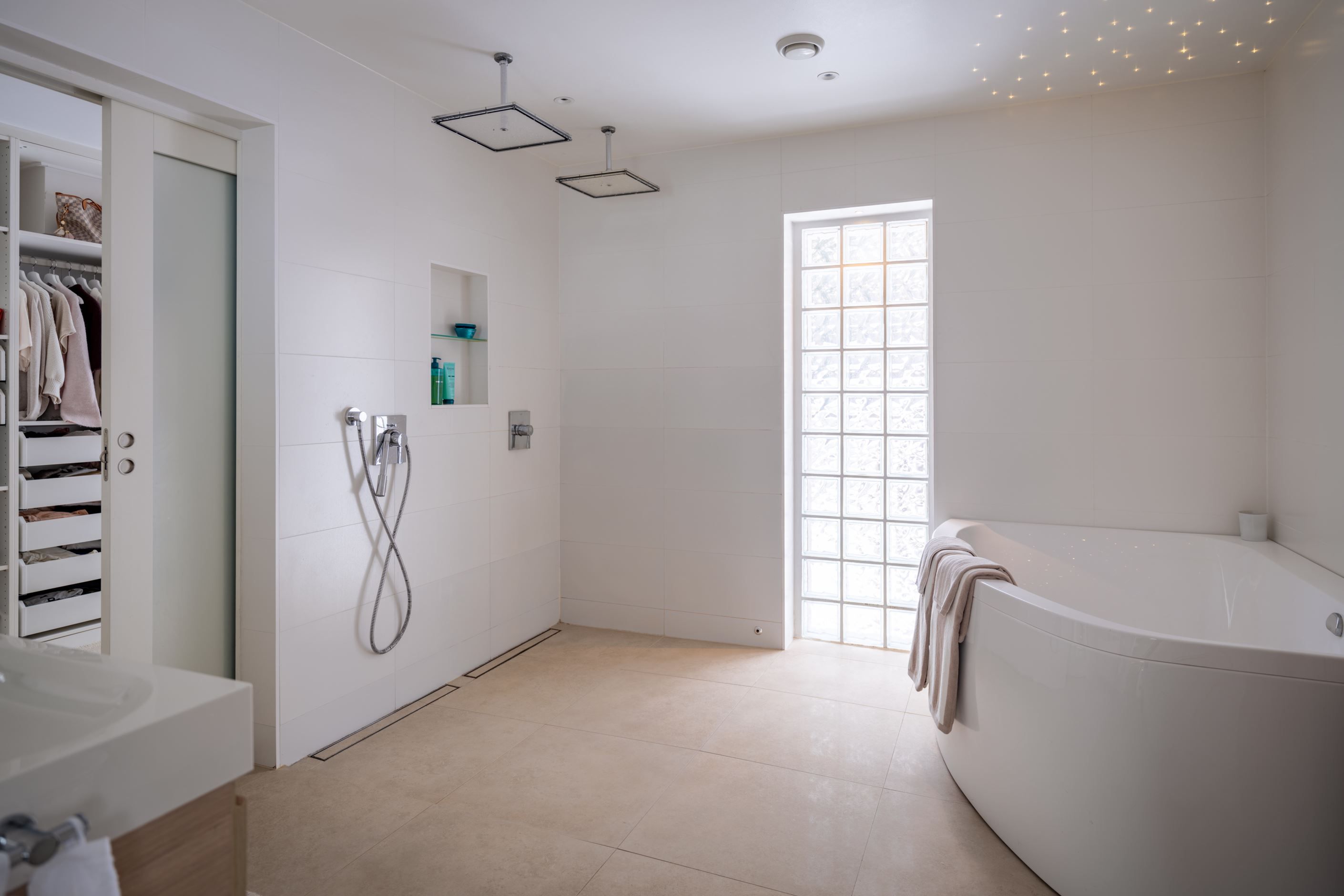 Badrummen går i sandfärgad klinker och vitt kakel, båda med vägghängda wc och takduschar. På övre plan väntar ett riktigt wellness-rum med dubbel takdusch, stort badkar från Grohe, stjärnhimmel ovan badkaret samt inbyggda högtalare även här.
