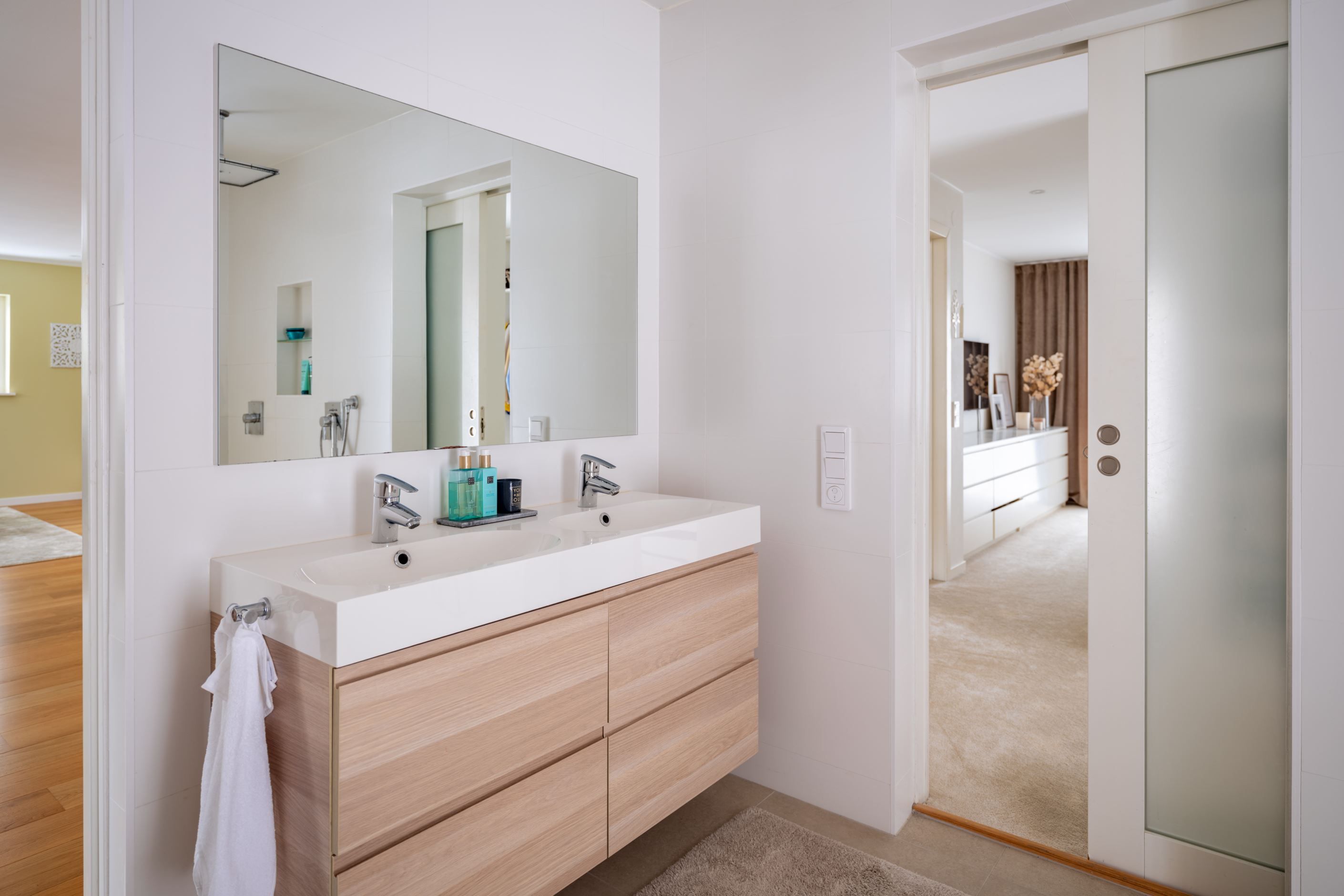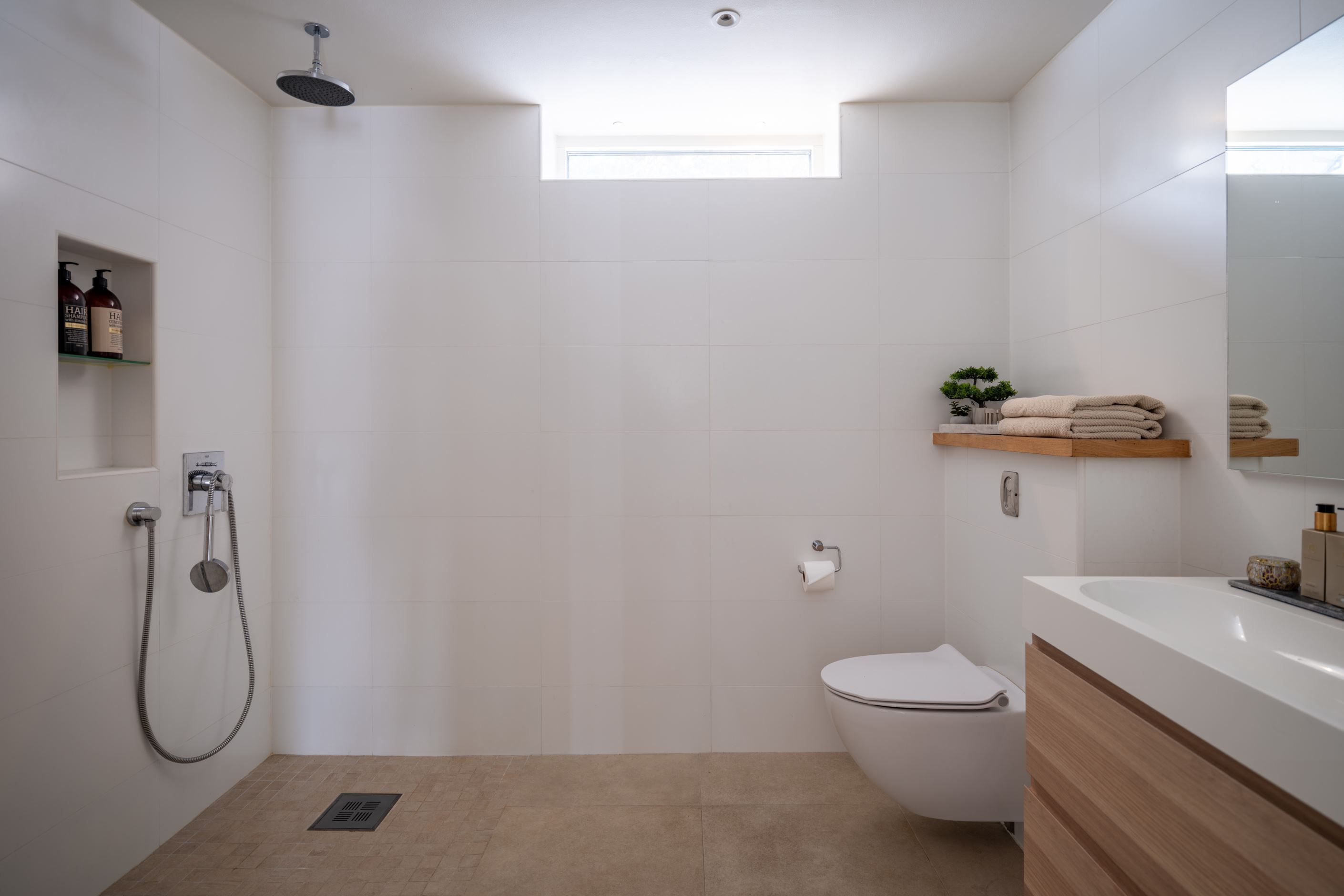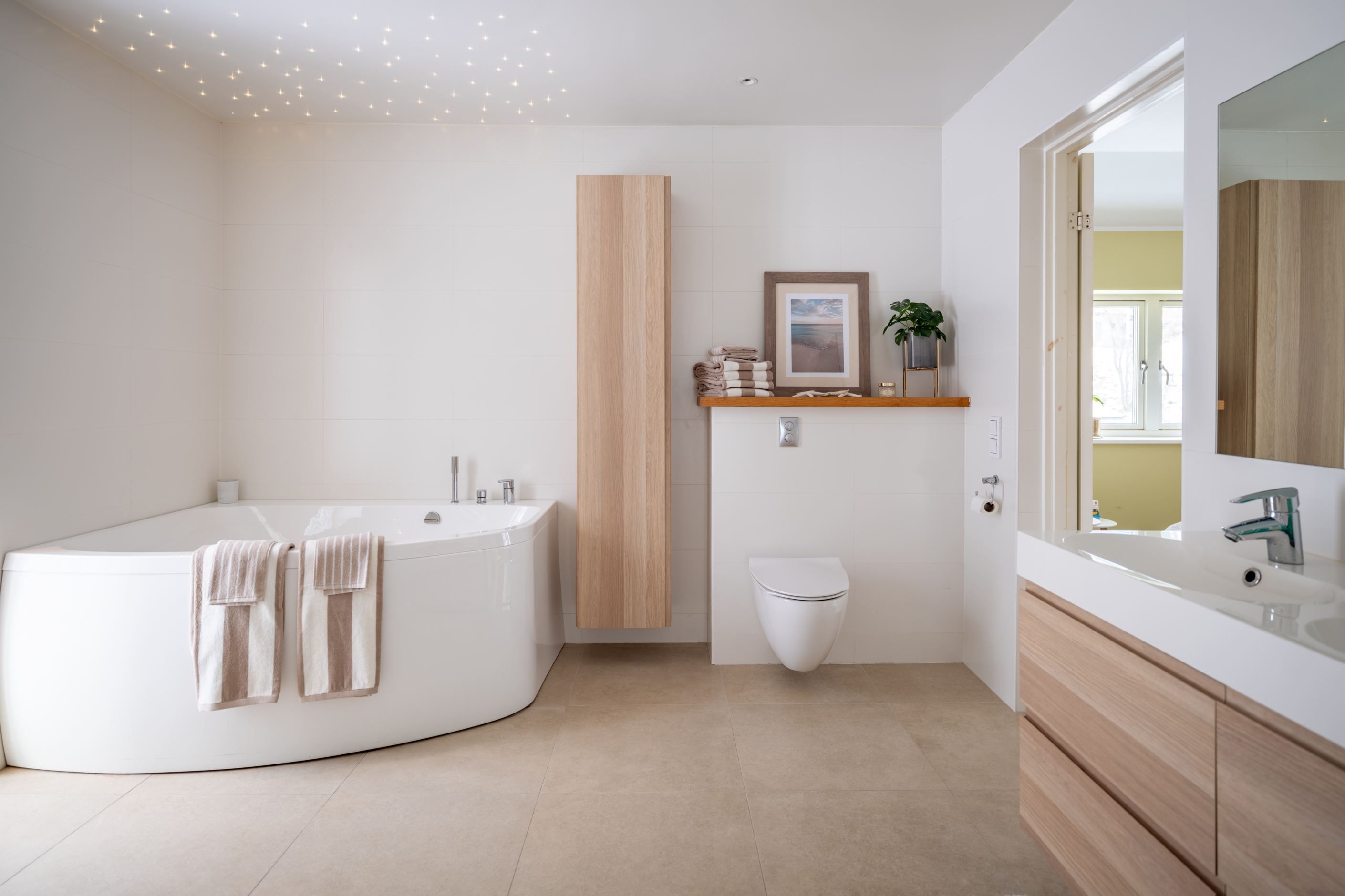 Badrummen går i sandfärgad klinker och vitt kakel, båda med vägghängda wc och takduschar. På övre plan väntar ett riktigt wellness-rum med dubbel takdusch, stort badkar från Grohe, stjärnhimmel ovan badkaret samt inbyggda högtalare även här.