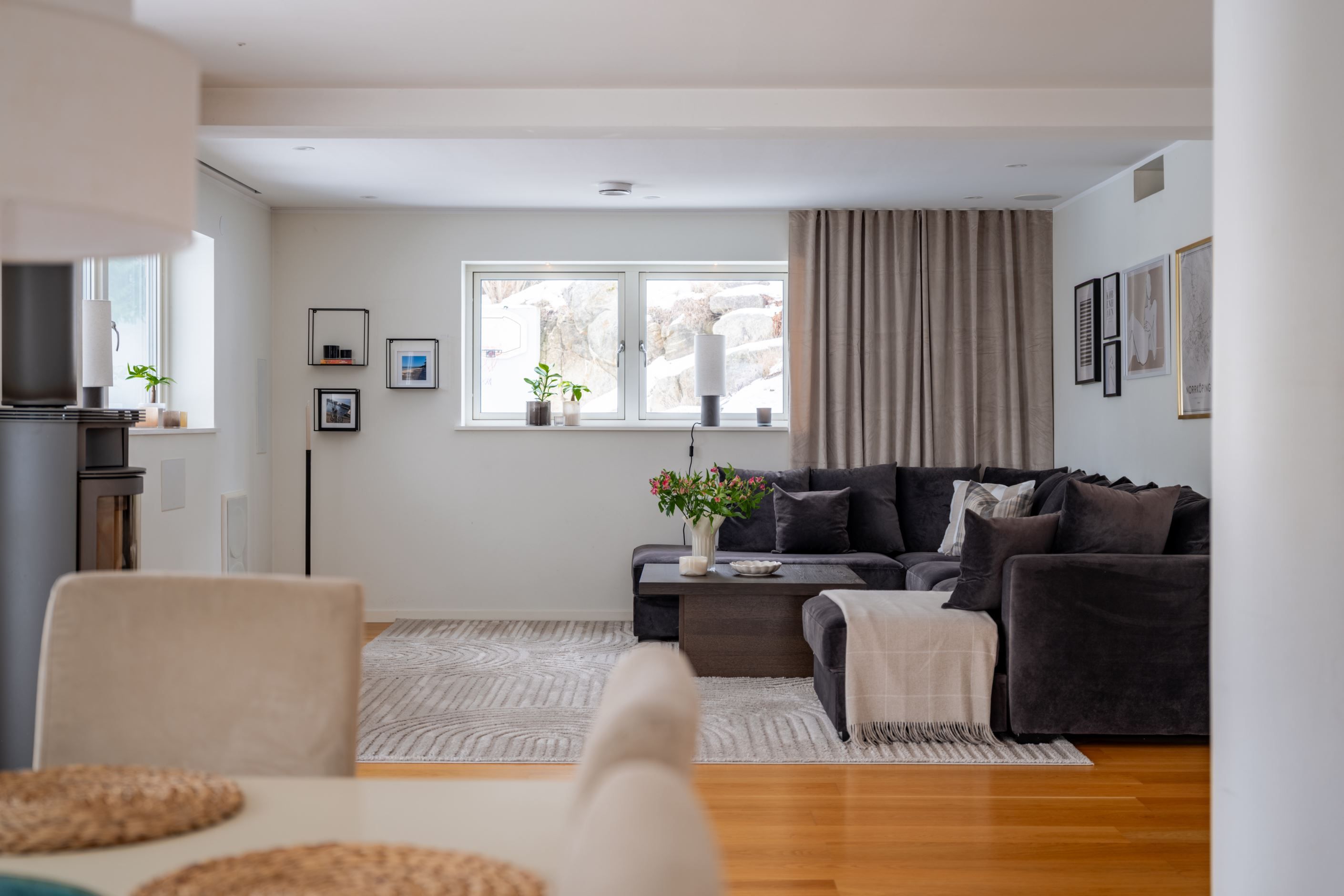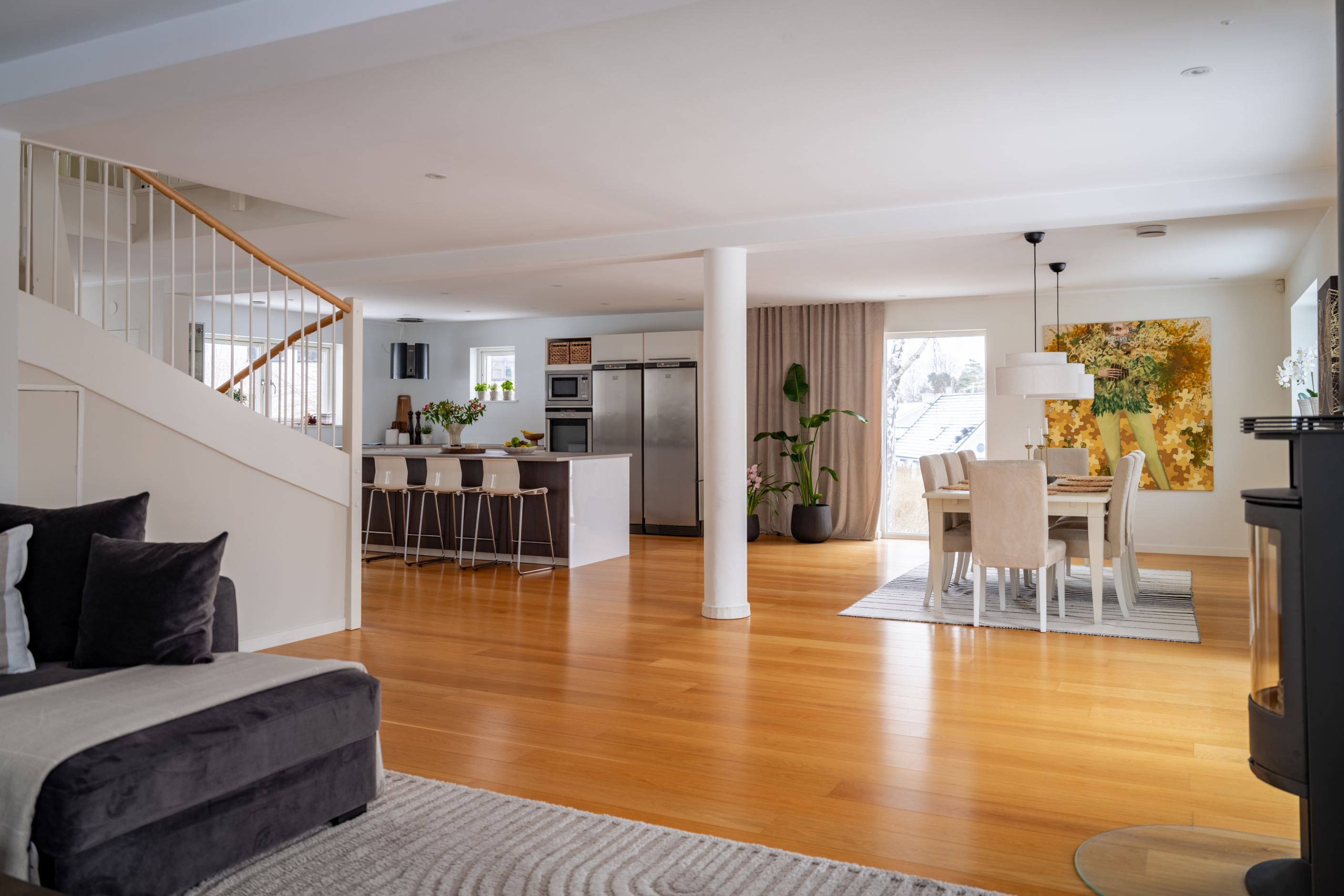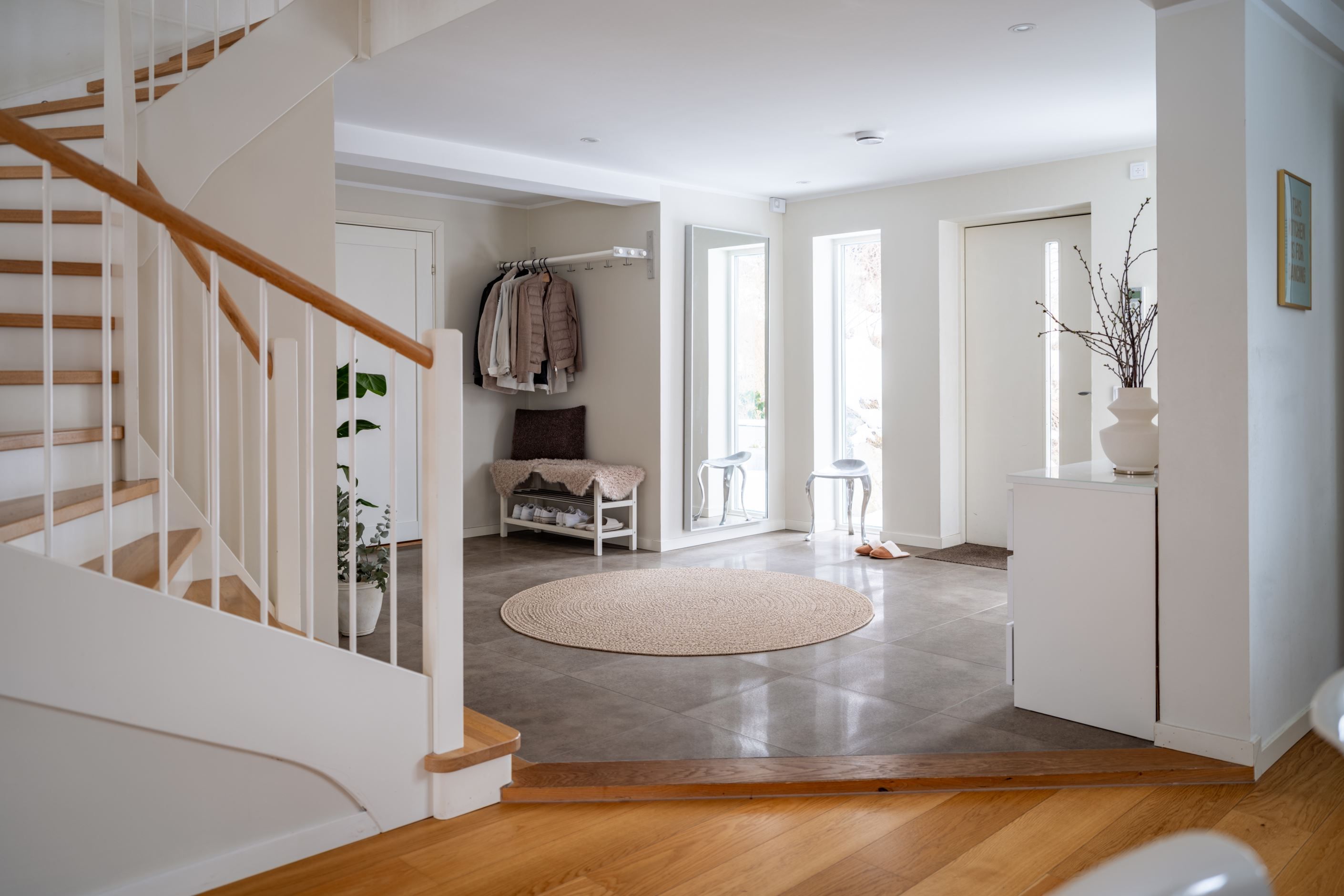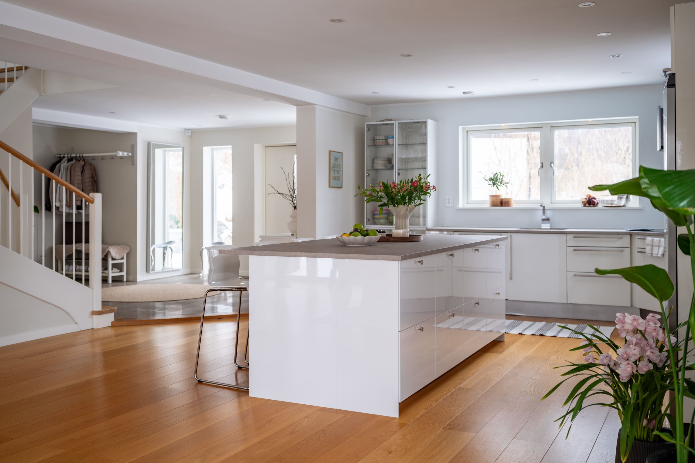 Här erbjuds generösa sällskapsytor, vattenburen golvvärme i hela huset och en genomgående sober färgsättning som skapar en harmonisk och trivsam känsla. Breda ekplankor löper genom bostaden (kan slipas tre gånger), och spotlights samt integrerad fönsterbelysning förstärker det stilrena intrycket.