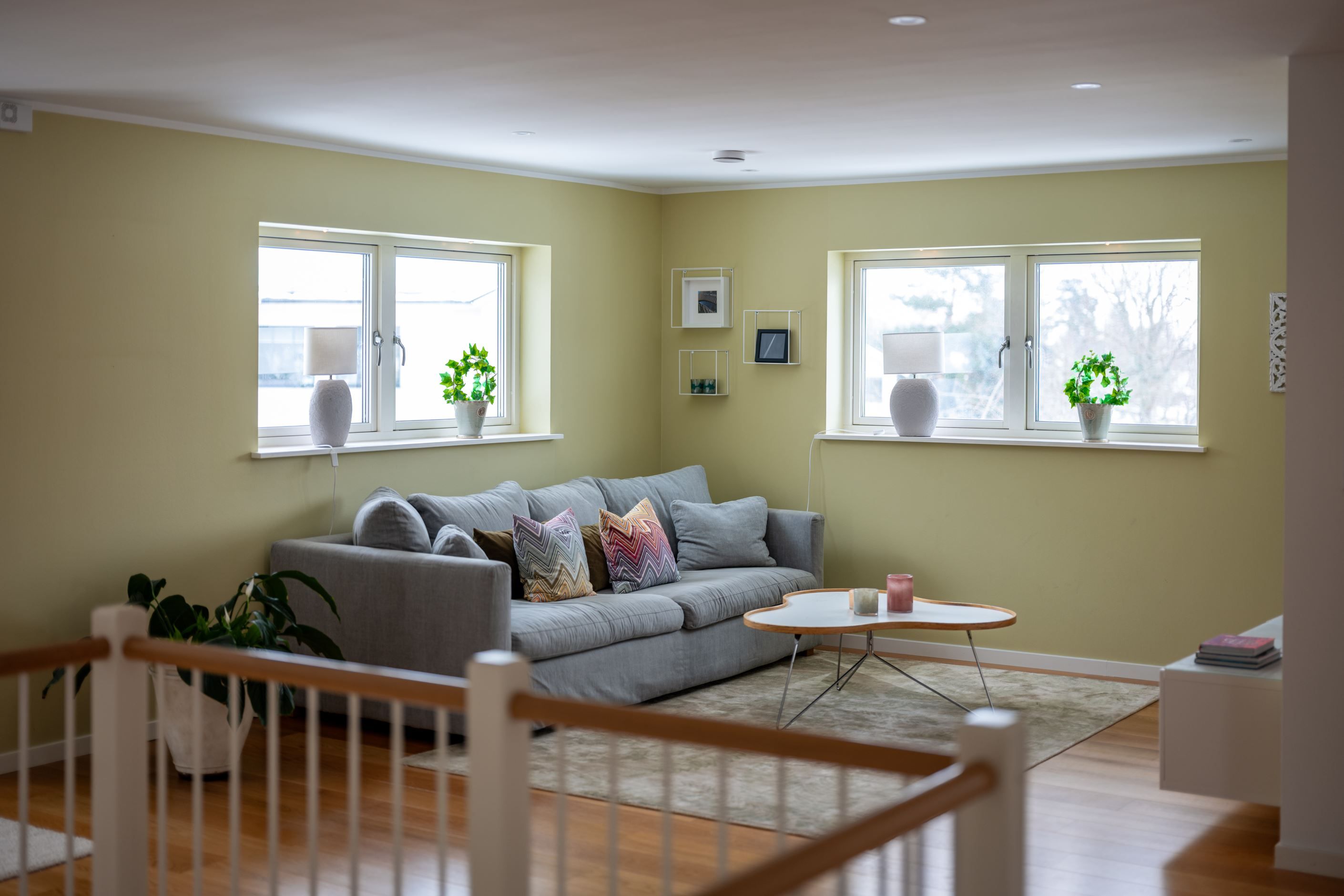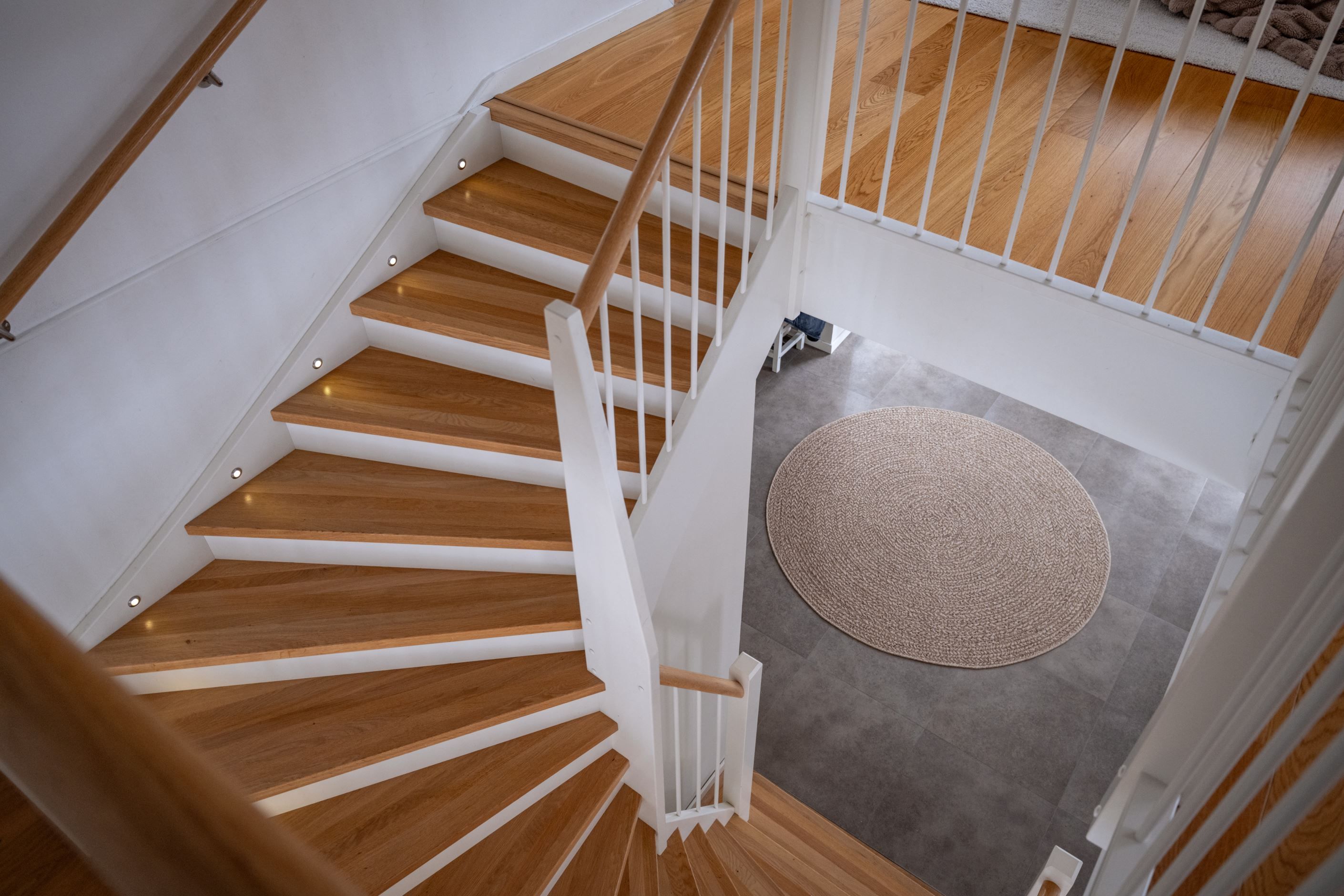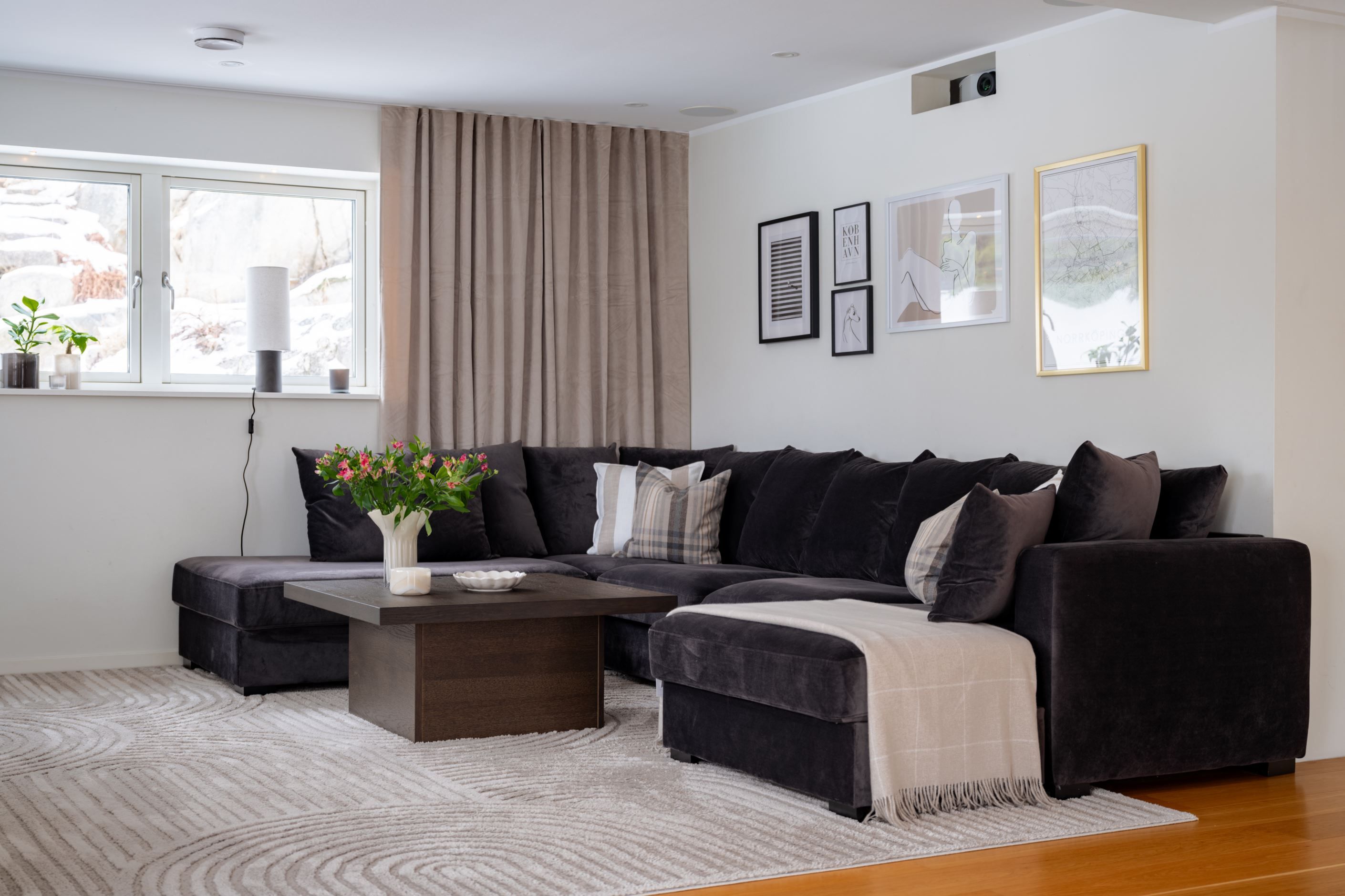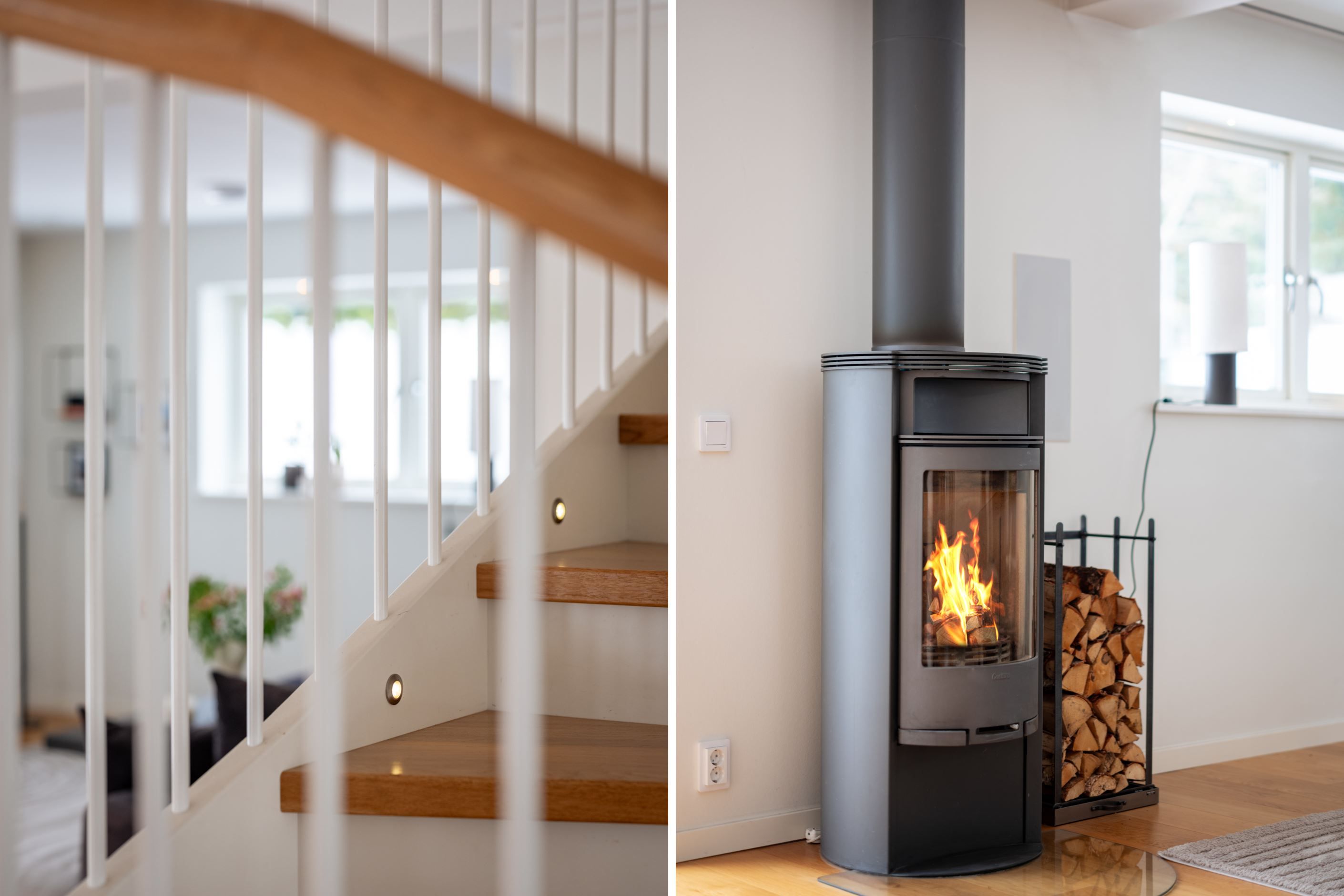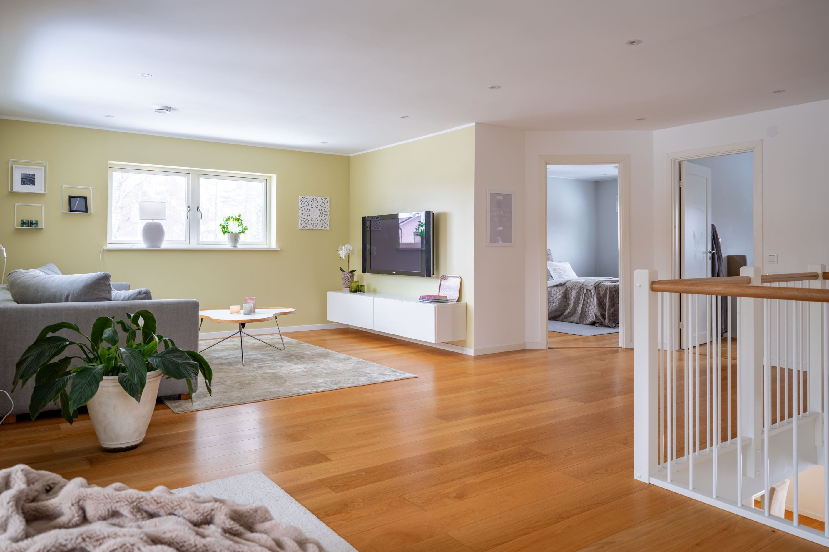 Här erbjuds generösa sällskapsytor, vattenburen golvvärme i hela huset och en genomgående sober färgsättning som skapar en harmonisk och trivsam känsla. Breda ekplankor löper genom bostaden (kan slipas tre gånger), och spotlights samt integrerad fönsterbelysning förstärker det stilrena intrycket.