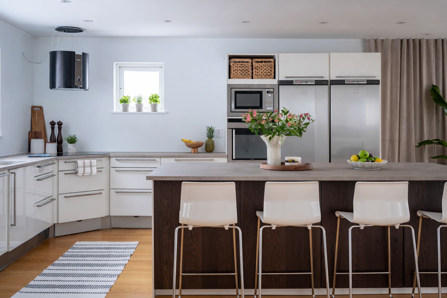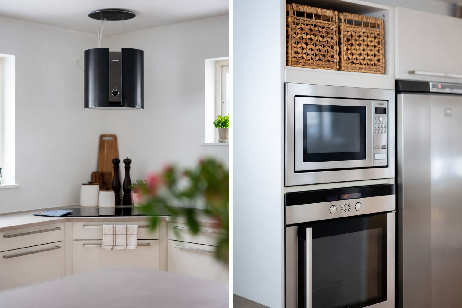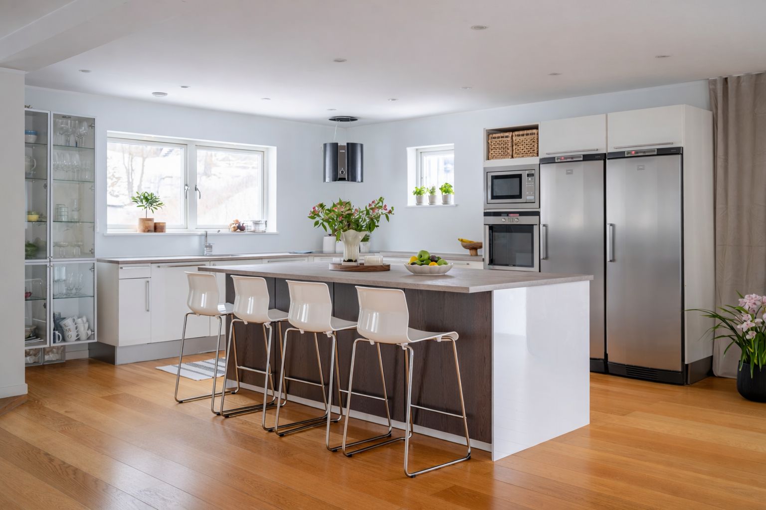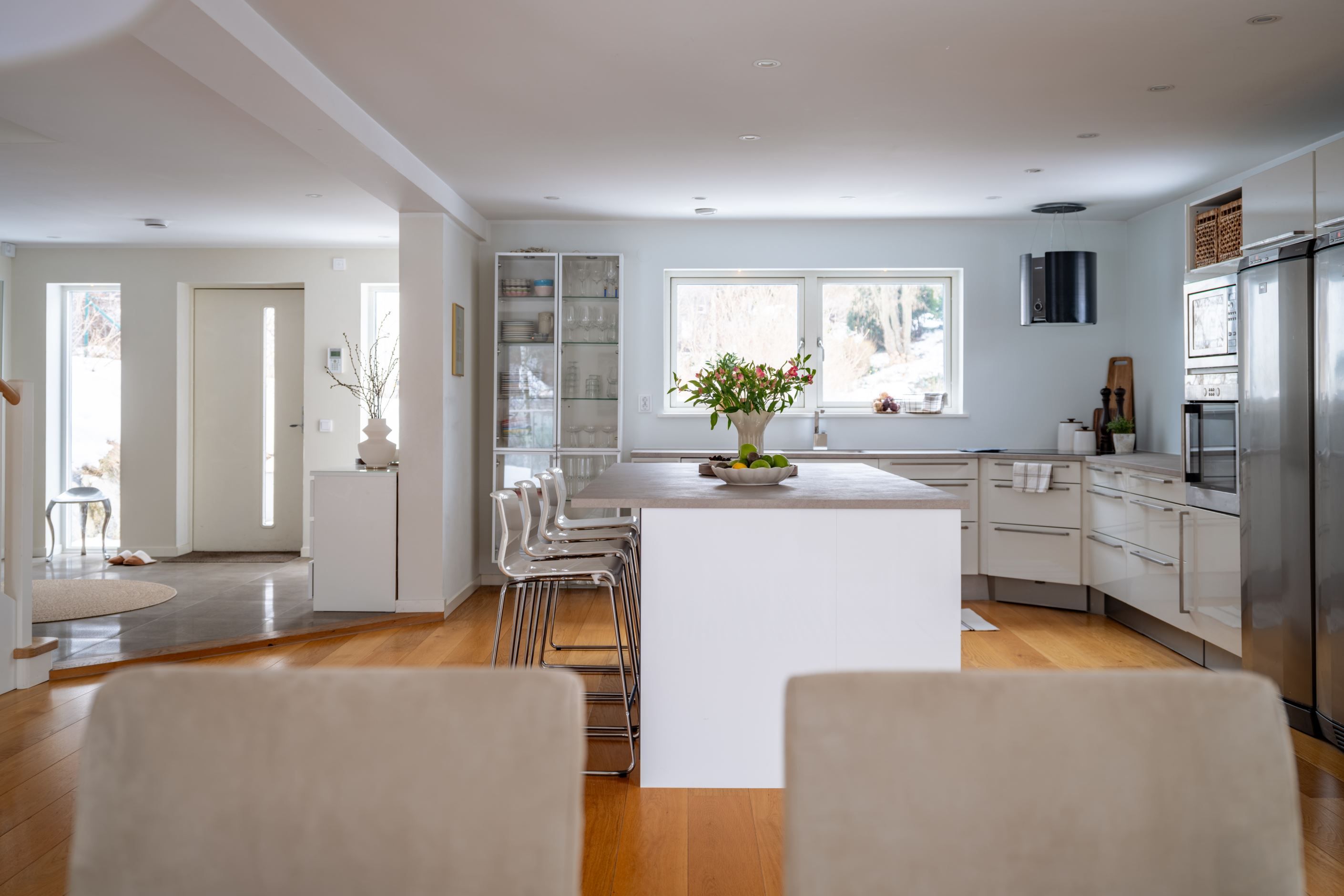 Köket är smakfullt utformat med stomme från HTH samt kompletterad med en köksö 2026, generösa arbetsytor och full maskinell utrustning – en naturlig samlingsplats för familj och vänner.