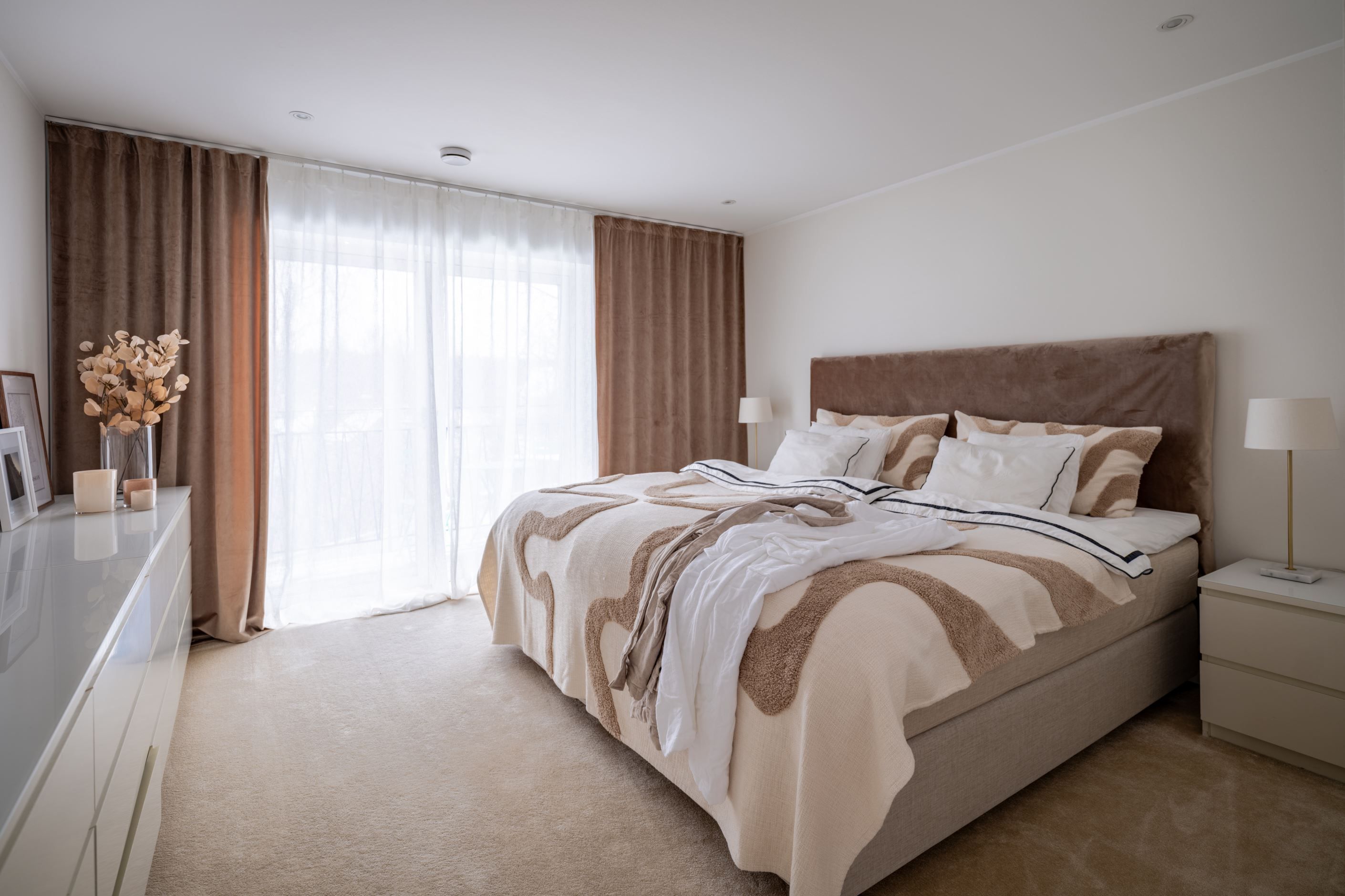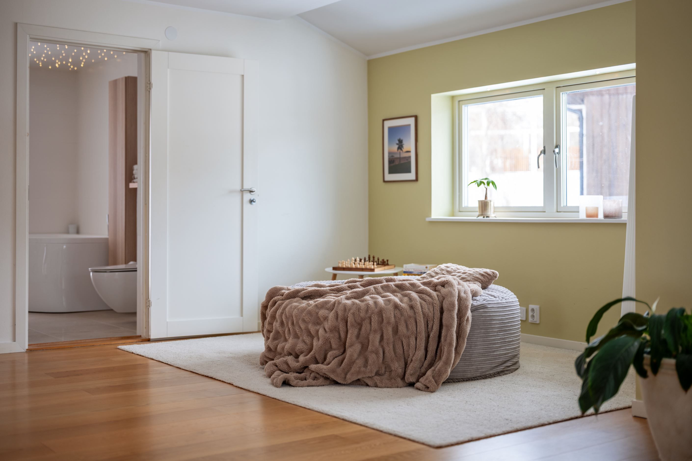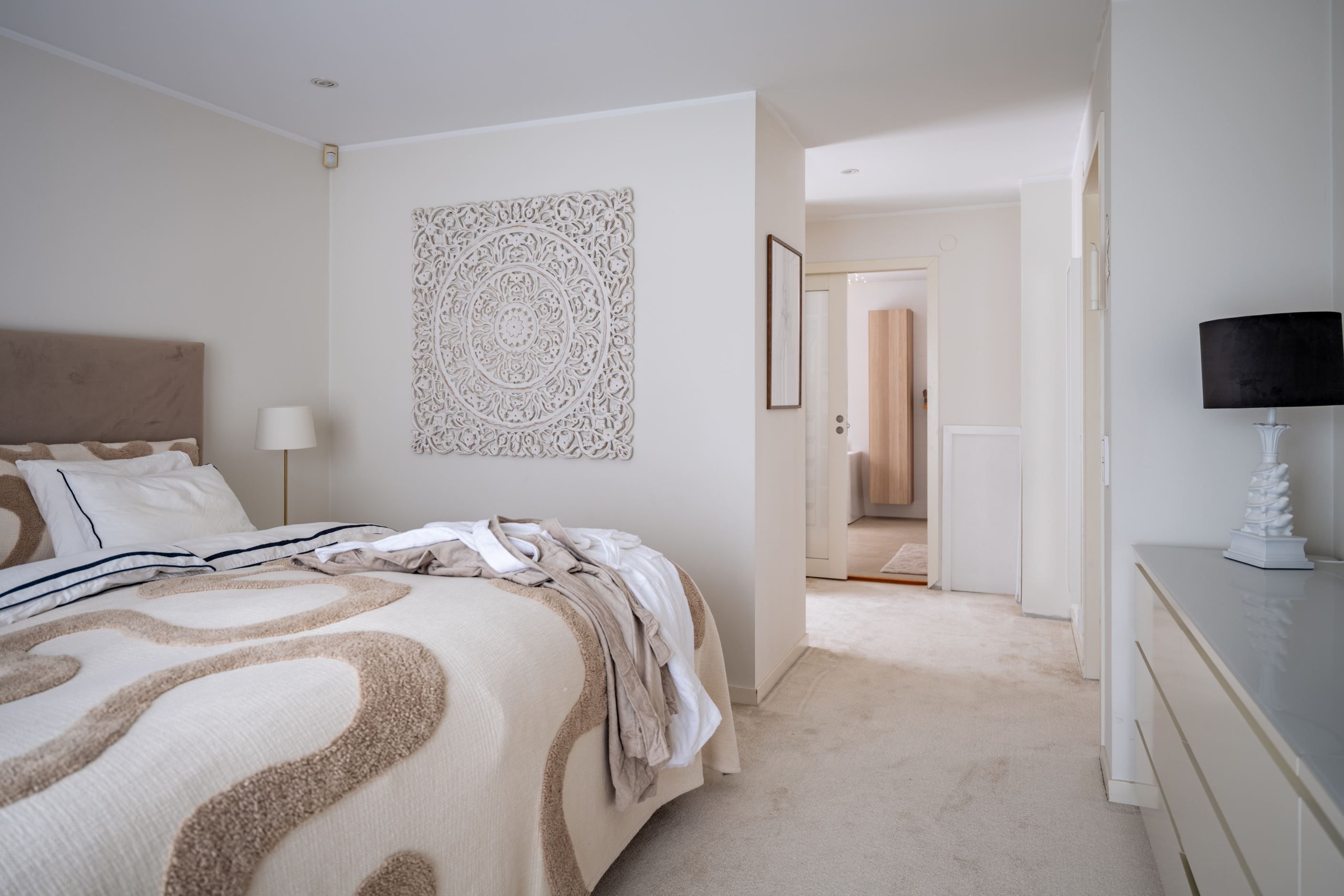 Master bedroom med heltäckningsmatta, walk-in-closet och direkt access till badrummet – en hotellkänsla i vardagen.