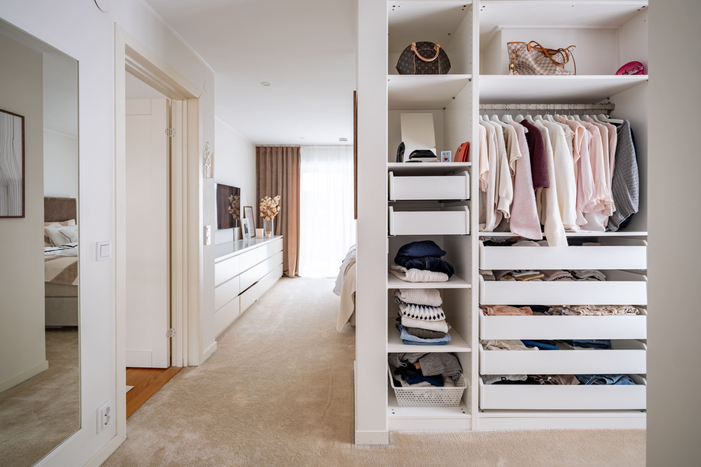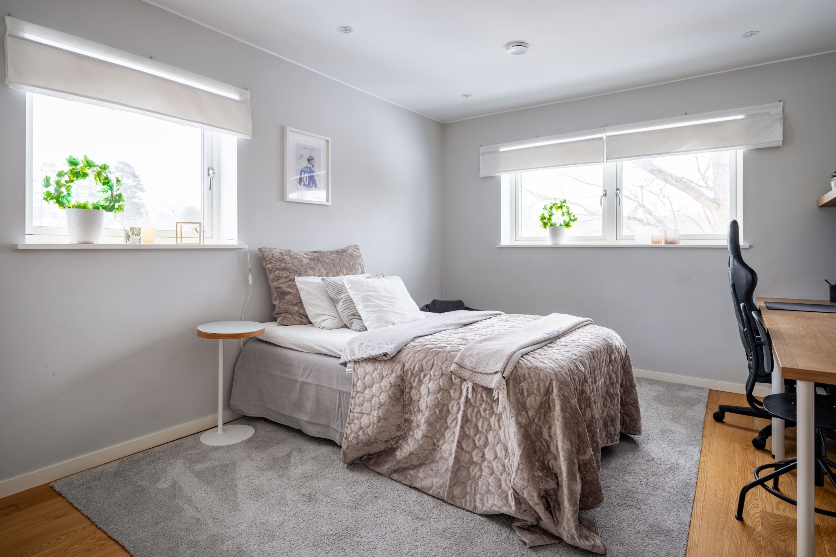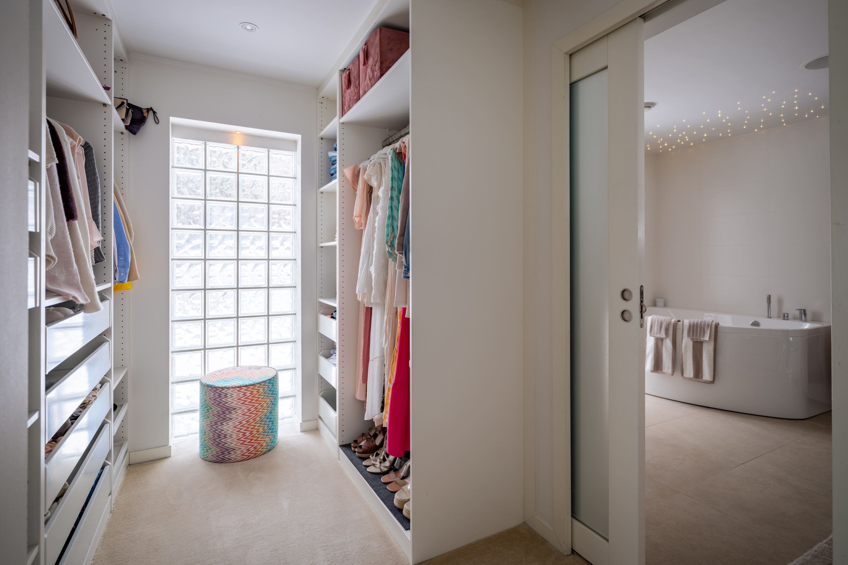 Master bedroom med heltäckningsmatta, walk-in-closet och direkt access till badrummet – en hotellkänsla i vardagen.