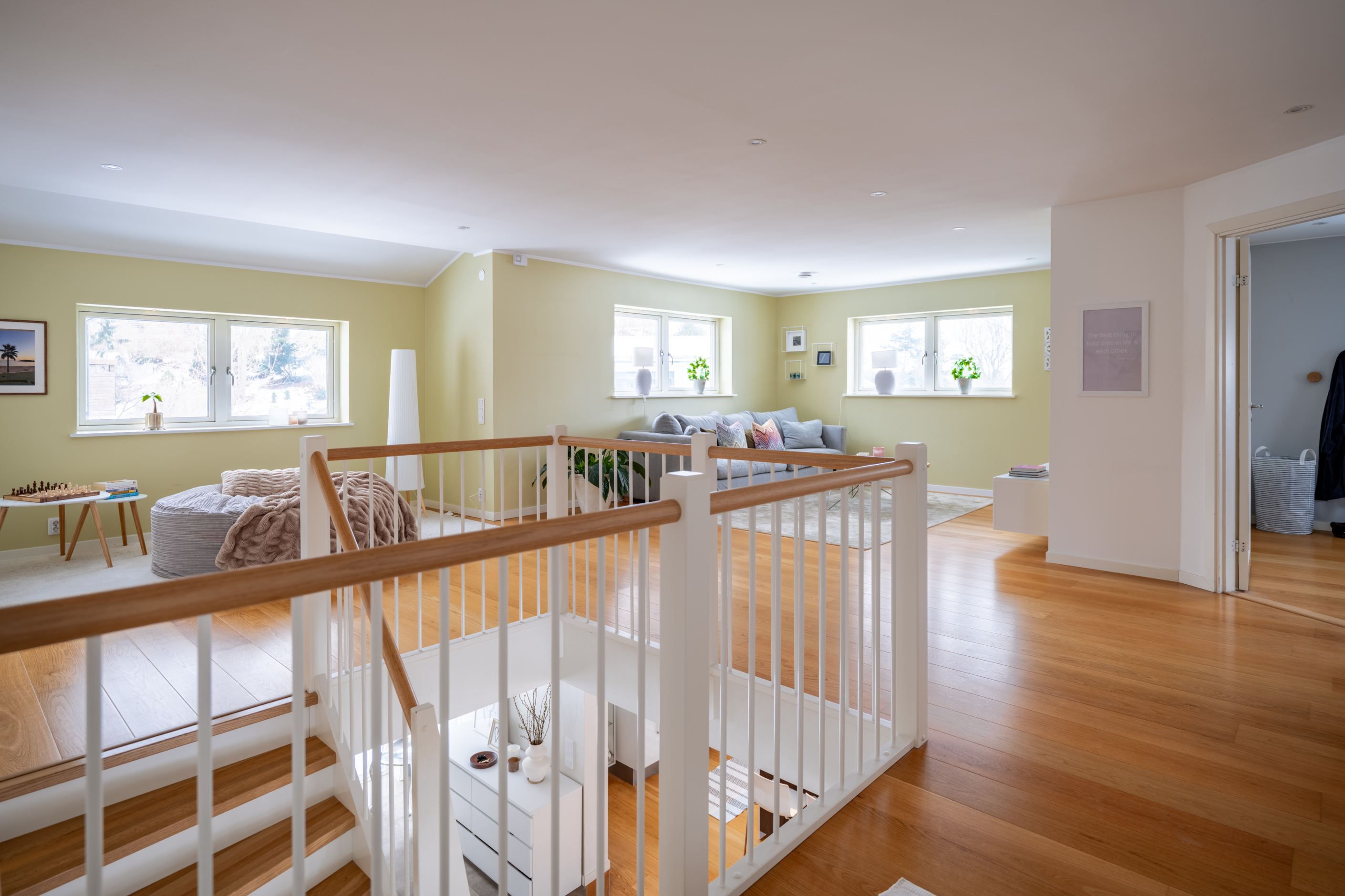 Övre plan erbjuder stora öppna ytor där väggarna inte är bärande – här kan planlösningen enkelt anpassas efter behov och fler sovrum skapas.