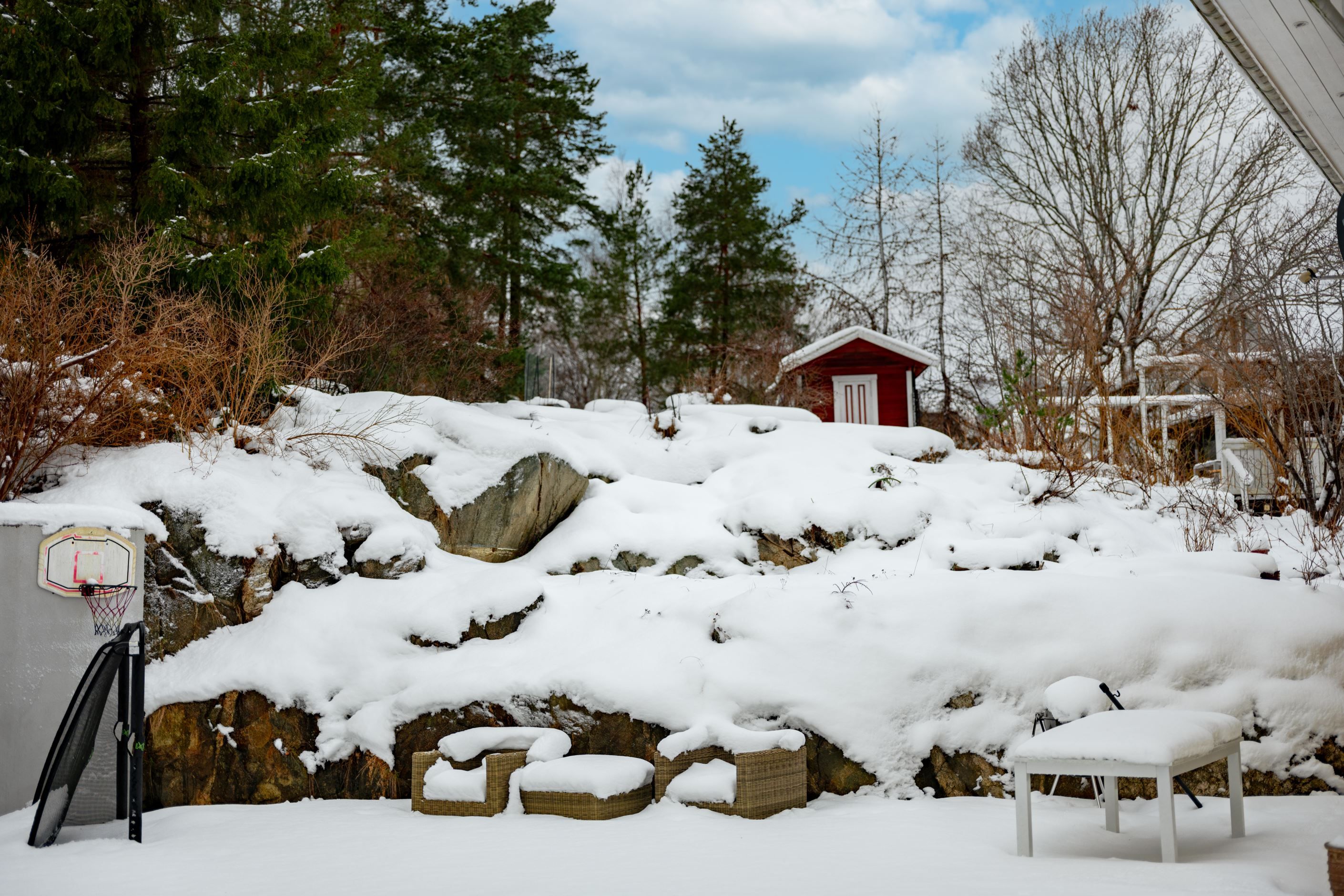 Den stora uteplatsen är belagd med generösa stenplattor (60x50) och ramas in av glasräcken med integrerad belysning. Fasadbelysning runt hela huset skapar en exklusiv känsla kvällstid utan att störa inomhusmiljön.