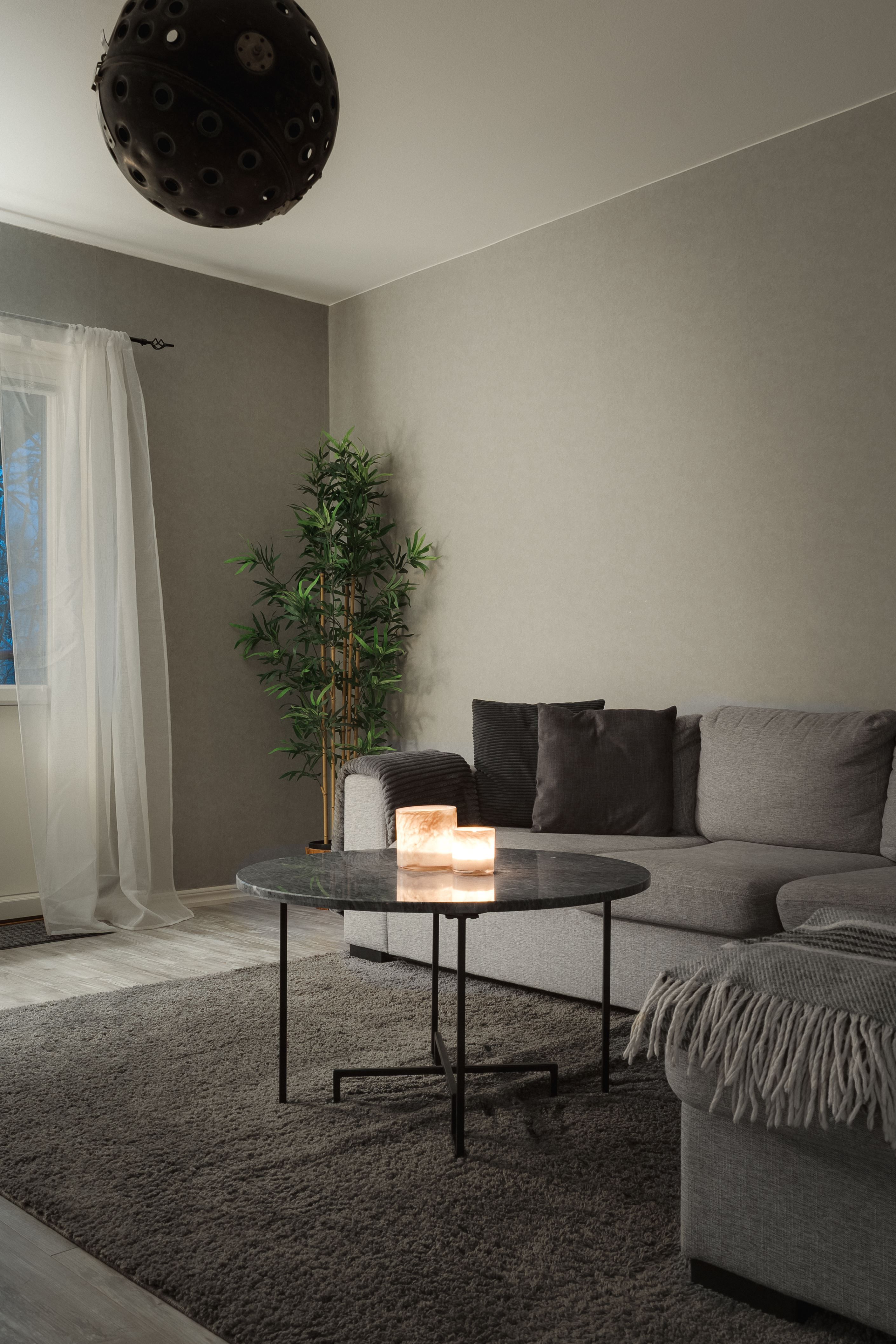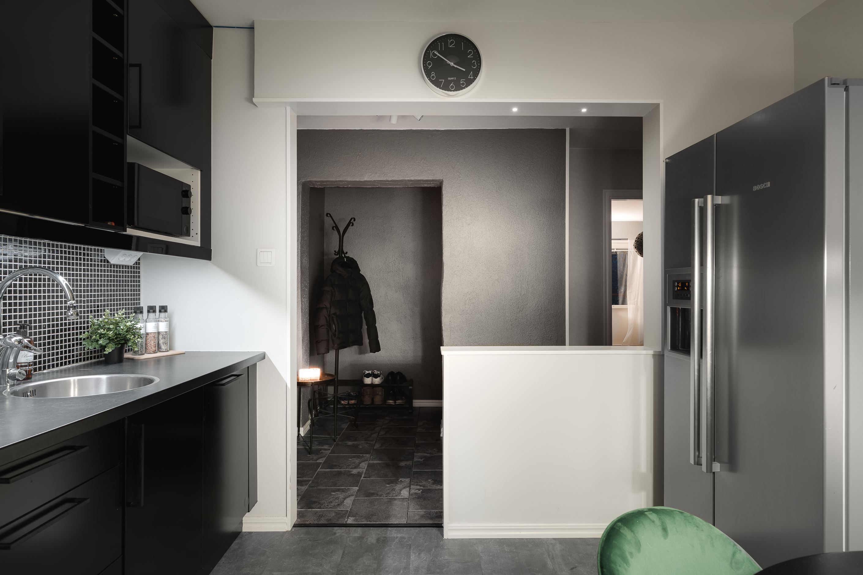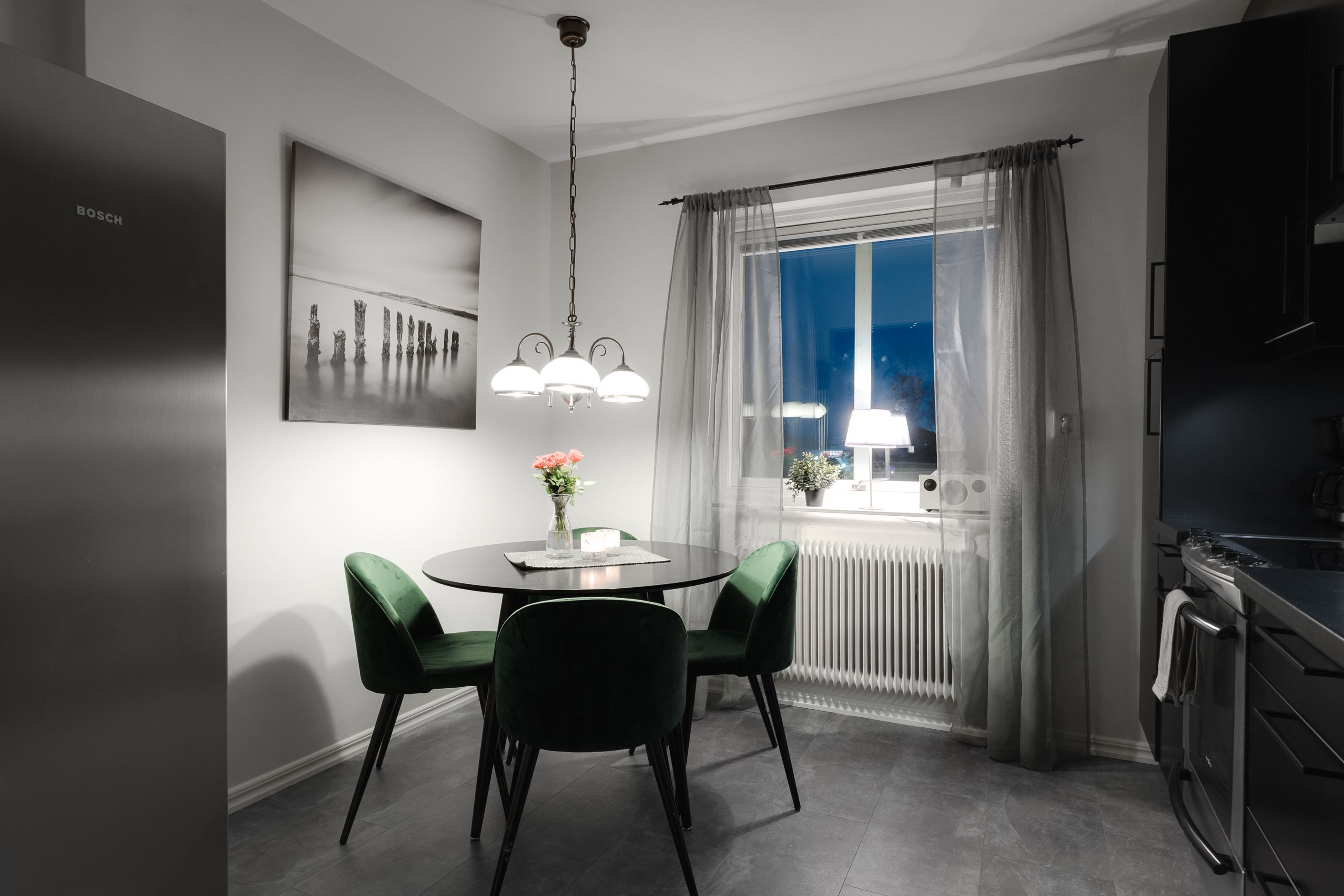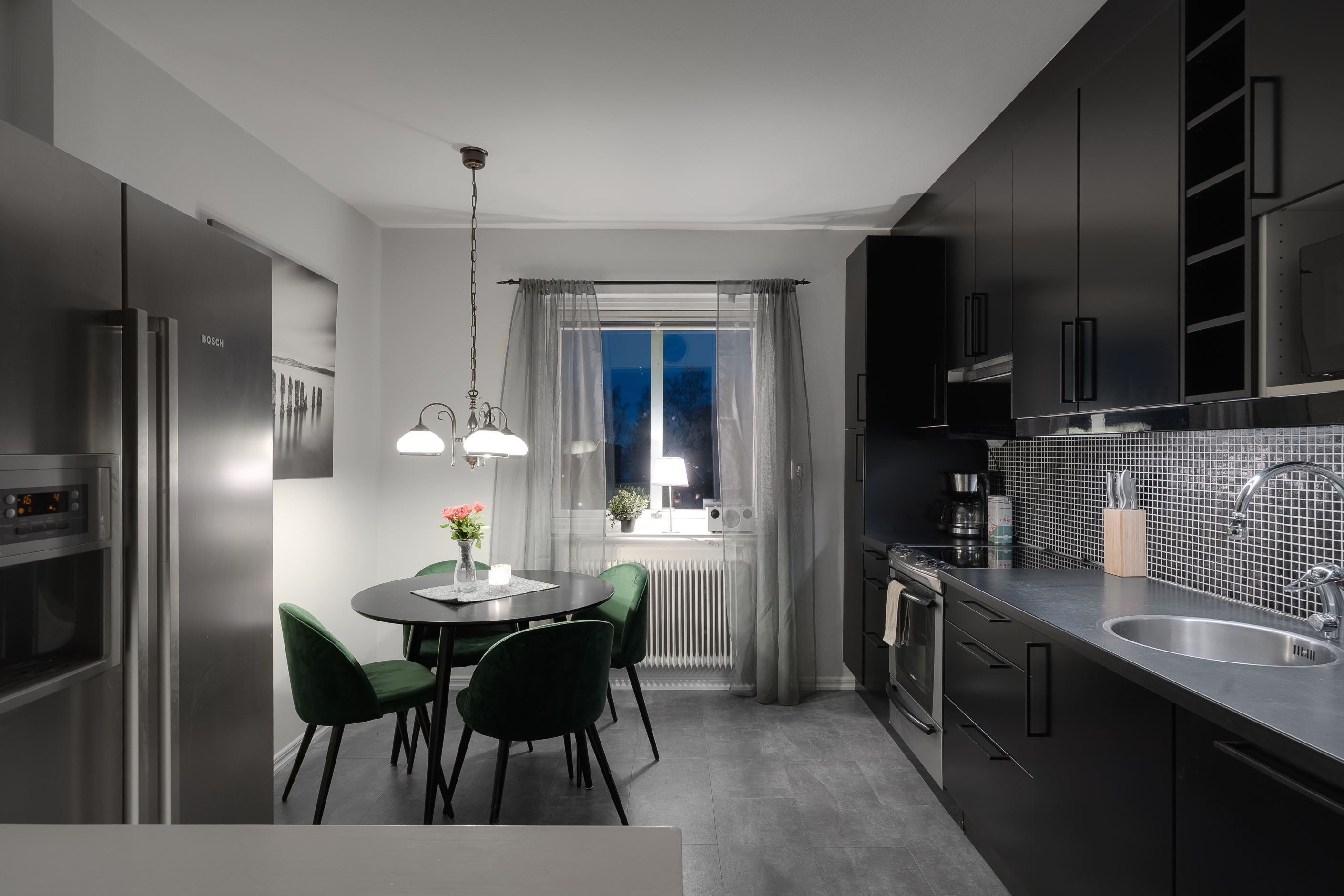 När du kliver in möts du av en rymlig och välkomnande hall med goda avhängningsmöjligheter. Det moderna köket i elegant svart design erbjuder gott om arbetsyta och plats för ett större matbord – idealiskt för både vardagsmiddagar och sociala tillställningar.