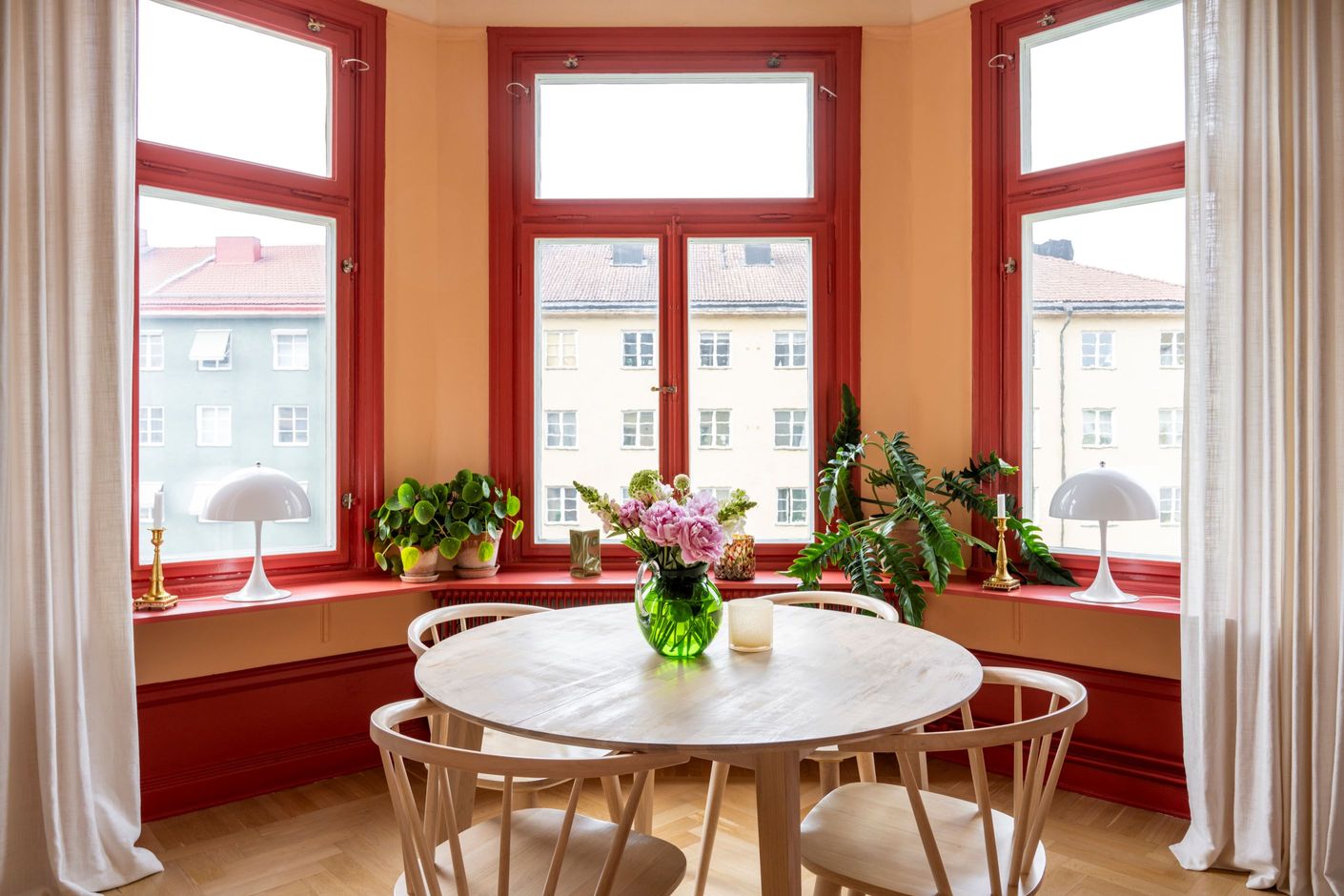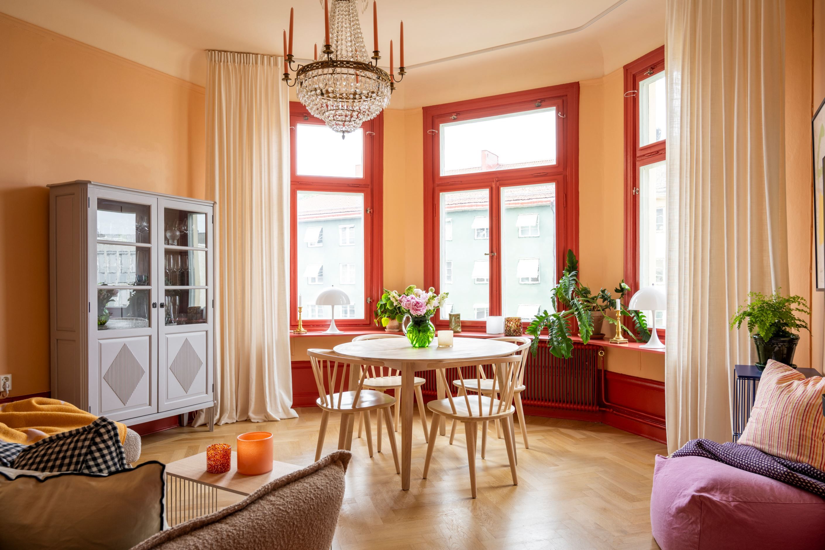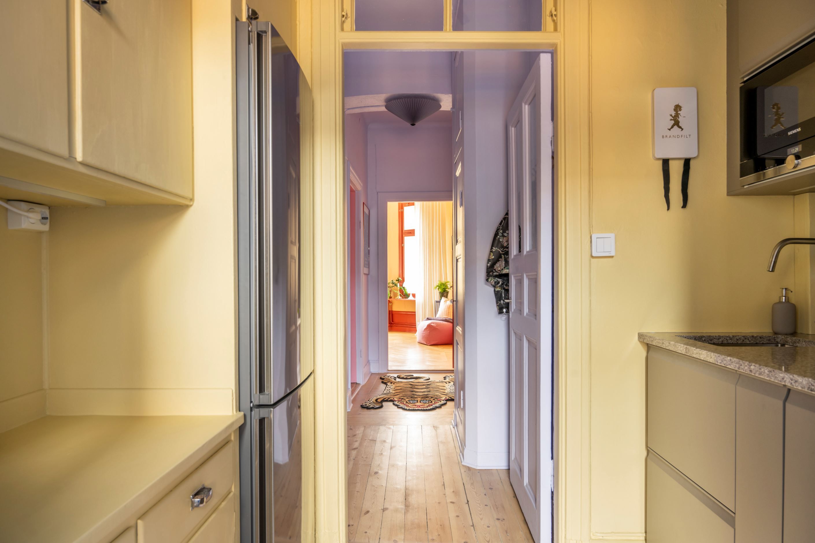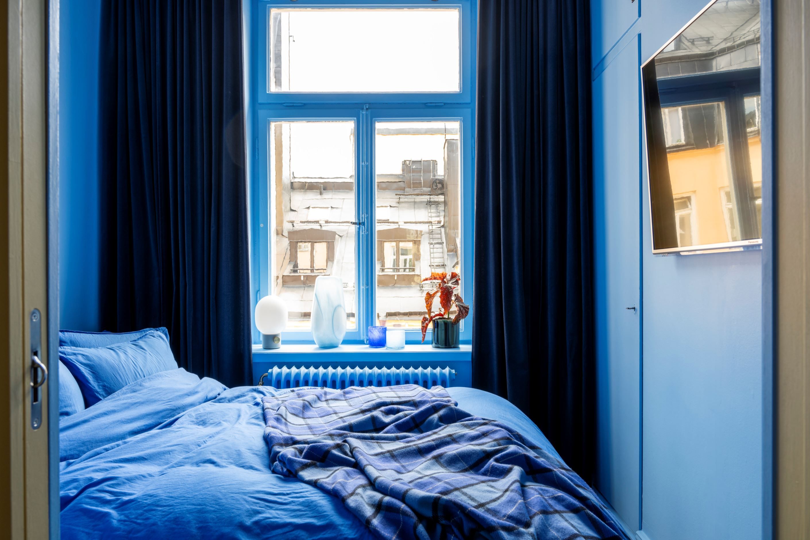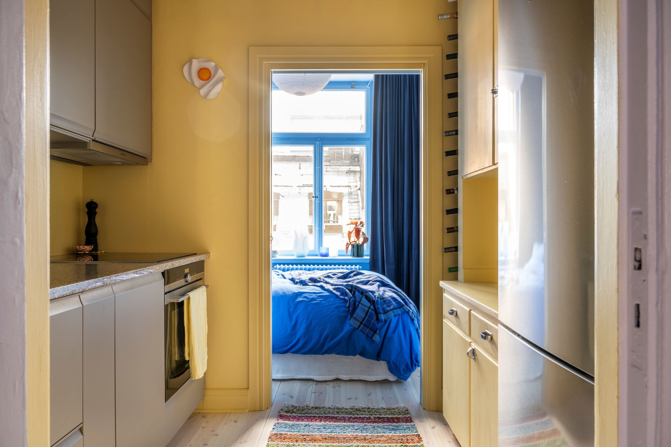 En färgklick bland det vita och beige! Välkomna till ett hem där ert leende spricker upp så fort ni har klivit i hallen. Ett hem som präglas av karaktäristiska drag såsom högt i tak, vackert trägolv och fiskbensparkett med höga socklar och pampigt burspråk! Köket är omsorgsfullt renoverat (2023) med harmonisk färgsättning, en djupare bänkskiva i stilsäker sten och väldigt yteffektivt. Här har man valt att bevara ett serveringsskåp som smälter samman i perfekt symbios med de moderna inslagen. Vidare in till sovrummet sover ni i lugnt läge mot gård. I detta rum kliver ni bokstavligt talat in i himlen med blått omkring i er på väggarna och utanför fönstret har ni kontakt med den blå himlen och takåsar. Badrummet är ljust och fräscht, stambytt 2018. I hallen finns klädkammare som är inmålade i väggarnas färger för förvaring. Vidare in till vardagsrummet möts ni av det pampiga burspråket med flertalet fönster. Ett magiskt ljus skänks över matplatsen. Utsikten består av vackra fasader och tak, trädtoppar och himmel. Rummet rymmer enkelt en större soffa, soffbord, TV och annan möbel.