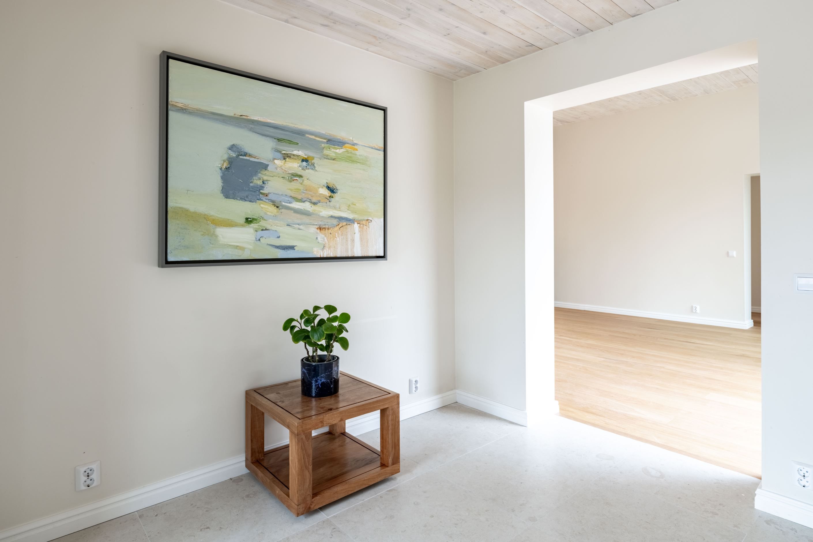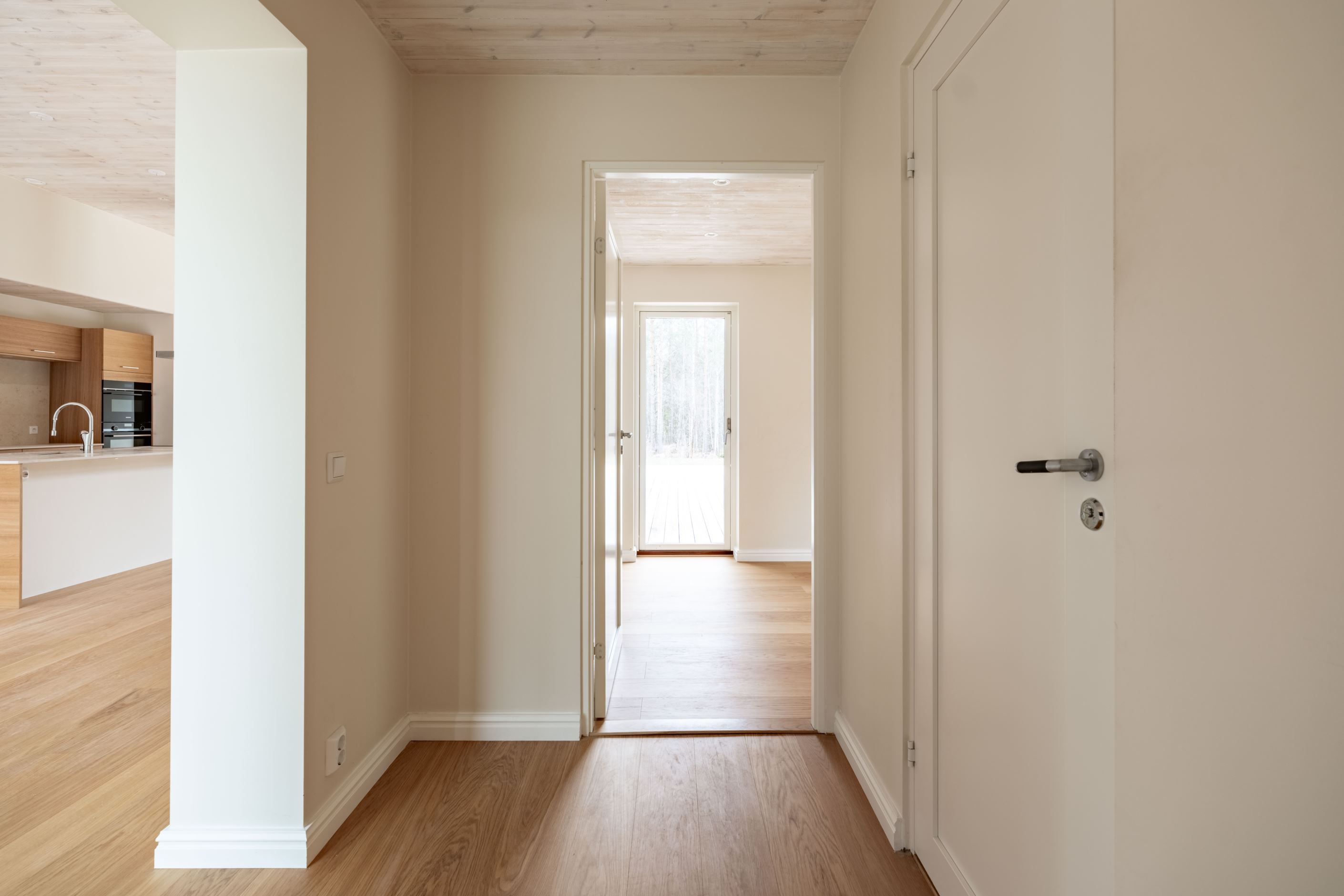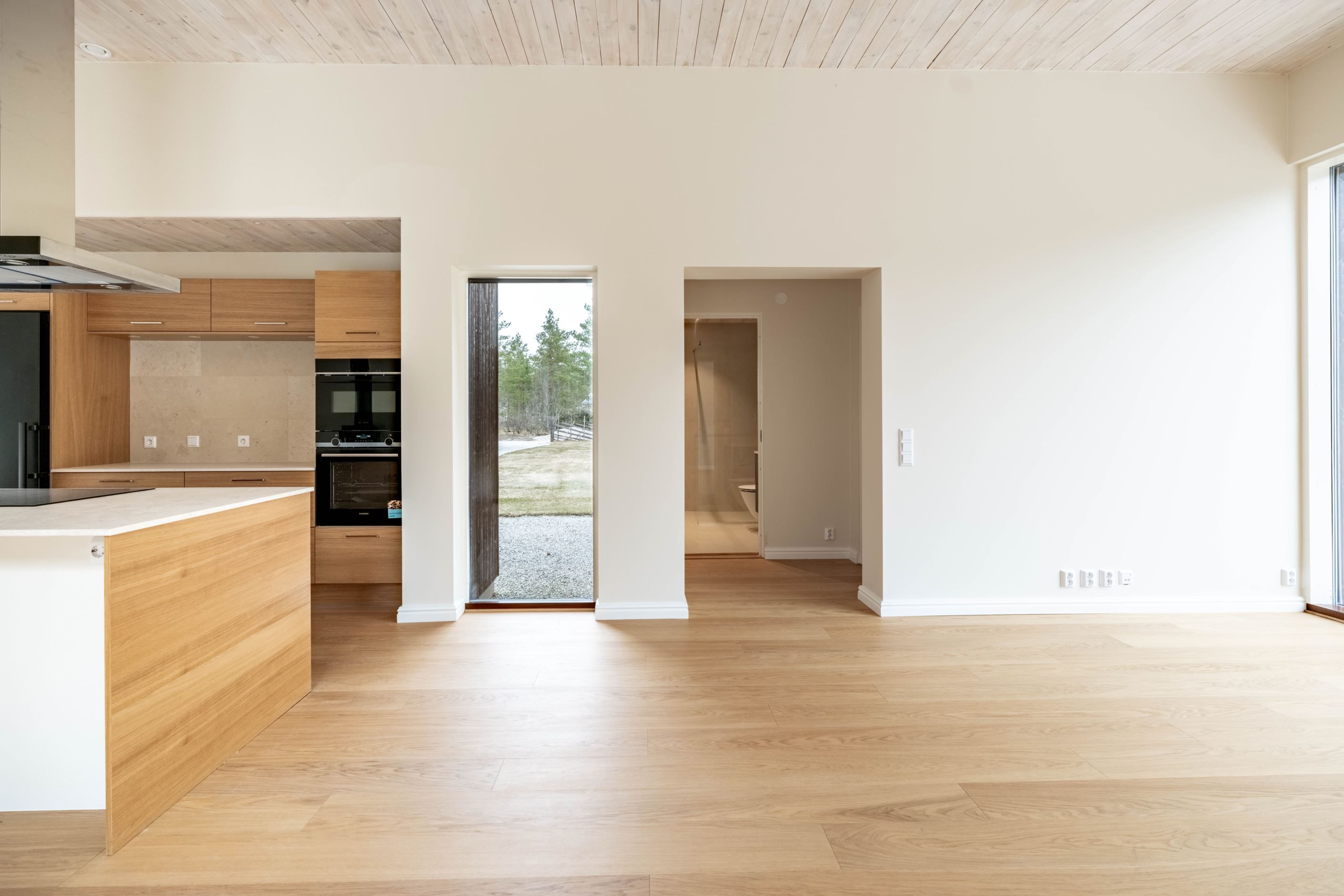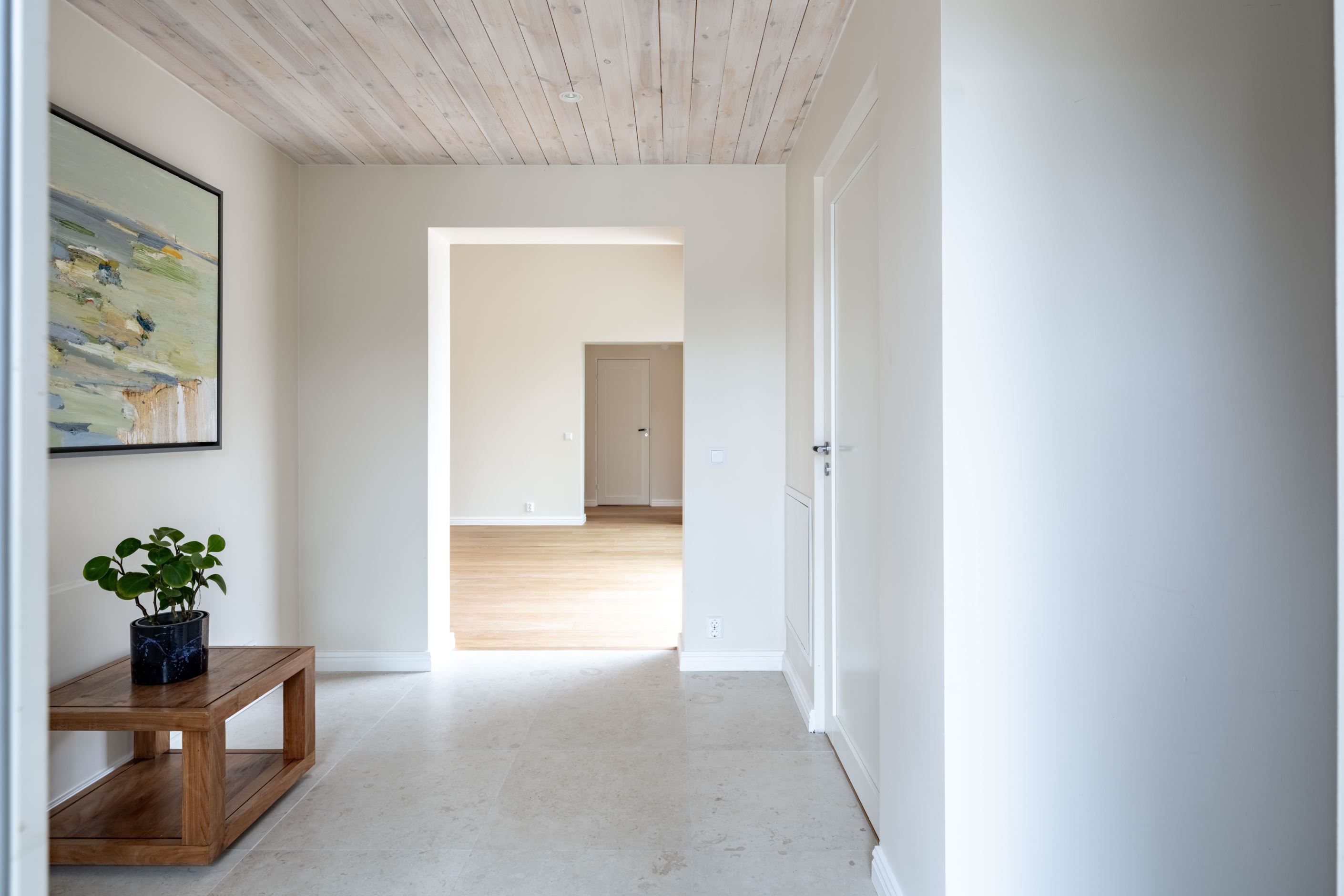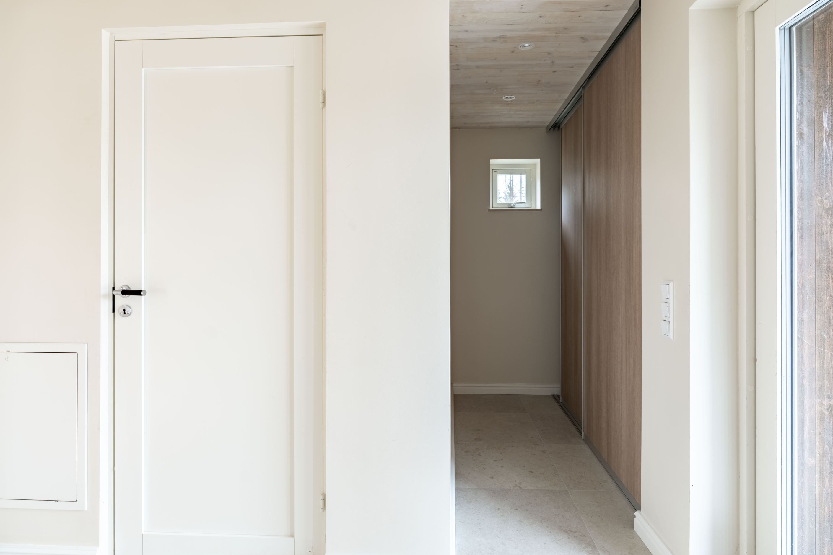 Huset består av tre rejäla sovrum och två badrum med dusch samt en inbjudande stor hall med gott om förvaring bakom vackra skjutdörrar. Ljuset i