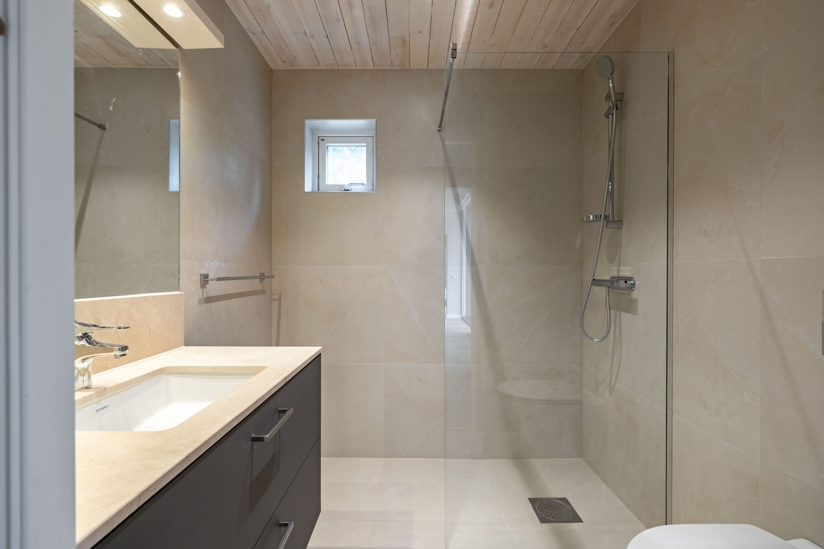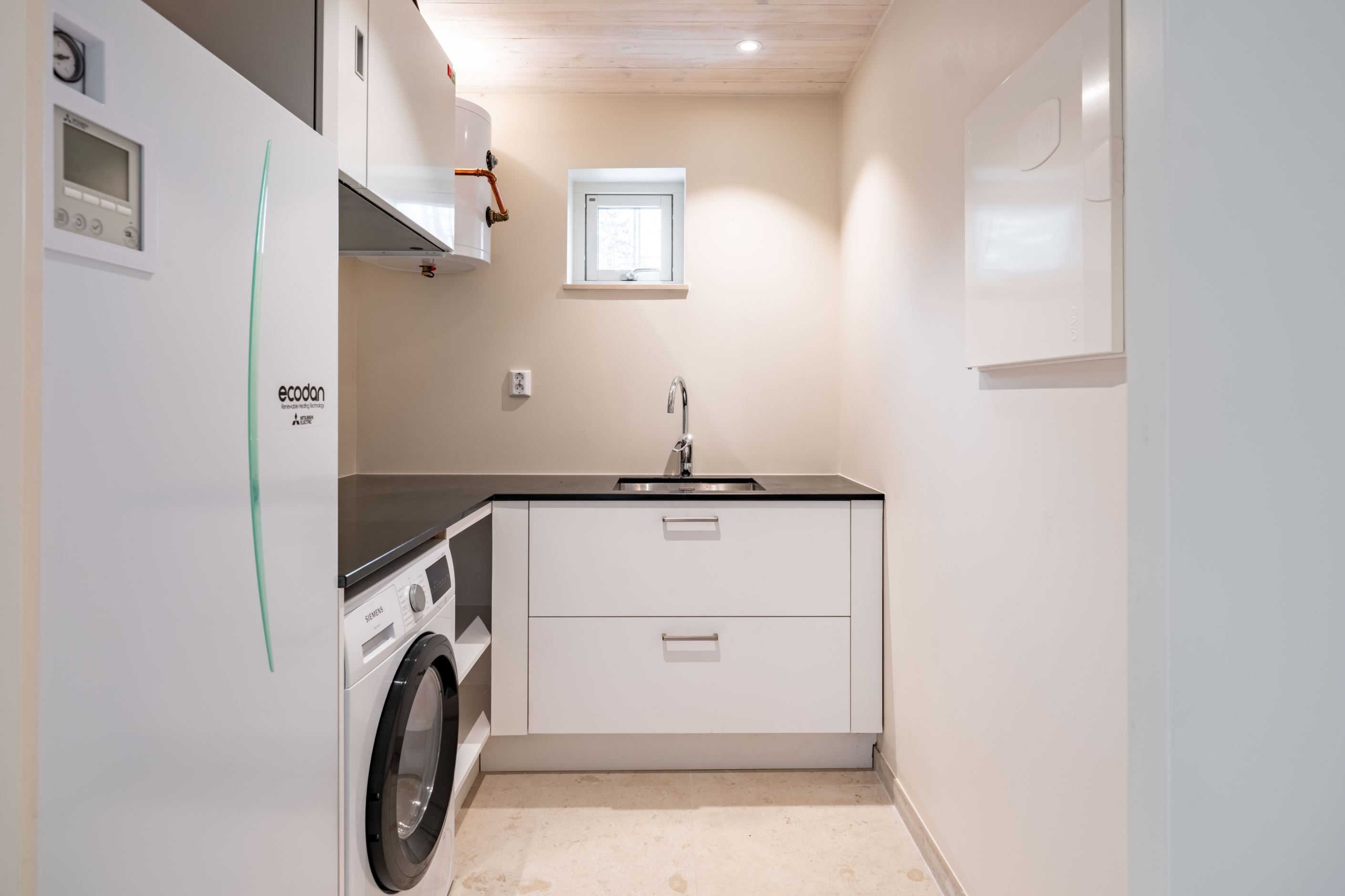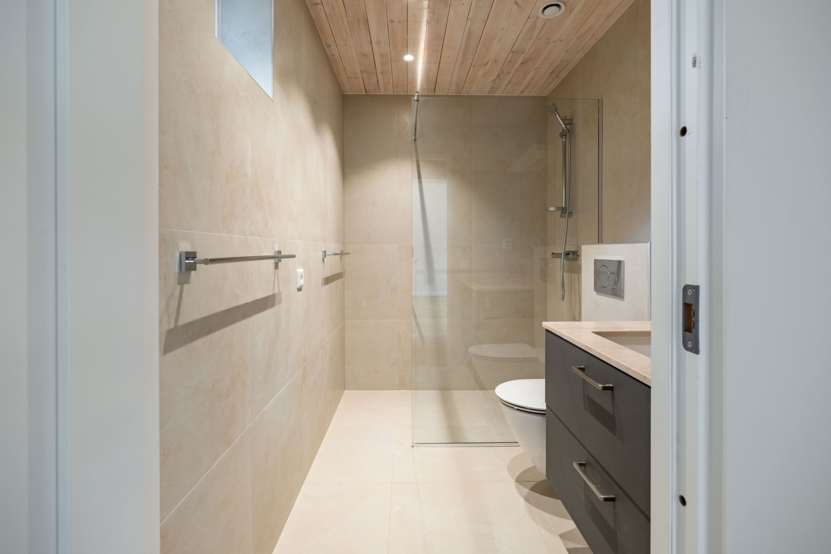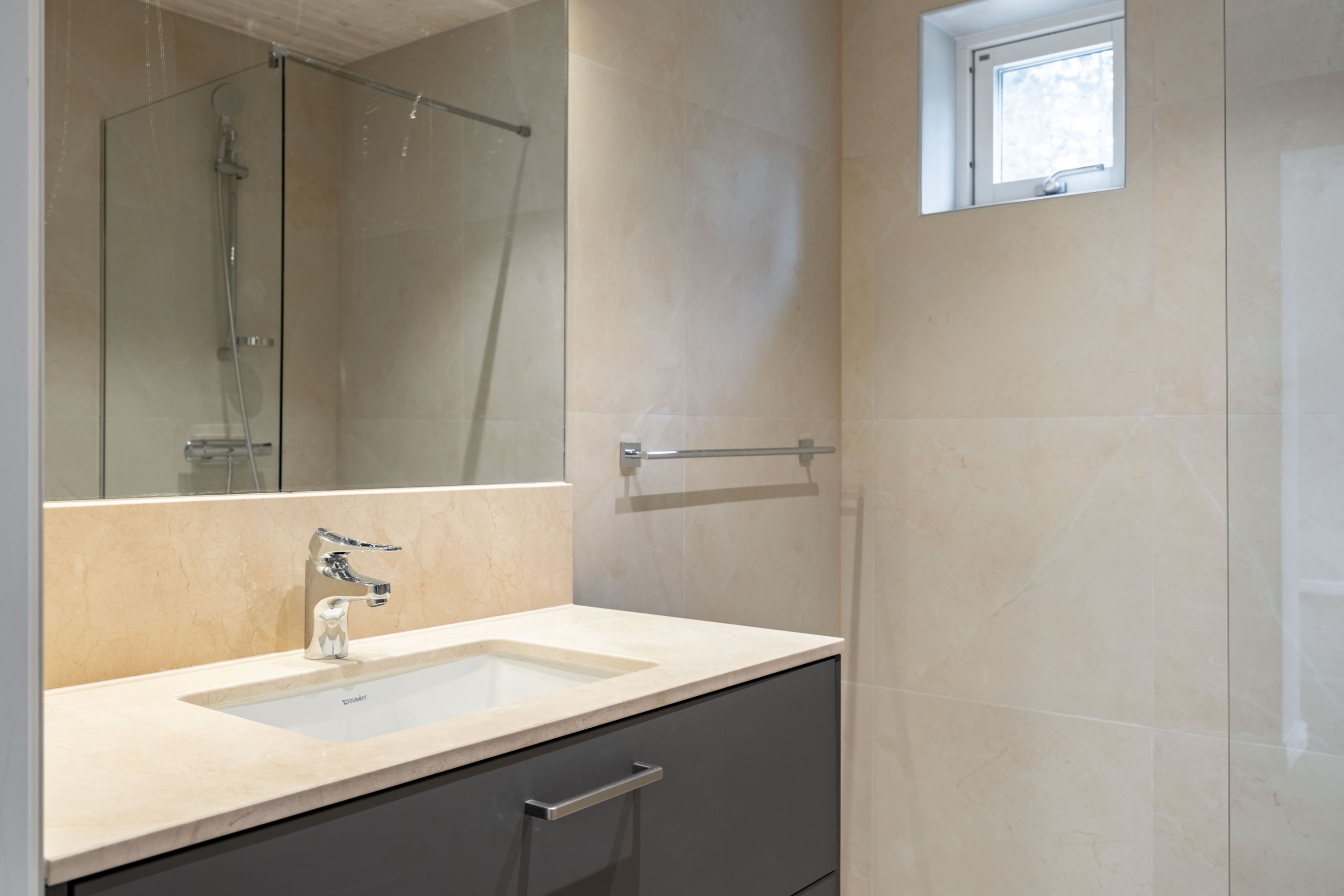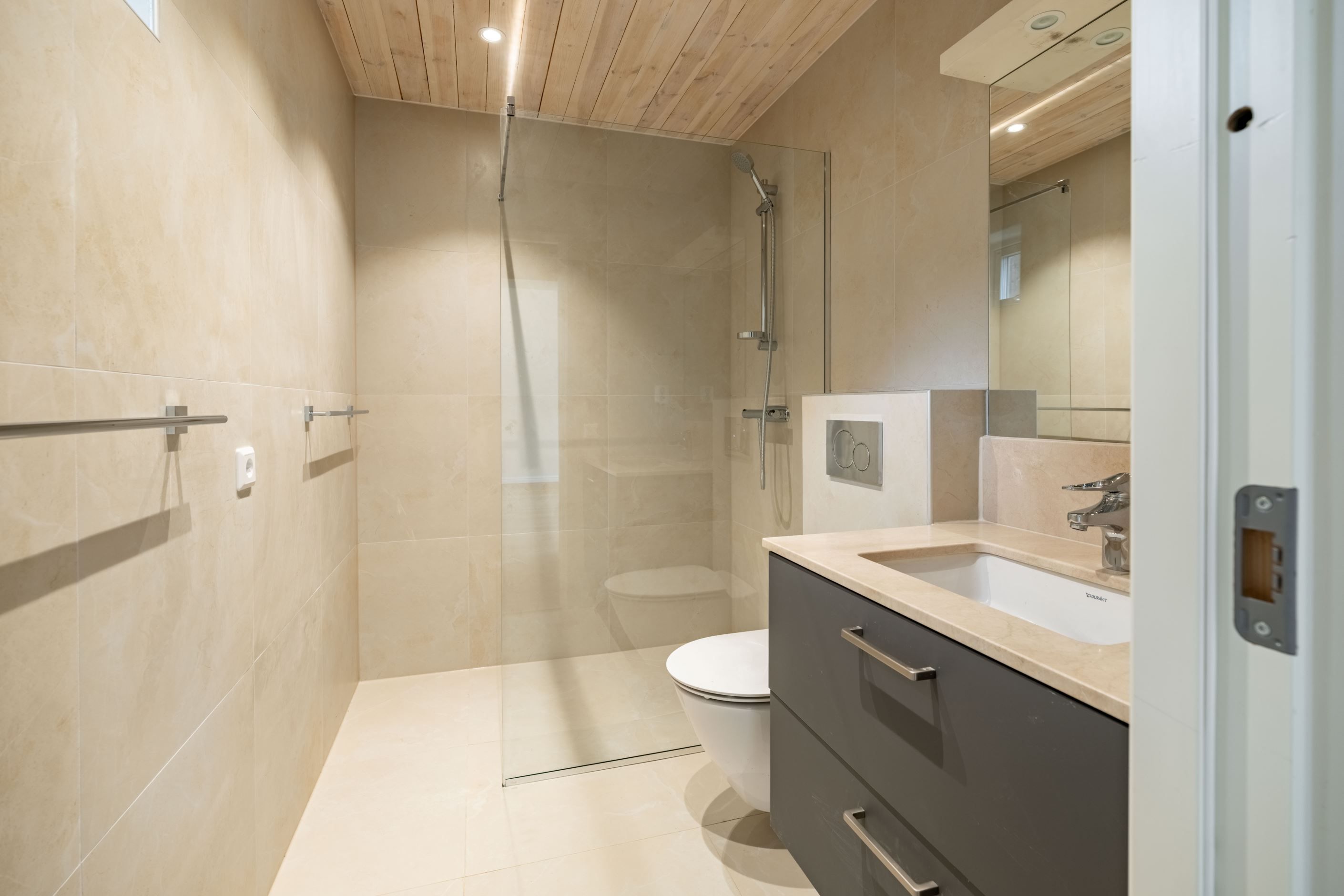 Huset består av tre rejäla sovrum och två badrum med dusch samt en inbjudande stor hall med gott om förvaring bakom vackra skjutdörrar. Ljuset i