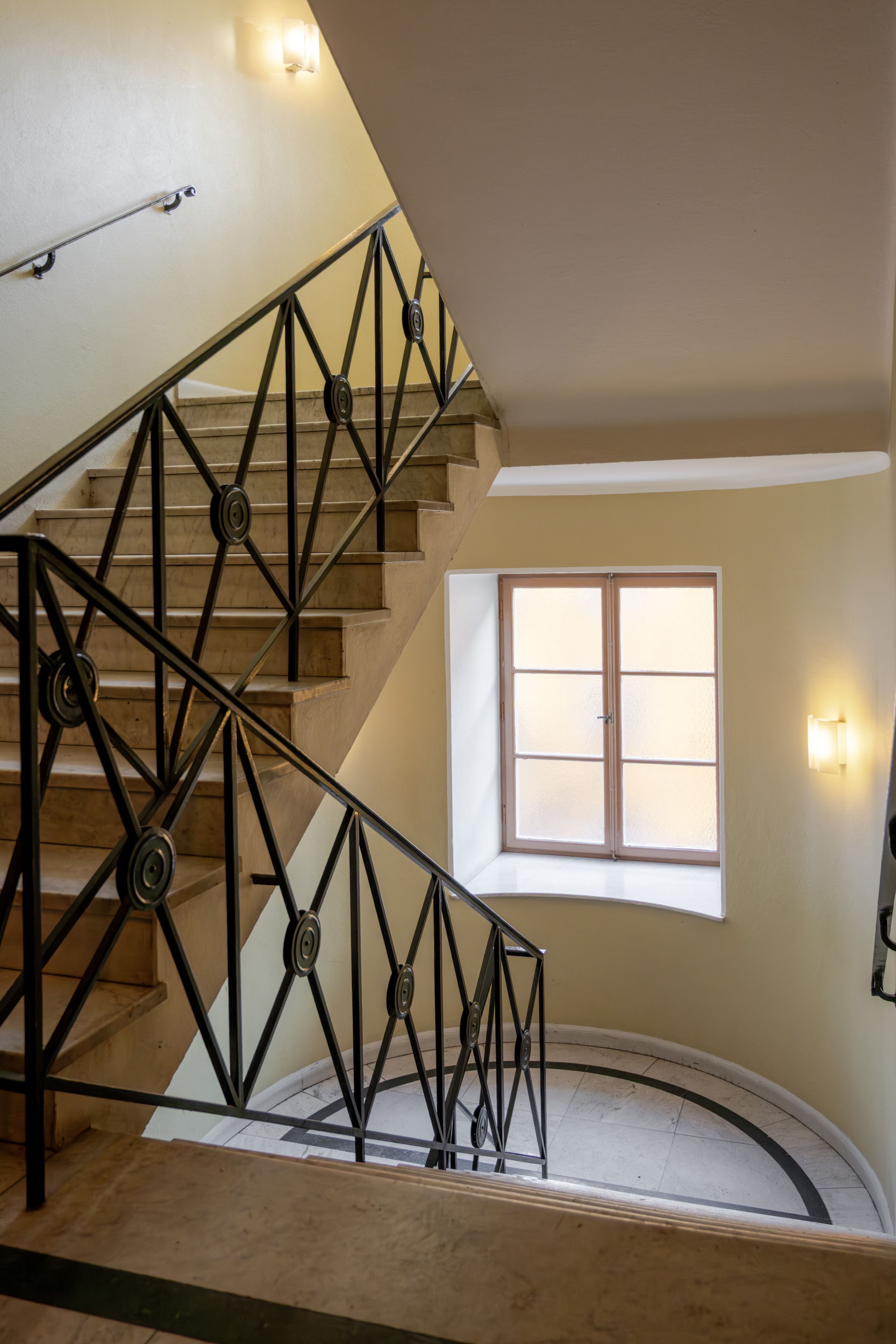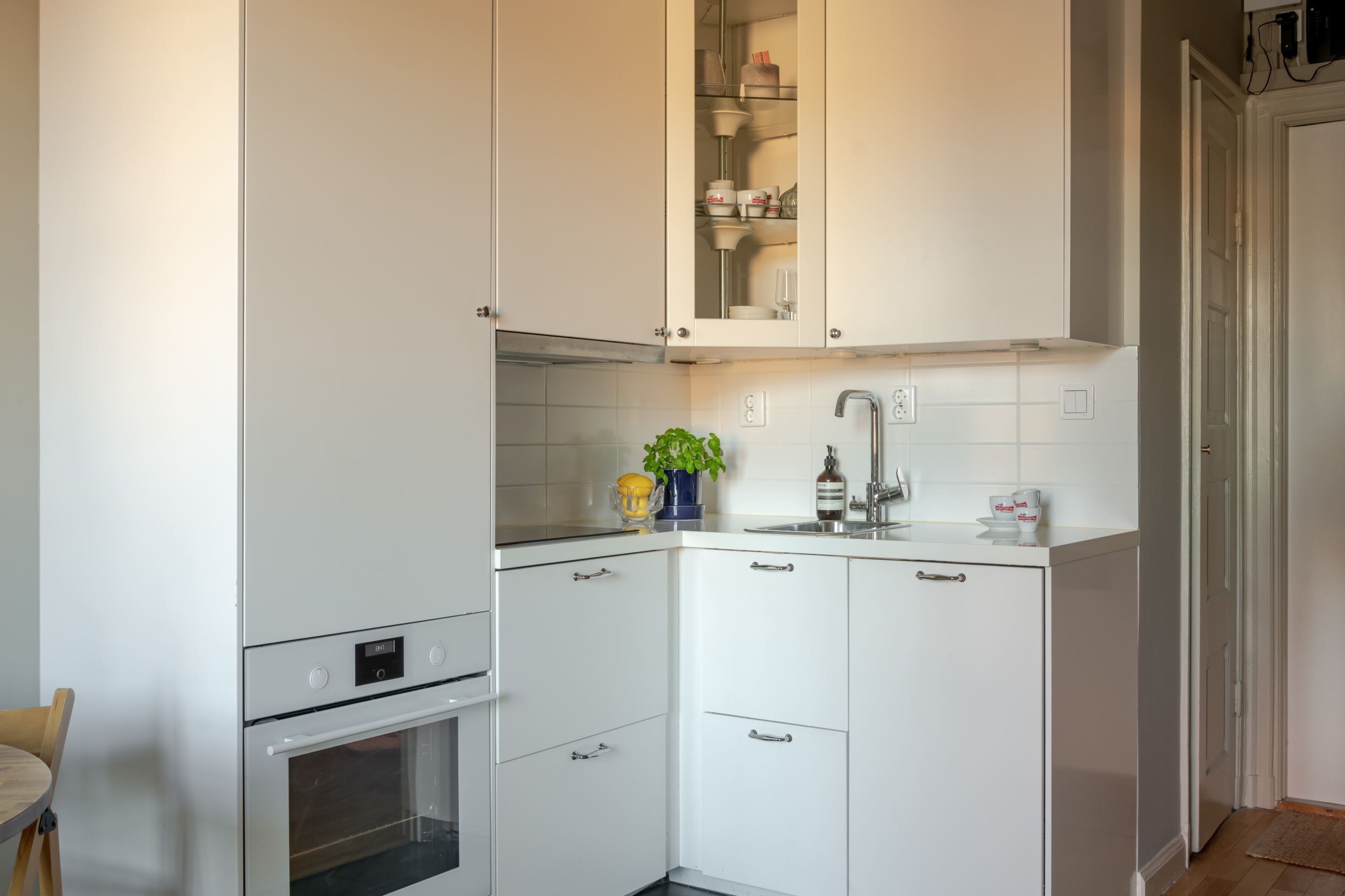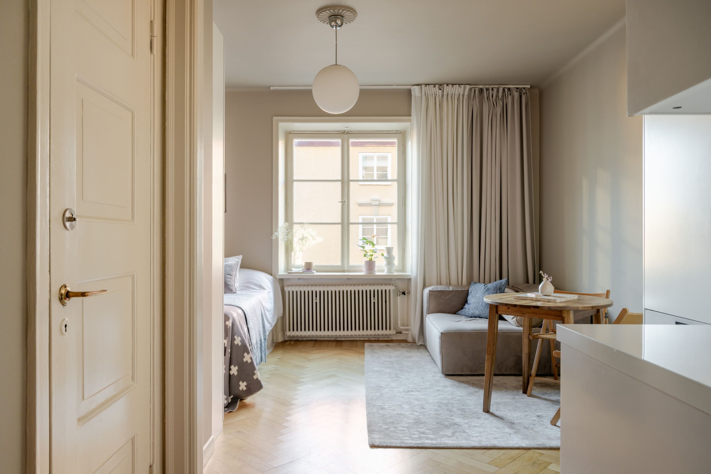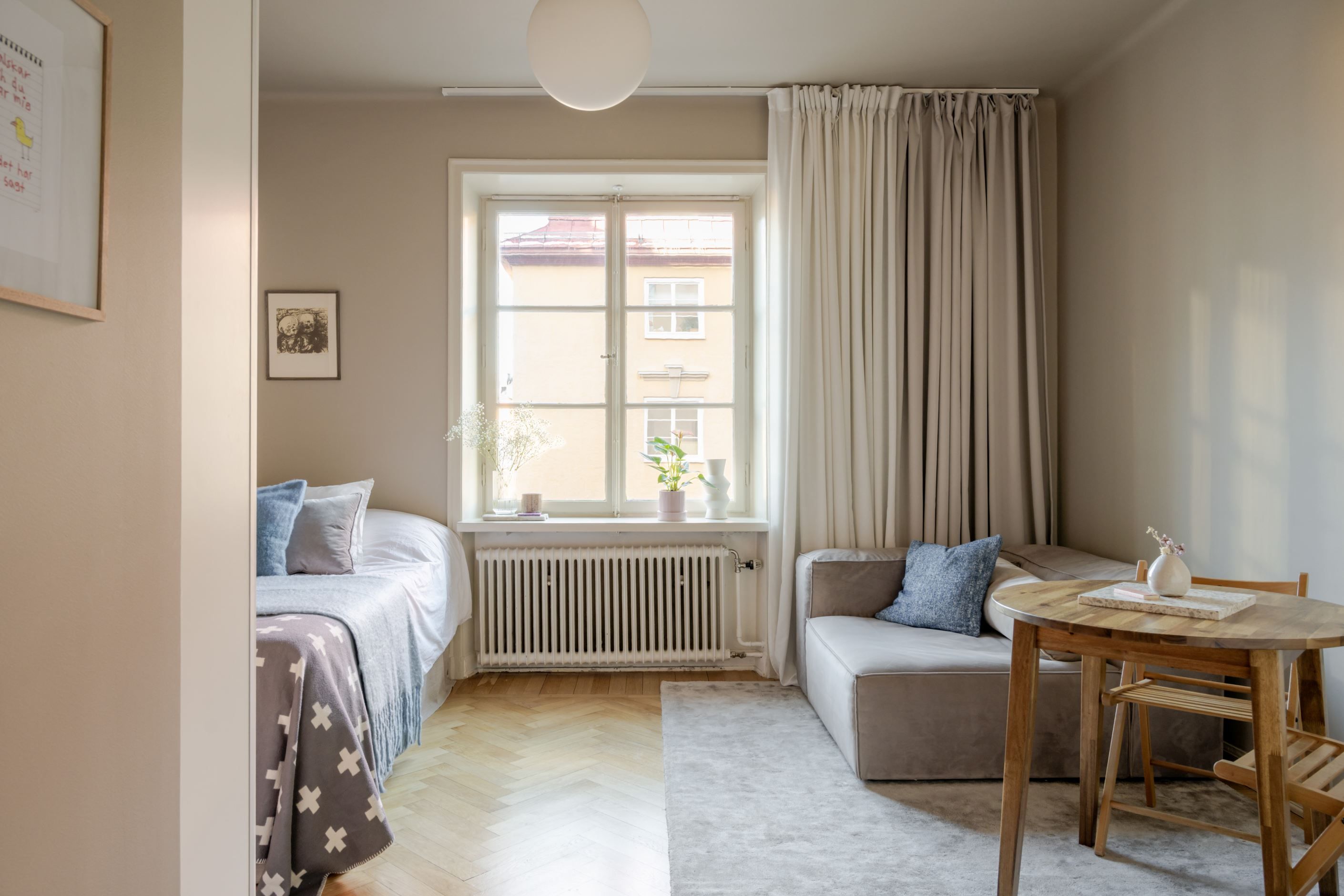 Lägenheten är belägen högt upp i huset och bjuder på en charmig utsikt över vackra kulturbyggnader, vilket skapar både rymd och en rofylld atmosfär mitt i stadspulsen. Det stora spröjsade fönstret släpper in rikligt med ljus och tillsammans med den vackra fiskbensparketten förstärks den tidstypiska 20-talskaraktären.