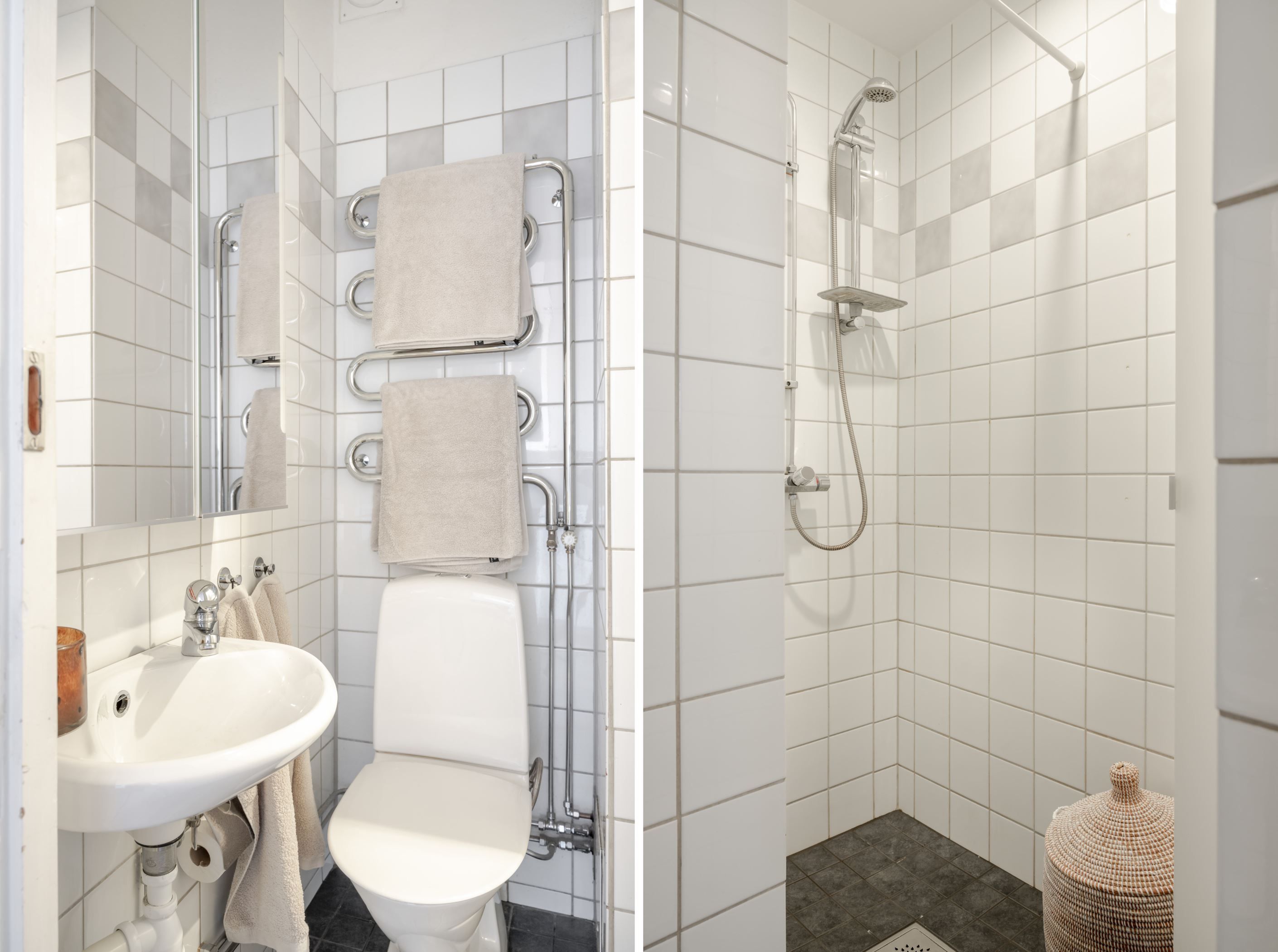 Badrummet är fräscht och utrustat med en rymlig dusch, stilrent och funktionellt.