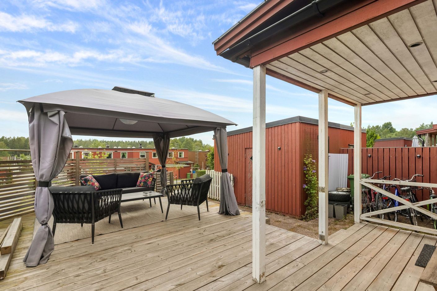 Redan vid ankomst möts du av stora altan med eftermiddaggs/&kvällssol, här finns plats för matgrupp eller loungegrupp. På husets baksida breder en privat och insynsskyddad altan ut sig, med lugn vy mot allmänning och skog.