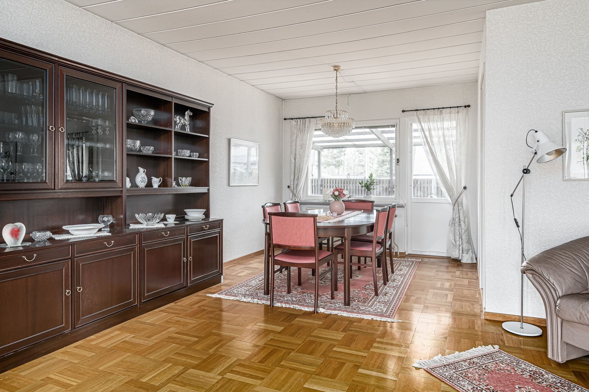 Inomhus möts du av ett ljust och luftigt vardagsrum med fint parkettgolv som ger en elegant och inbjudande känsla. Här finns gott om plats för både soffgrupp och familjehändelser. Villan erbjuder totalt fem sovrum, vilket ger gott om plats för hela familjen. I källaren hittar du en mysig gillestuga, perfekt för avkoppling eller som ett extra rum för umgänge.