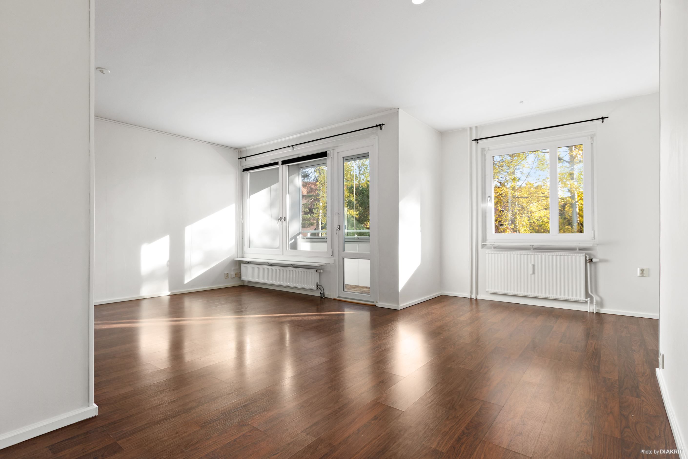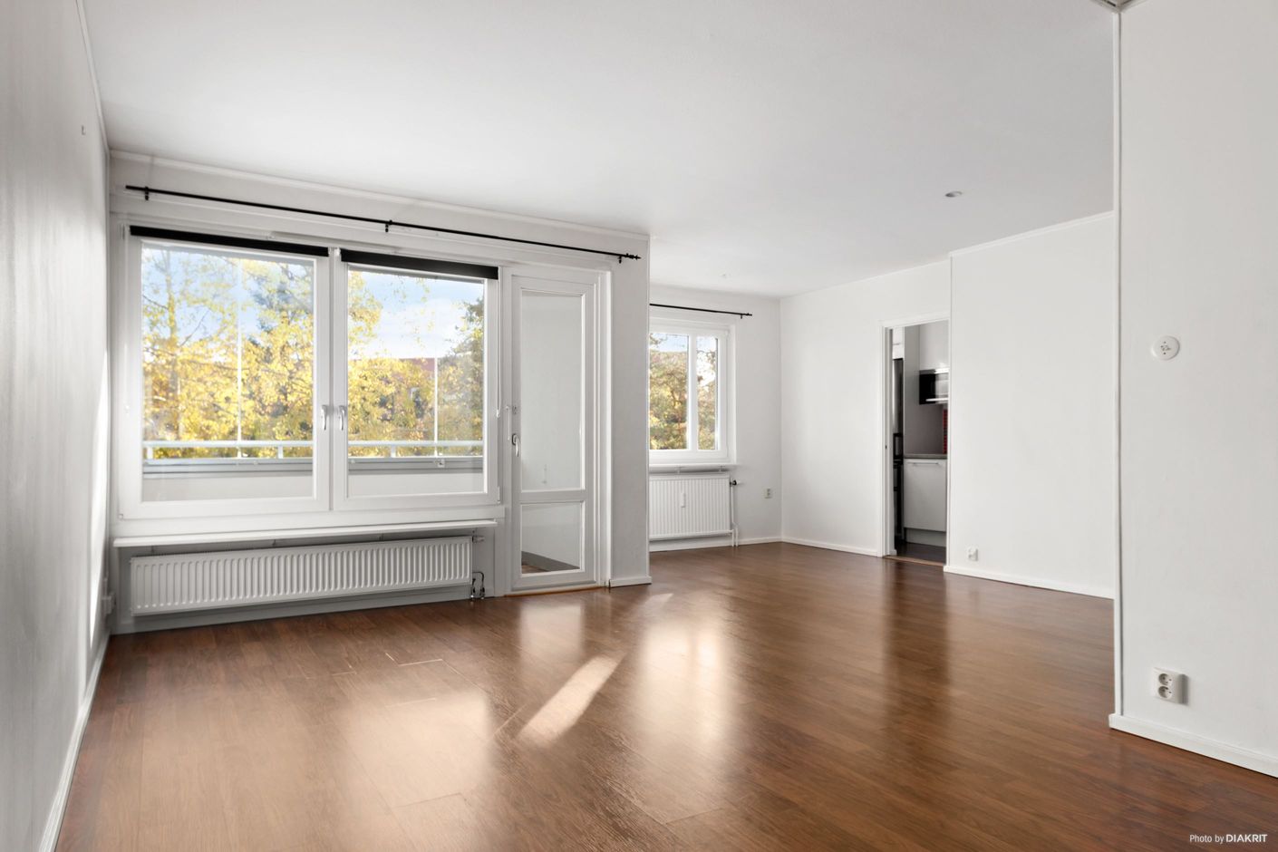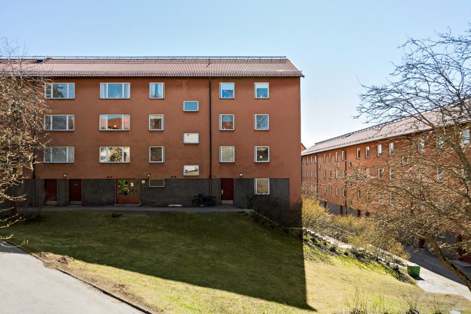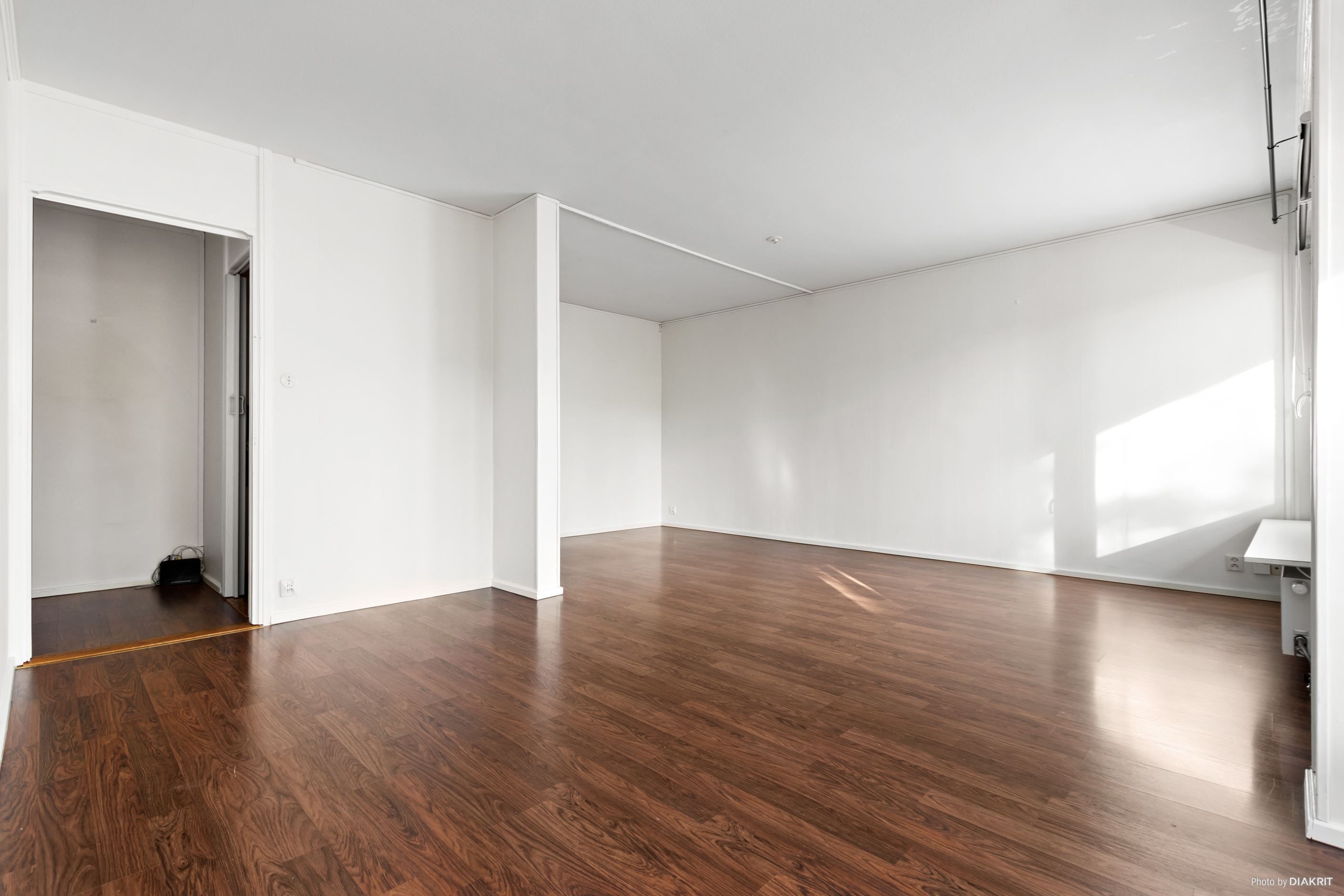 Lägenheten har ett mycket stort allrum/vardagsrum med gott om plats för soffa samt en rymlig alkov med plats för säng. Belägen vid fönster med utsikt mot innergård finns plats för matbord med plats för 4 personer.