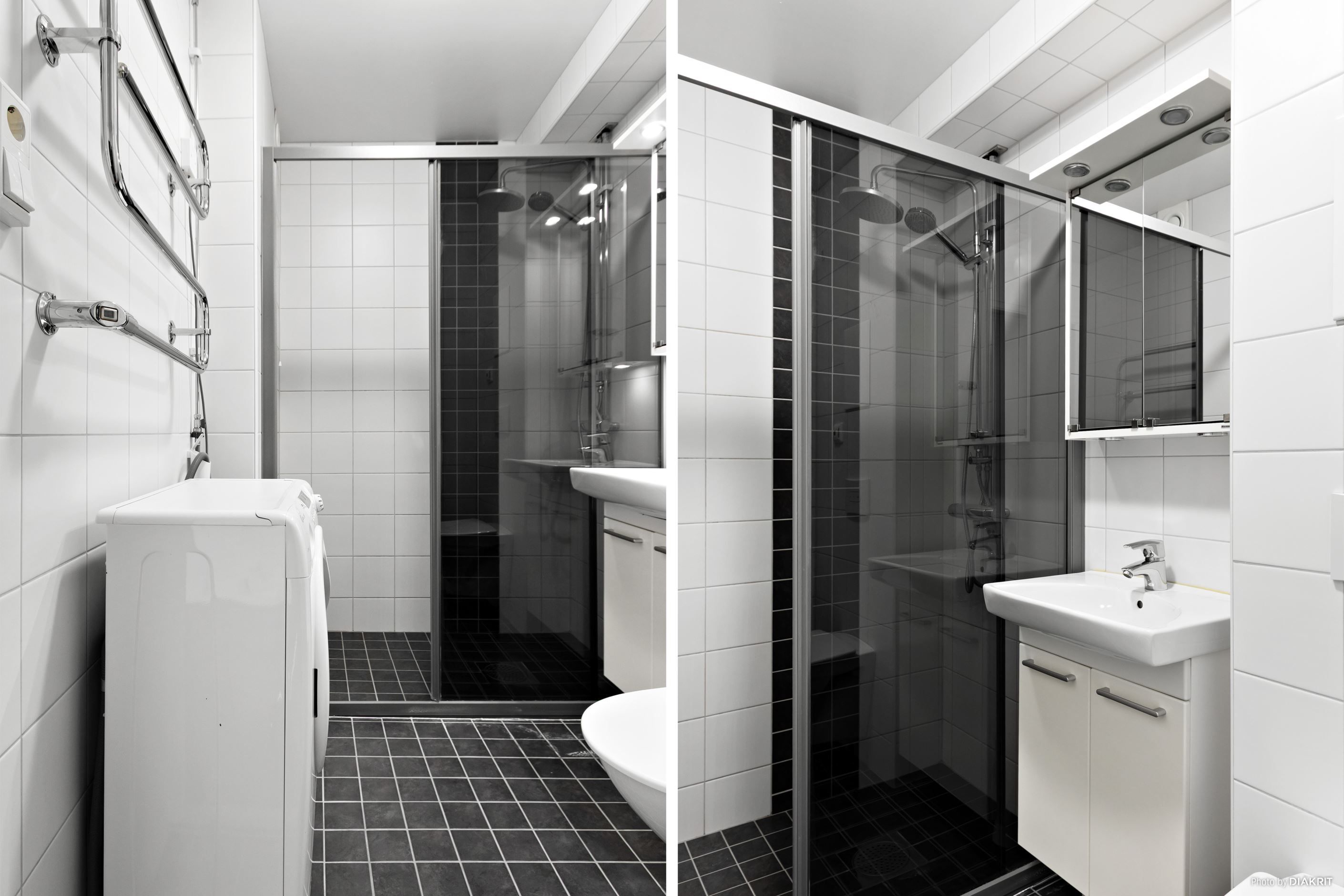 Helkaklat duschrum med ett sobert mörkt klinkergolv och vitt kakel. Här finns toalett, kommod med handfat med spegelskåp ovan, duschhörna med glasvägg och handdukstork. Här finns även en tvättmaskin.