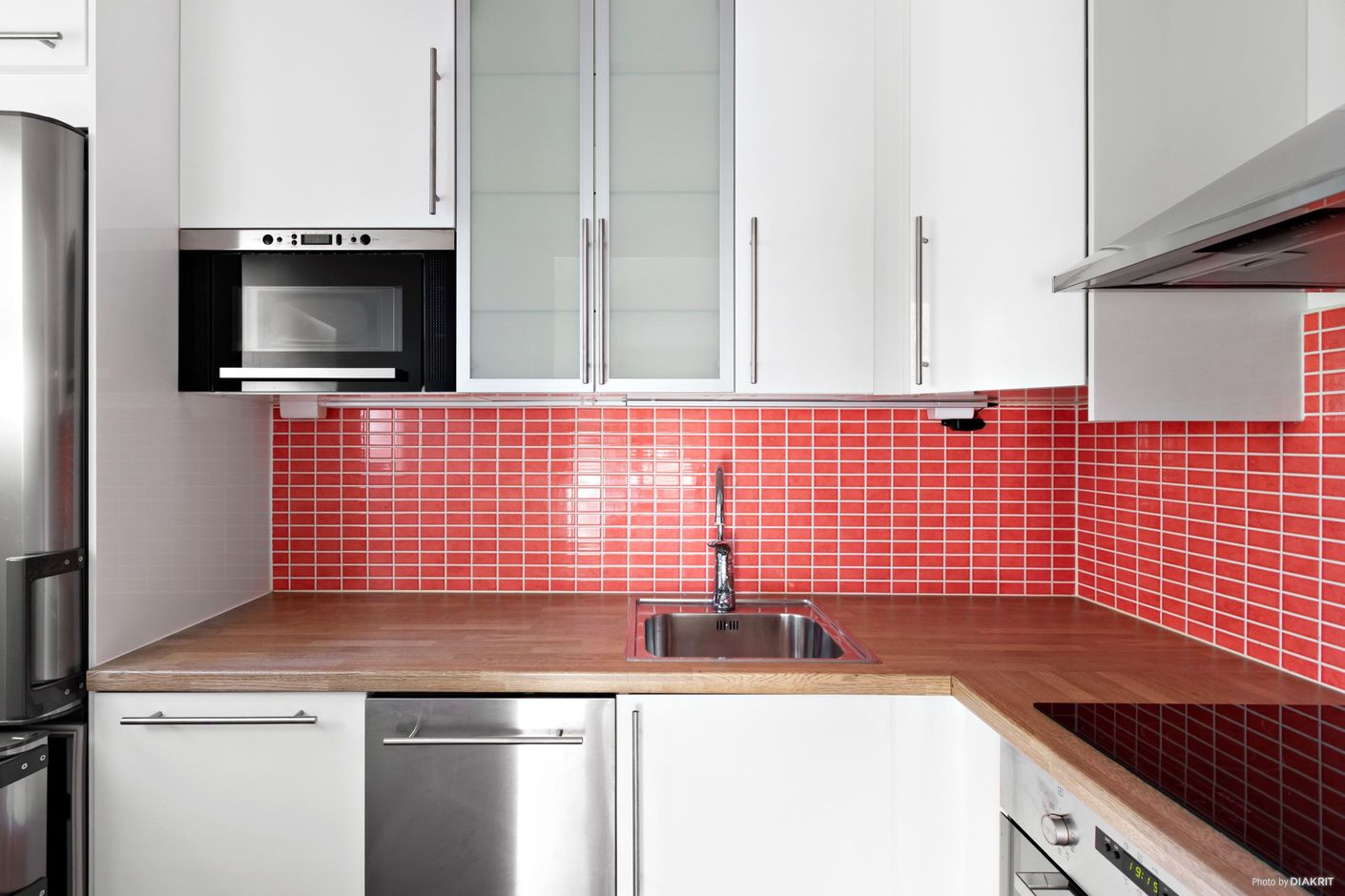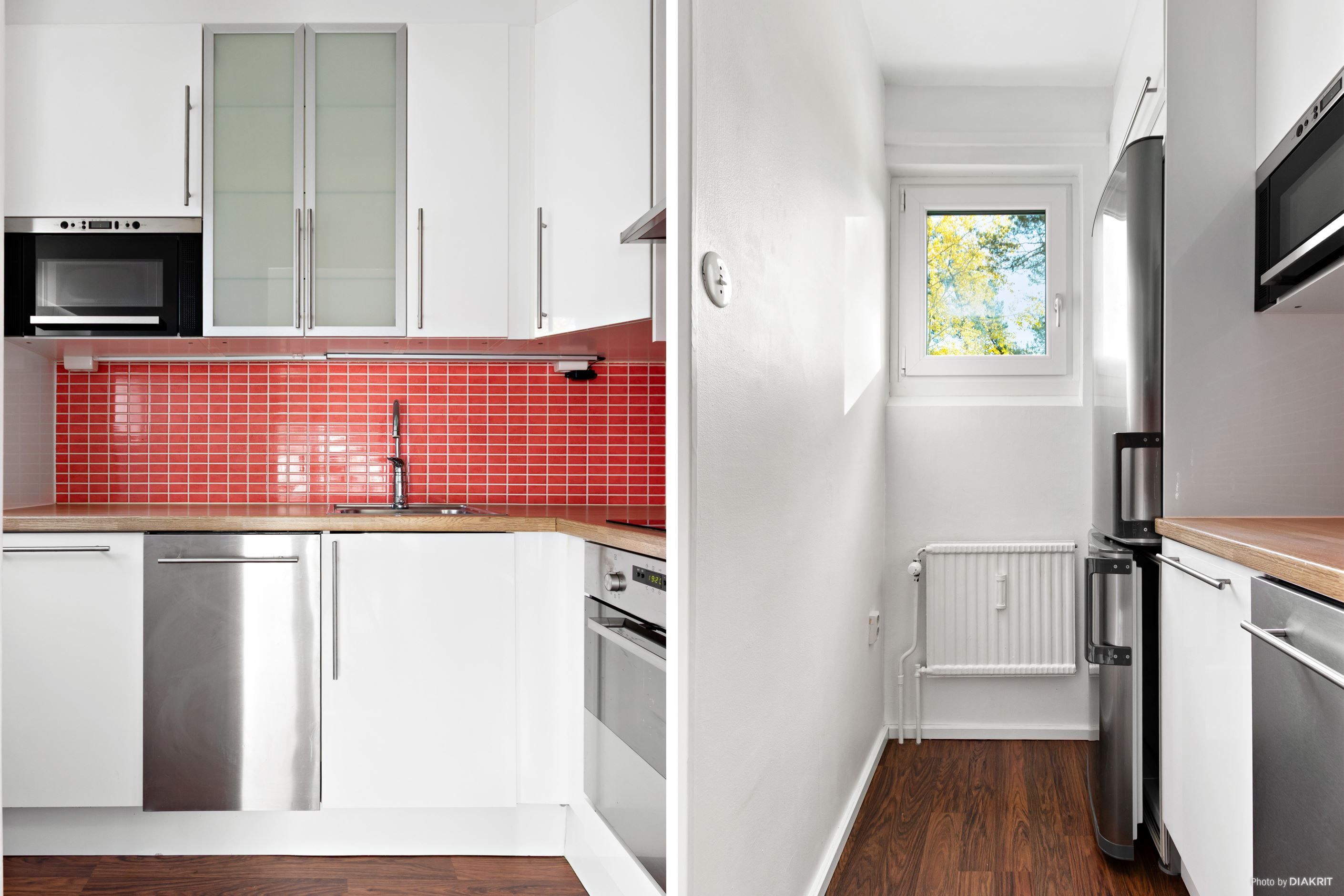Köket är totalrenoverat med ett modernt IKEA-kök med skåpluckor i högblank vit och vitrinskåp i frostat glas. Köket har gott om förvaring i högskåp, överskåp och praktiska lådor med mjuk stängning. Bra arbetsyta på bänskiva i eklaminat med diskho. Mellan bänskiva och överskåp sitter elegant, röd kakelmosaik. Köket har moderna vitvaror från med kyl/frys, inbyggd rostfri varmluftsugn, inbyggd rostfri mikrovågsugn, diskmaskin, induktionshäll och rostfri kolfilterfläkt.
