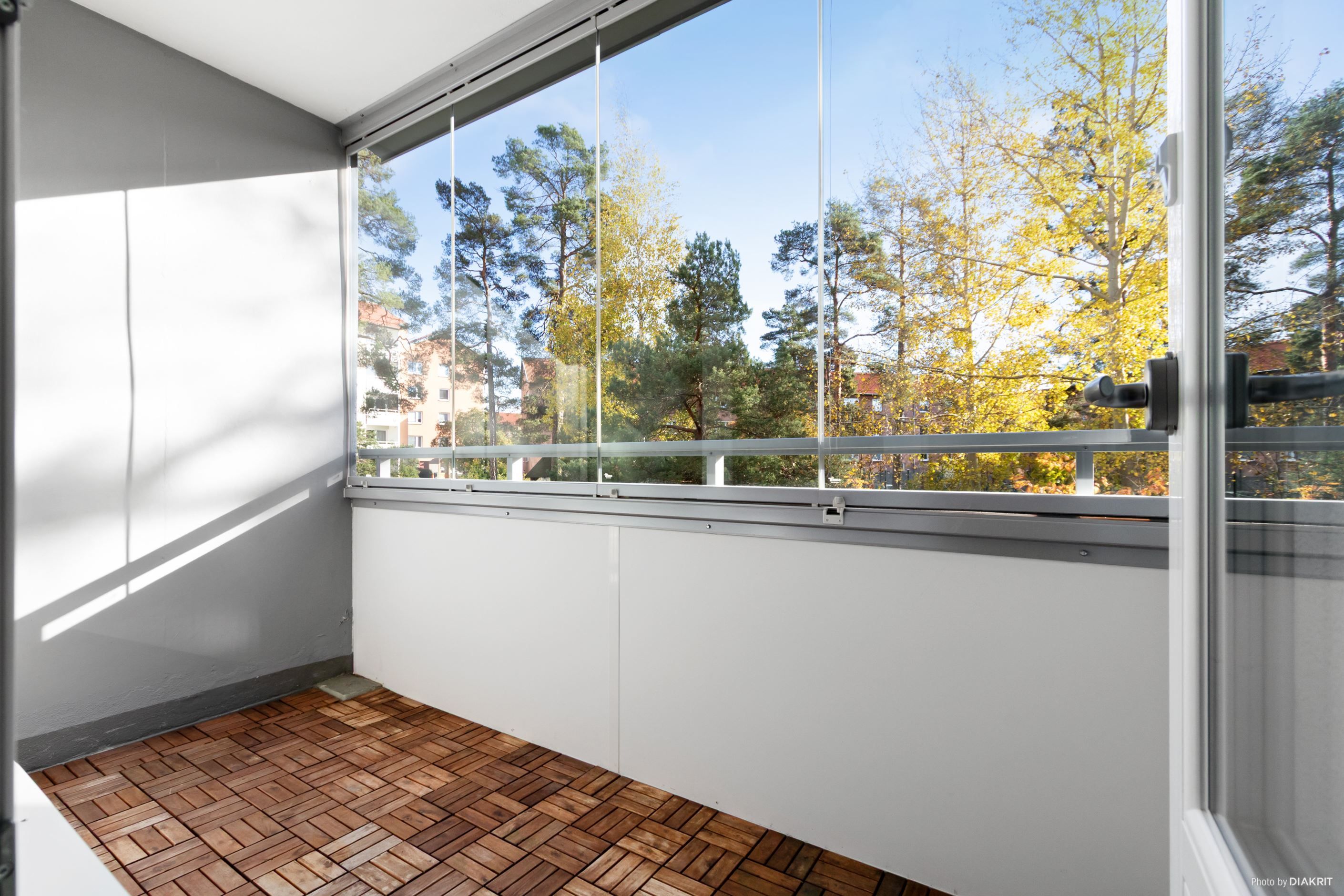 Stor inglasad och trädäckad balkong med plats för utemöbler. Det kan eventuellt gå att bygga en uteplats/altan i framtiden, men tillstånd och bygglov måste sökas hos föreningen och kommunen.