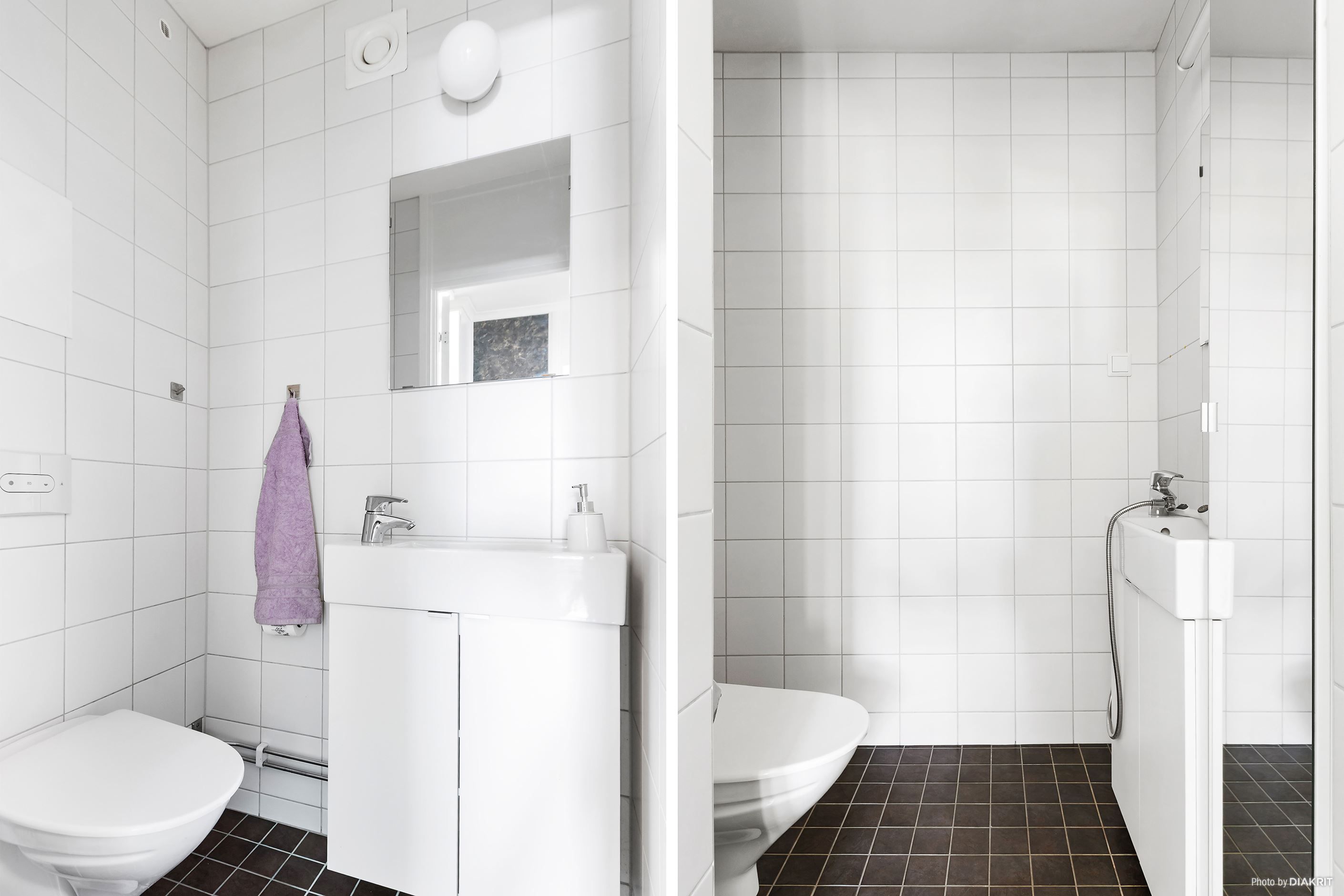 Wc/duschrum renoverat vid föreningens stambyte med mörkgrå/svart klinker och vita kaklade väggar. I badrumsdelen finns en duschhörna med glasvägg, kommod med handfat och spegelskåp med spotlightbelysning. Här finns även en tvättmaskin. I badrumsdelen finns även ett öppningsbart fönster.
